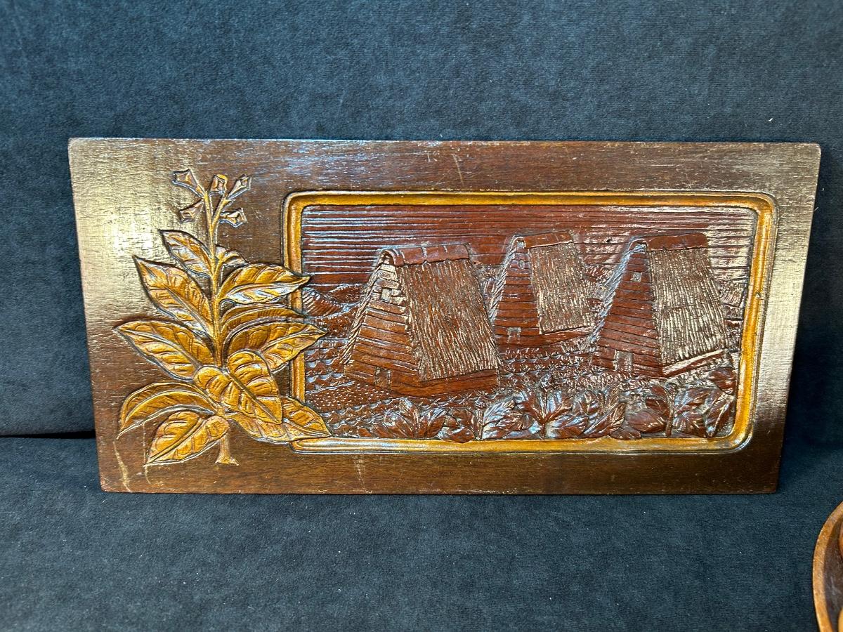 Two carved wooden wall hangings 15" x 8"