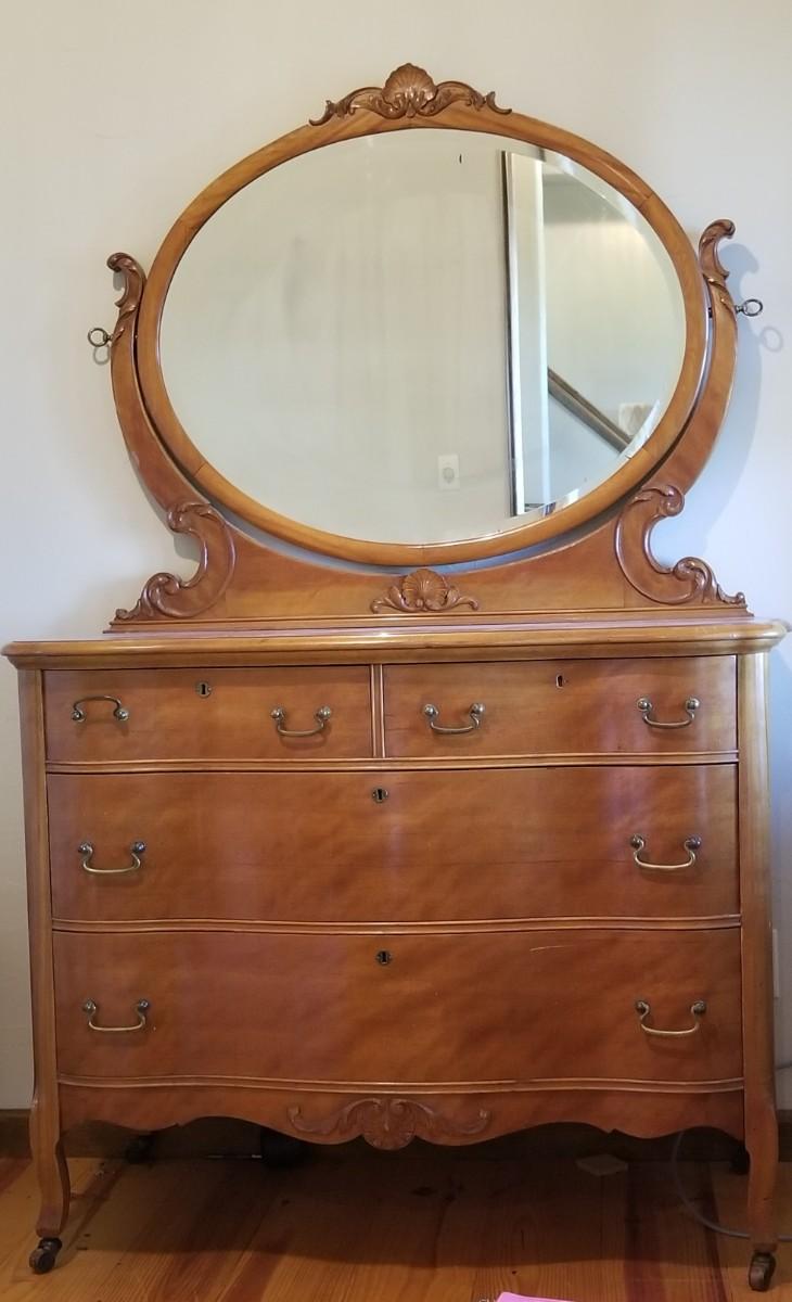 Lot 200: Antique Victorian Tiger Oak Dresser with Mirror and Casters