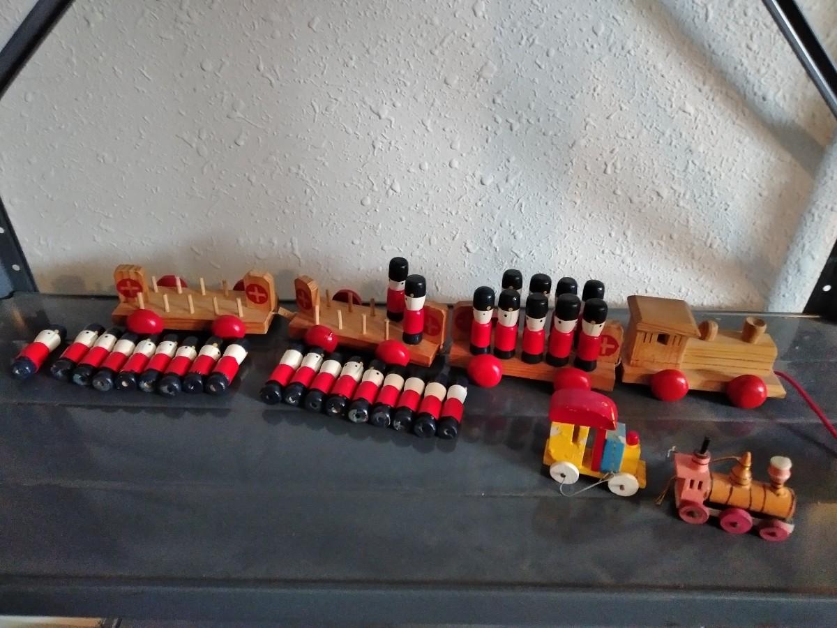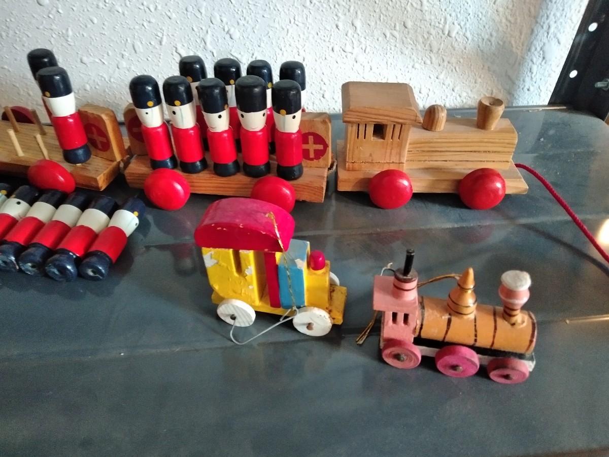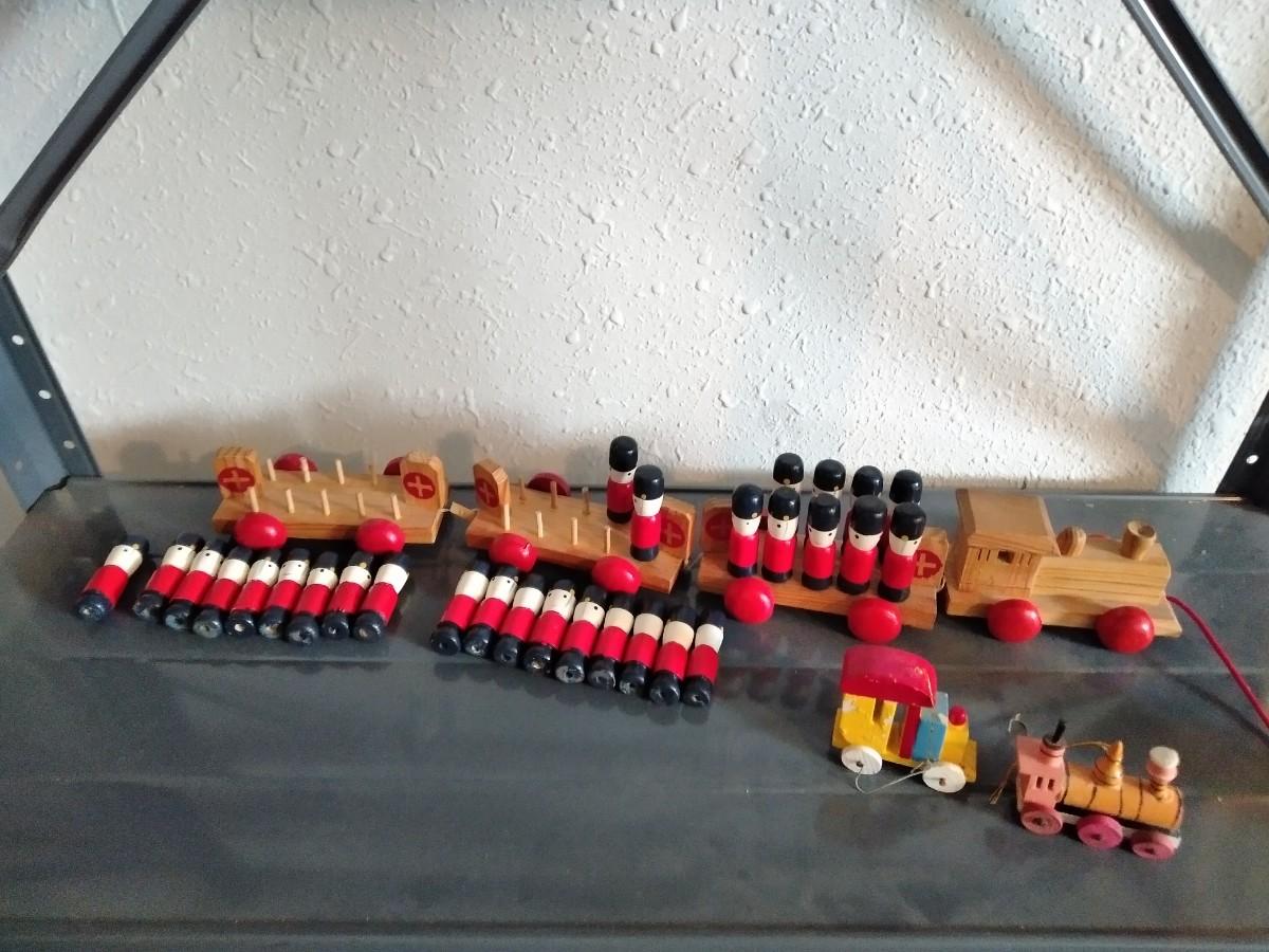 WOODEN TRAIN CARRYING MANY SOLDIERS ON WOODEN PINS. THREE TRAIN CARS! TWO ADDITIONAL WOOD TRAIN ENGINES