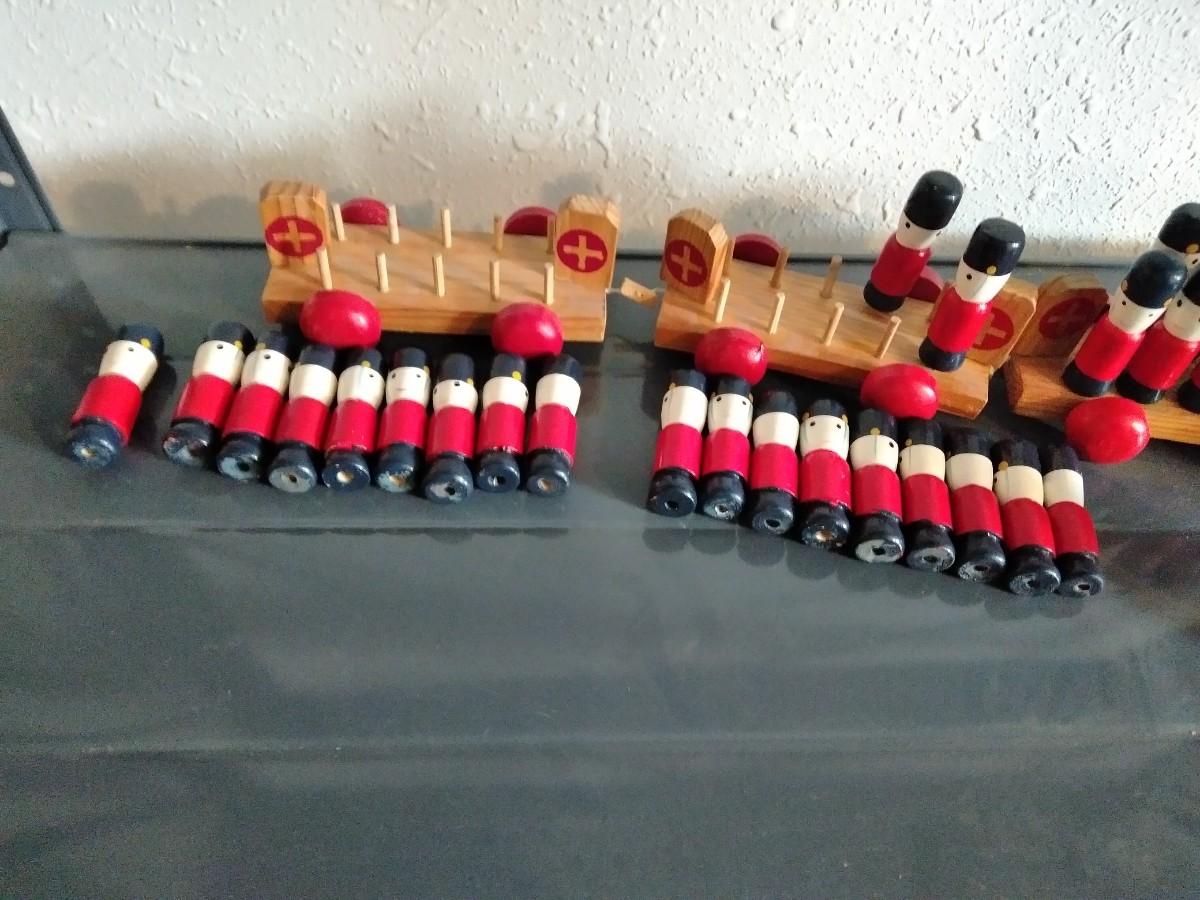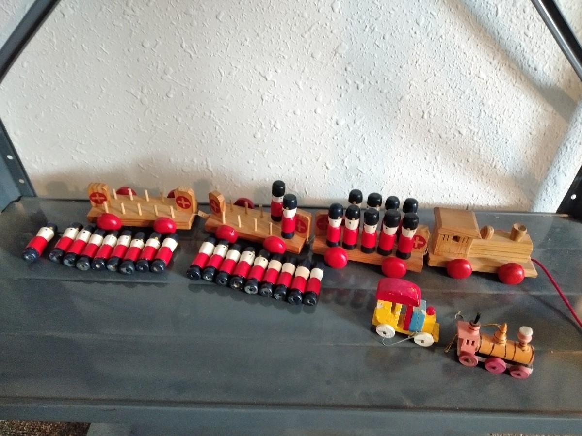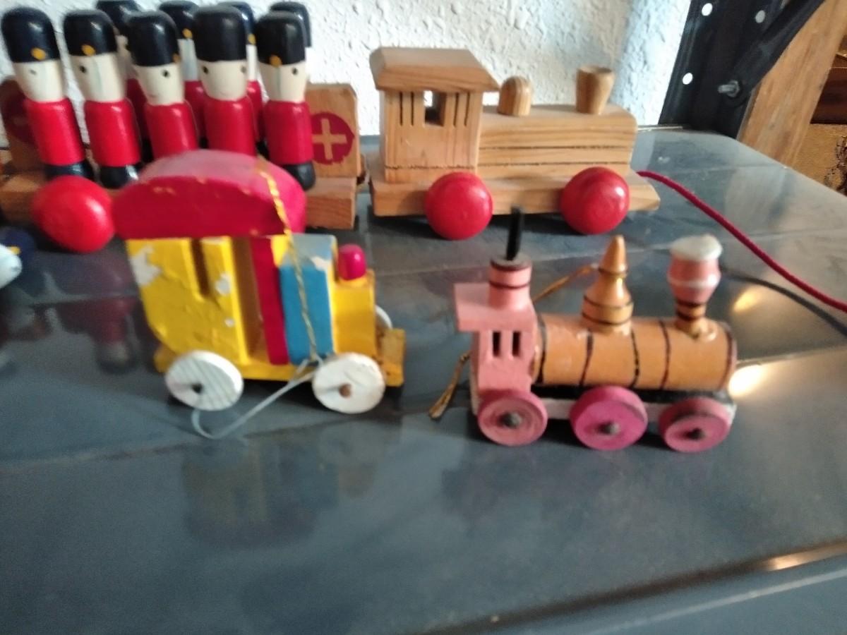 WOODEN TRAIN CARRYING MANY SOLDIERS ON WOODEN PINS. THREE TRAIN CARS! TWO ADDITIONAL WOOD TRAIN ENGINES
