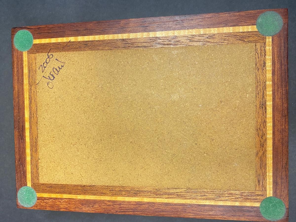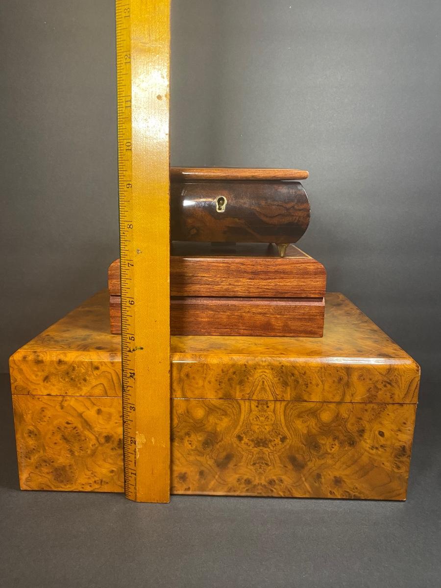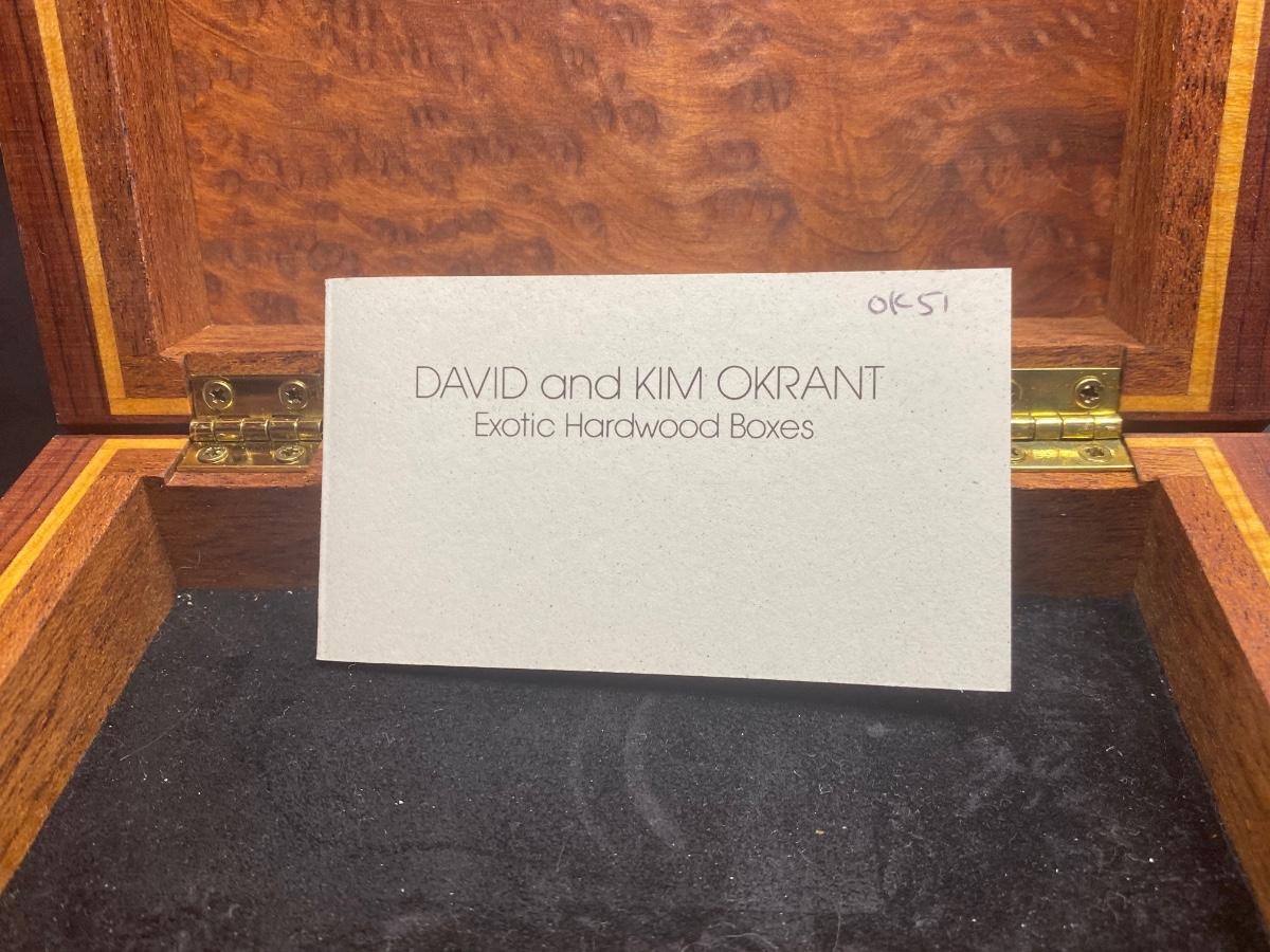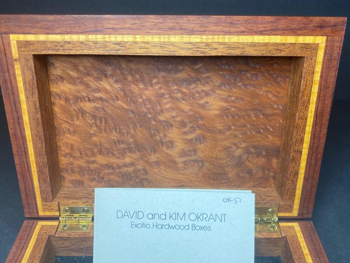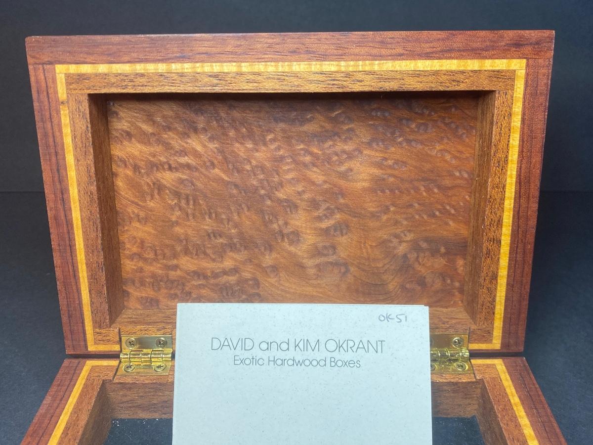 Handmade exotic hardwood art box by David and Kim Okrant, large wood box most likely a vintage humidor without the gage or can be used as a gentlemen's box, and a music box. Please see all pictures as they are the best representation of the items. The pictures show condition, measurements if taken, and what is included in the lot. Due to the large amount that we photograph and the time frame, we are not always able to take measurements. All items unless noted, are pre-owned and have been used. If you purchased furniture, you must bring help. We do not allow one person to carry large furniture out on their own. Bring help, tools and a truck for the safety of our client’s homes, and your personal safety. Company policy. Thank you.