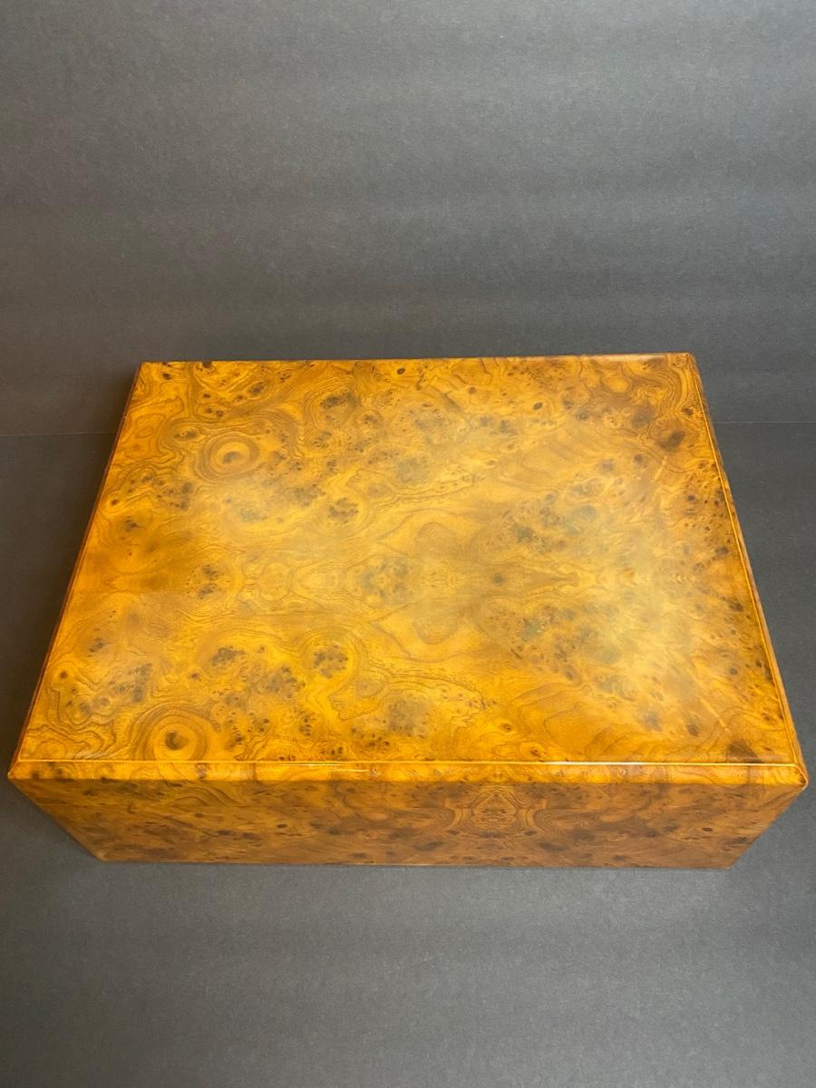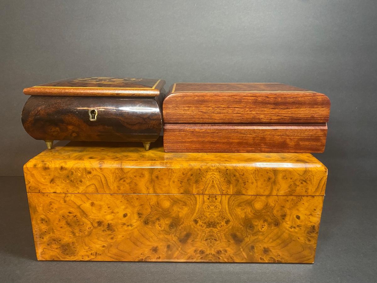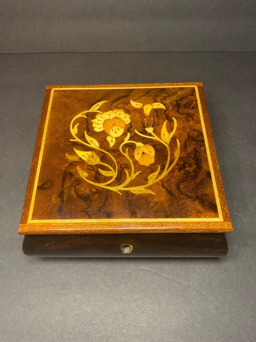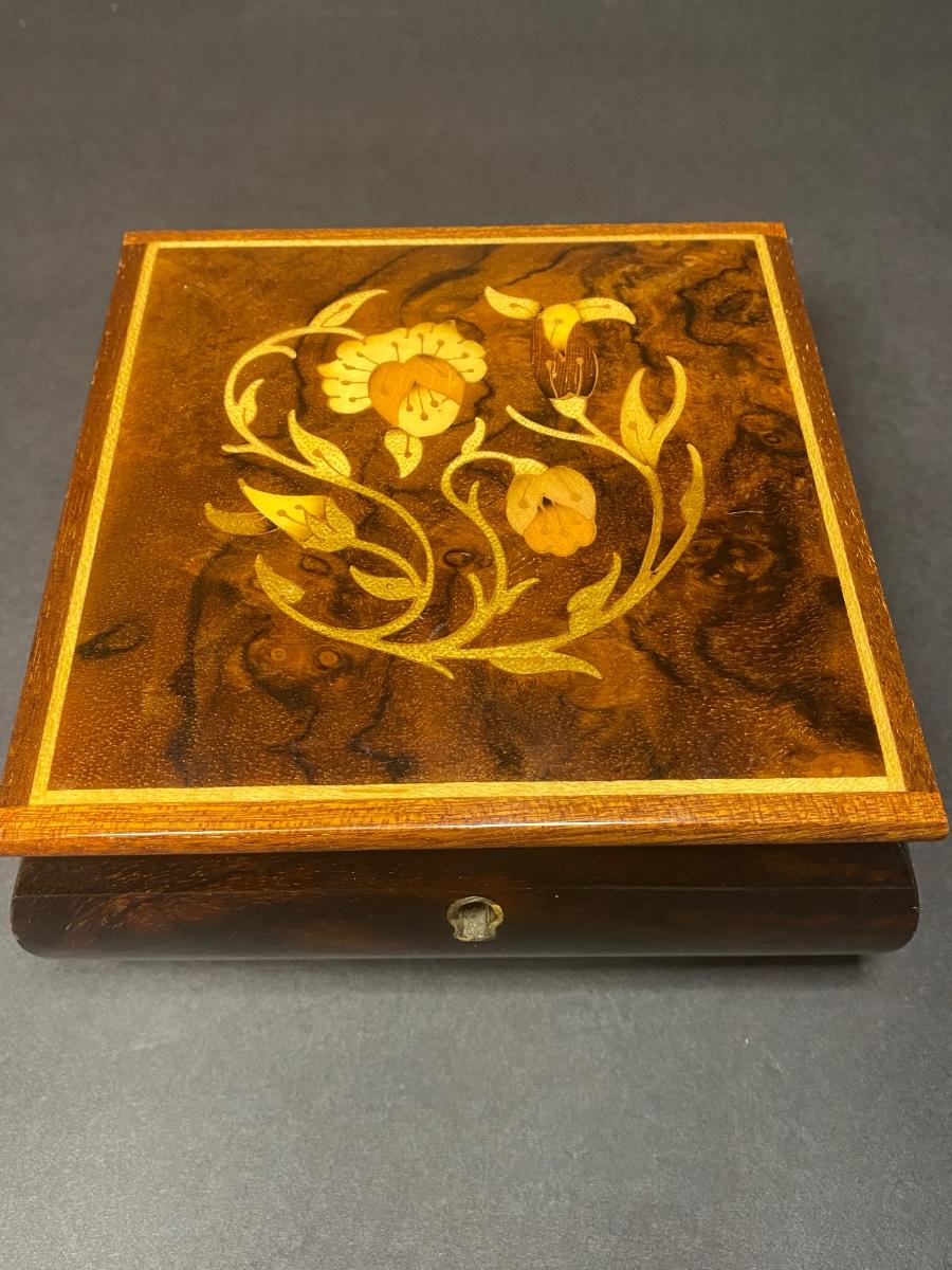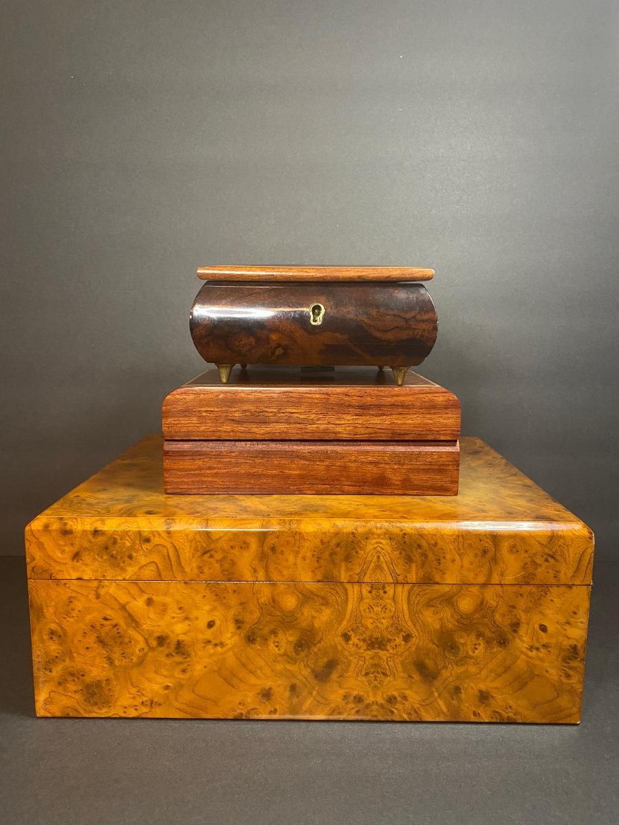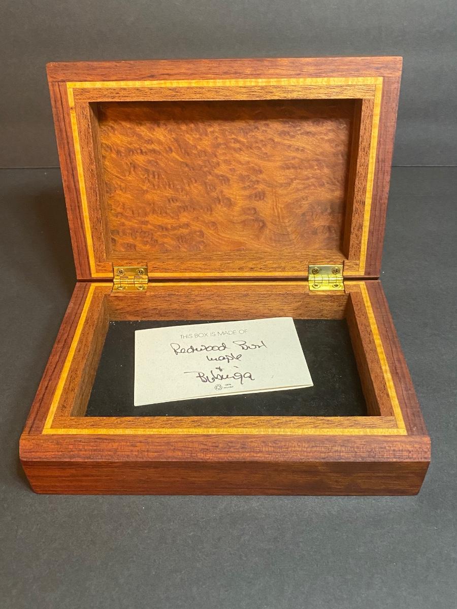 Handmade exotic hardwood art box by David and Kim Okrant, large wood box most likely a vintage humidor without the gage or can be used as a gentlemen's box, and a music box. Please see all pictures as they are the best representation of the items. The pictures show condition, measurements if taken, and what is included in the lot. Due to the large amount that we photograph and the time frame, we are not always able to take measurements. All items unless noted, are pre-owned and have been used. If you purchased furniture, you must bring help. We do not allow one person to carry large furniture out on their own. Bring help, tools and a truck for the safety of our client’s homes, and your personal safety. Company policy. Thank you.