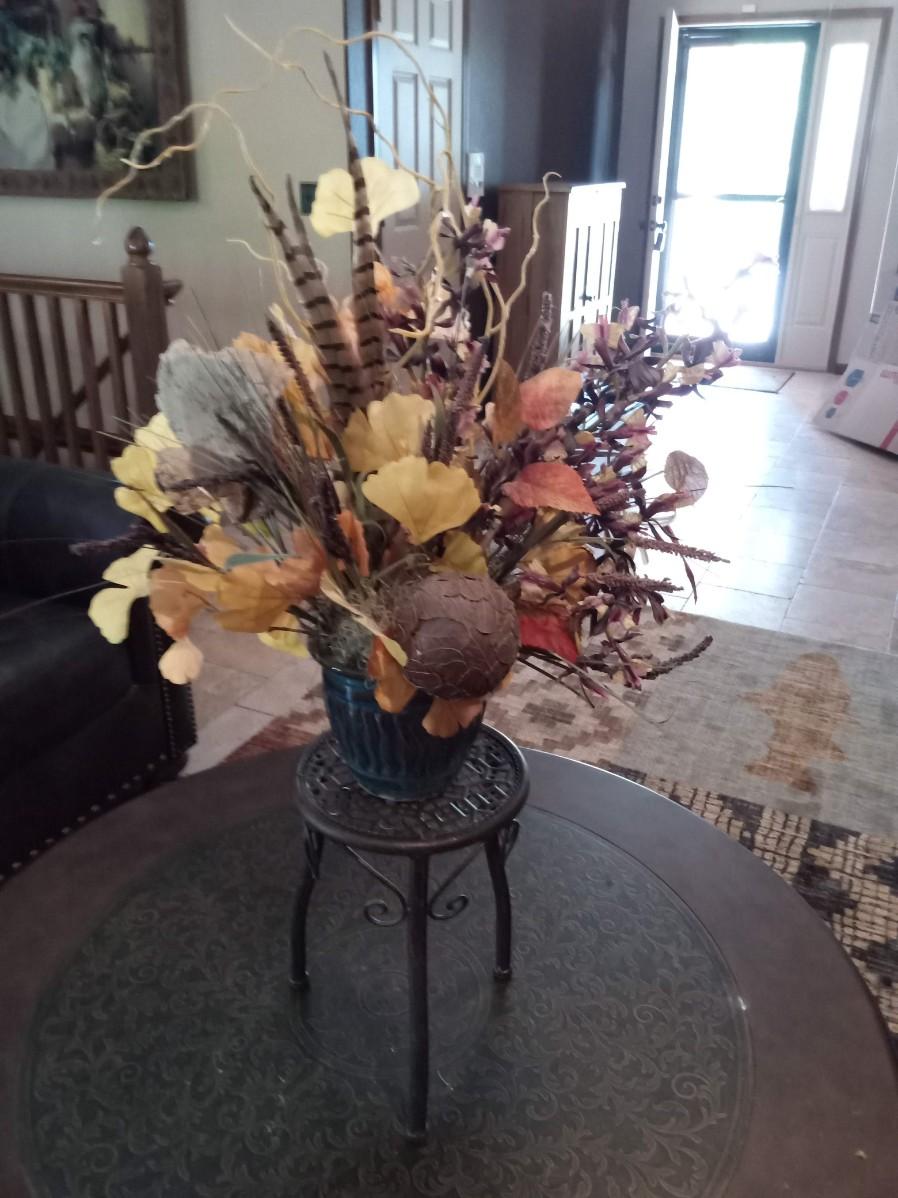 LOT 200 FAUX FOLIAGE CENTERPIECE AND A METAL STAND