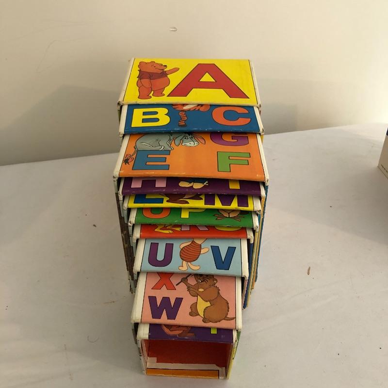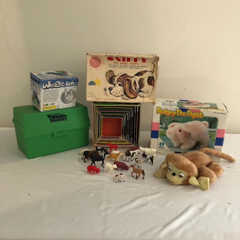 Have some fun with this collection of old and newer toy animals. Lot includes Pudgey the Piglet , Sniffy the Puppy, Weazel Ball, Winnie the Pooh alphabet boxes, Illustrated Wildlife Treasury and plastic farm animals. Items have been loved and show wear.
