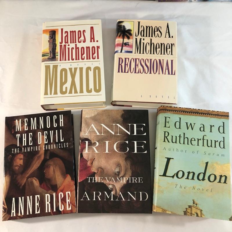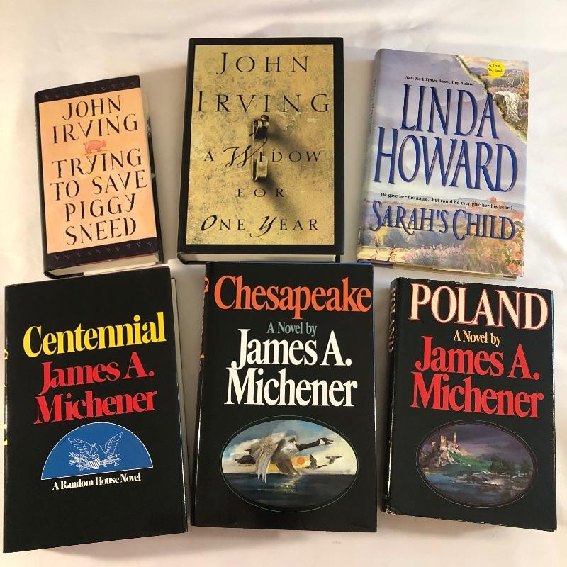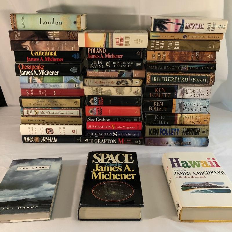 Lot includes a large assortment of bestselling books. Several books by popular authors like Ken Follet, James Michener, John Irving, Anne Rice and More. All hardcovers! No shipping.