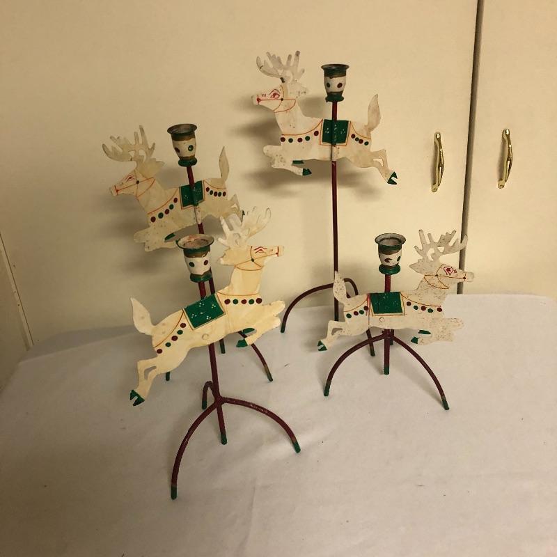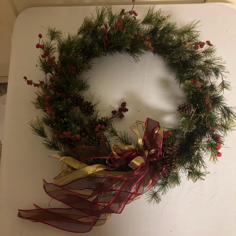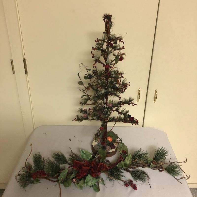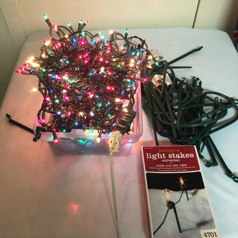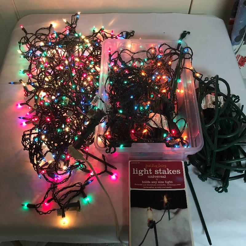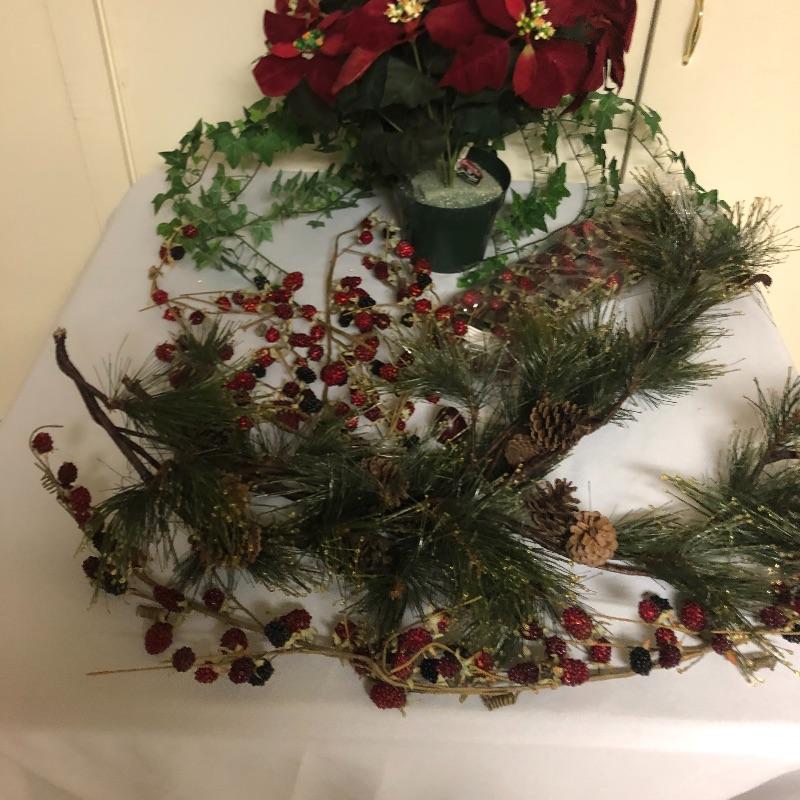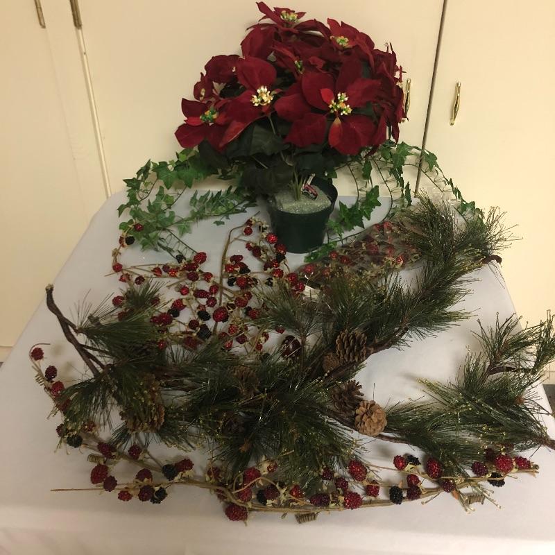 Be ready for Christmas with this plethora of Decorations that includes four strings of multi colored lights that worked when tested, two wreaths, faux poinsettias, snow depth gauge, metal reindeer, flag, extension cord, three faux trees, garland and more. Largest wreath measures 23”D.