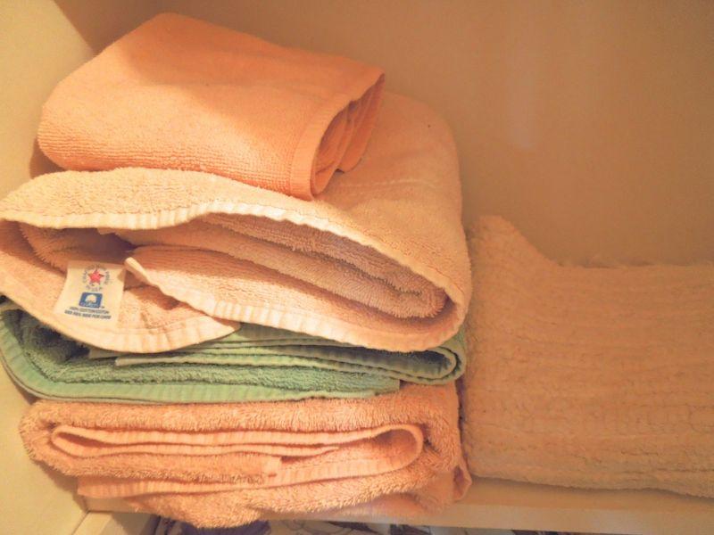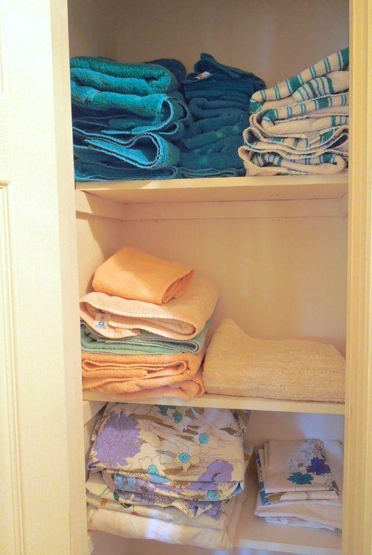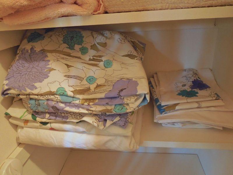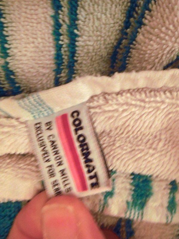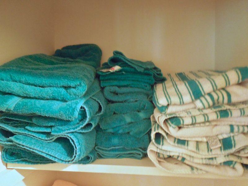 Four green and white striped full size bath towels; 5 solid teal bath towels; 6 teal face cloths; 6 teal hand towels. All made by Colormate. Some wear. 4 other pastel colored bath towels. 1 hand towel; a white chenile bath mat; assorted vintage soft cotton bed sheets.