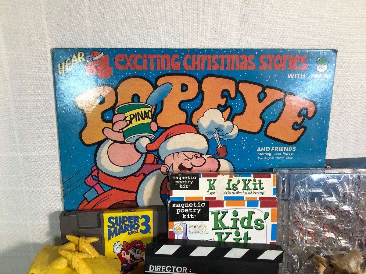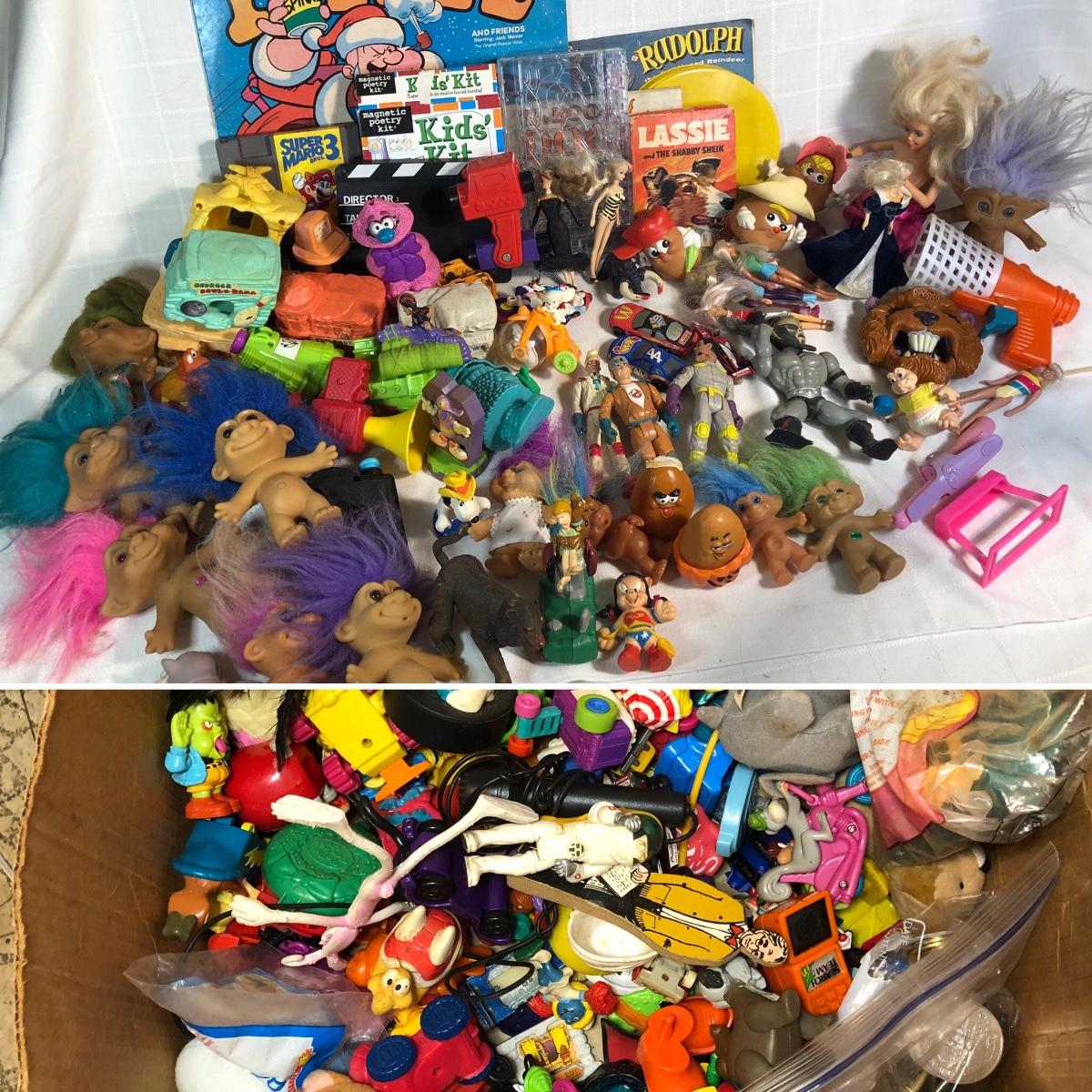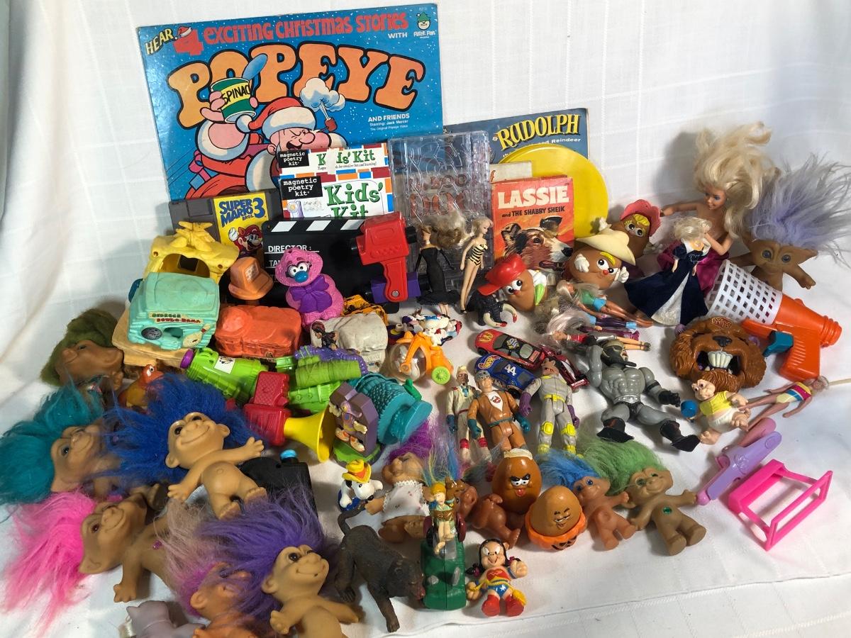 LOT 200: Huge Vintage Toy Collection - NES Super Mario 3, Popeye Christmas Stories Record, McDonalds Toys, Troll Dolls & More