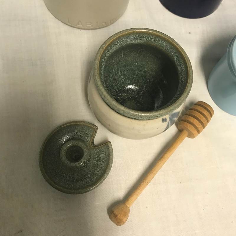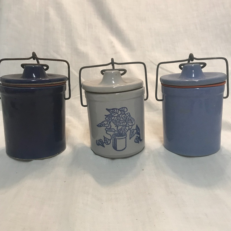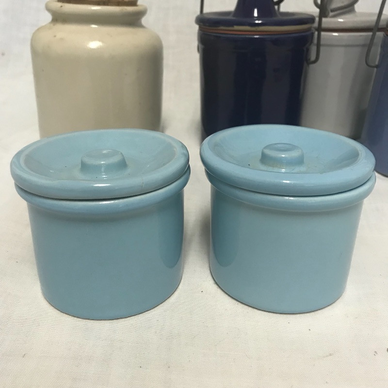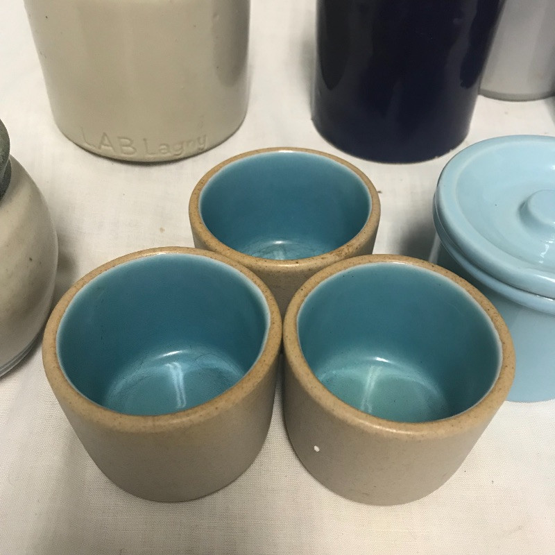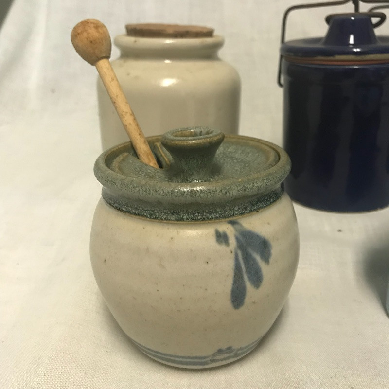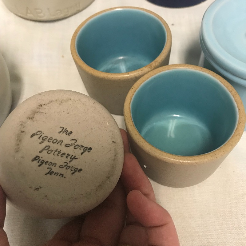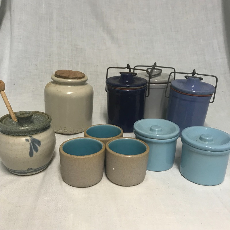 Collection of three matching cups and seven lidded containers. Lot includes a honey pot with a small chip in the lid, a LAB Lagny cork lid pot measuring 4”d x 4.5”, three hinged jars and two baby blue jars. The gaskets with the hinged jars show signs of dry-rotting and need to be replaced. The three cups have a local Pigeon Forge stamp. See images. Local Pickup Only.