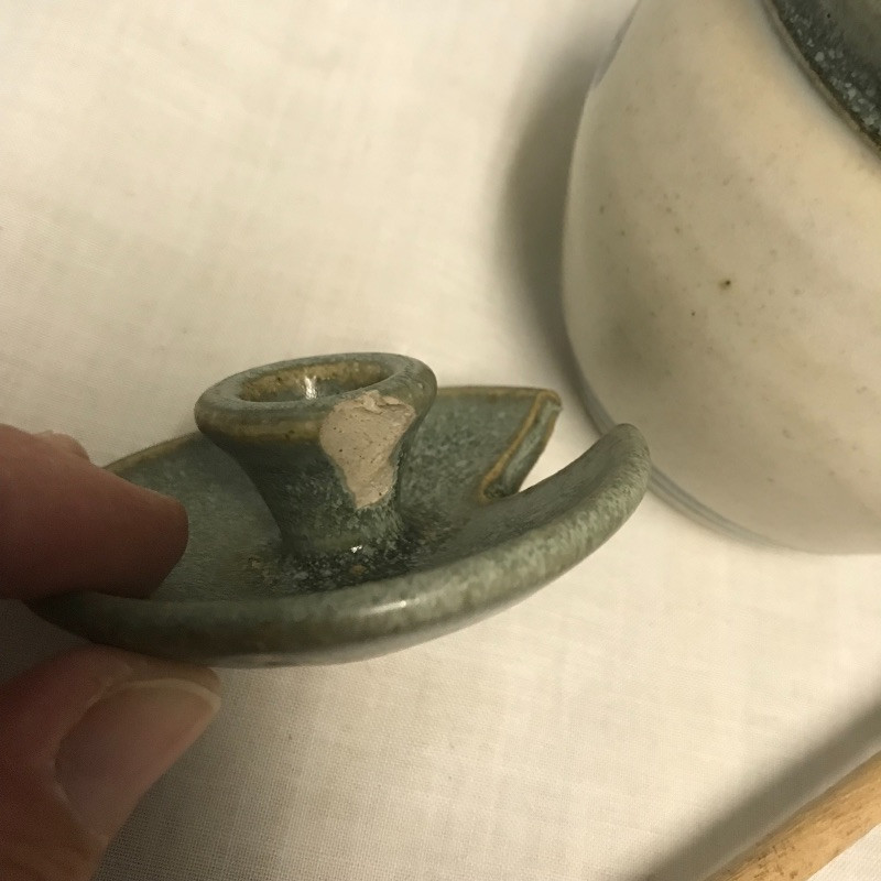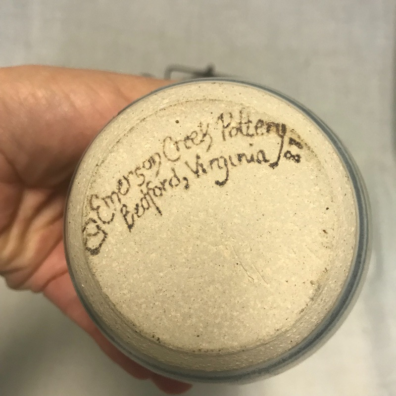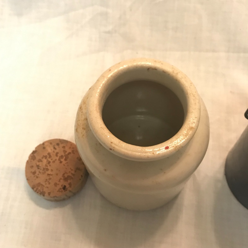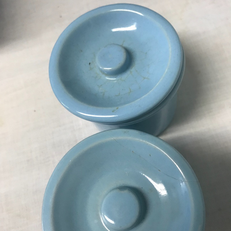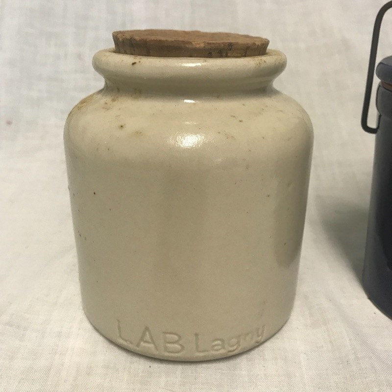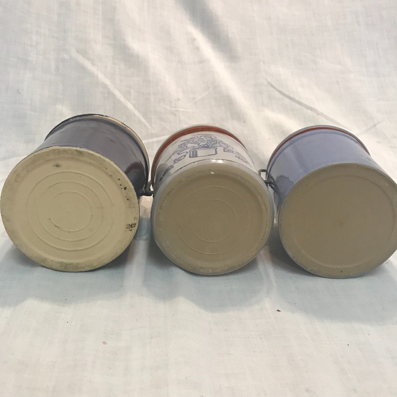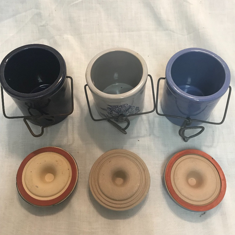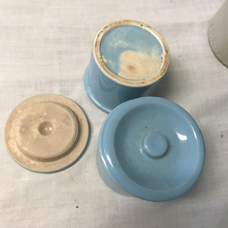 Collection of three matching cups and seven lidded containers. Lot includes a honey pot with a small chip in the lid, a LAB Lagny cork lid pot measuring 4”d x 4.5”, three hinged jars and two baby blue jars. The gaskets with the hinged jars show signs of dry-rotting and need to be replaced. The three cups have a local Pigeon Forge stamp. See images. Local Pickup Only.