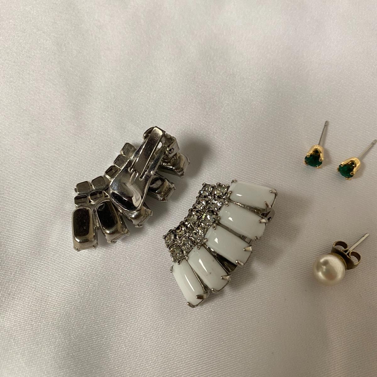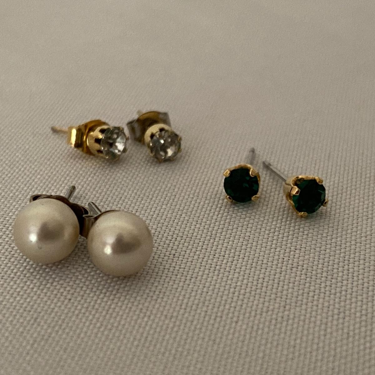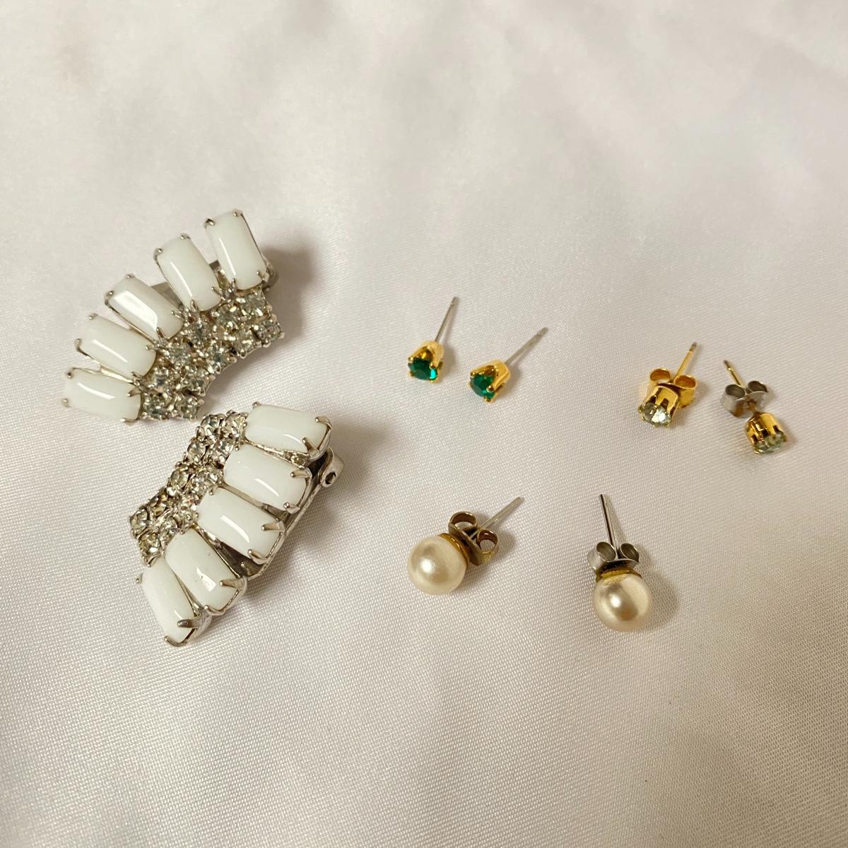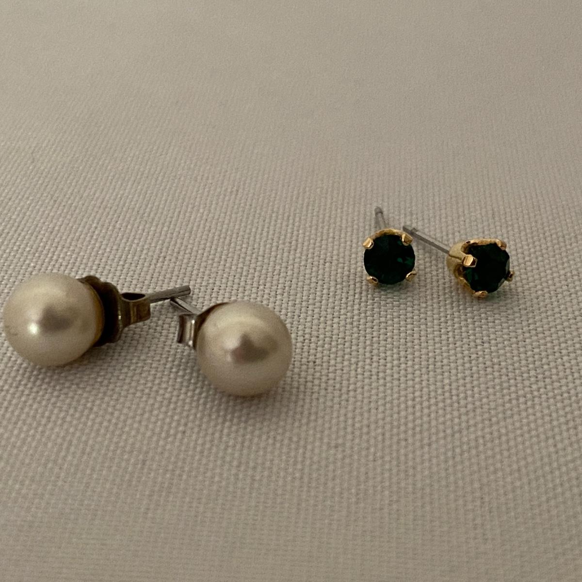 These lovely studs are great for any occasion. There are classic pearls, Diamond studs and green emeralds. None of the stones have been confirmed as such. We’ve even thrown in a clip on pair of crystal and white earrings for your fancier night out! Shipping available