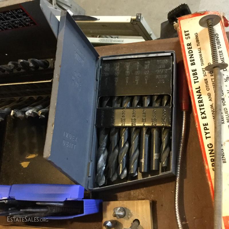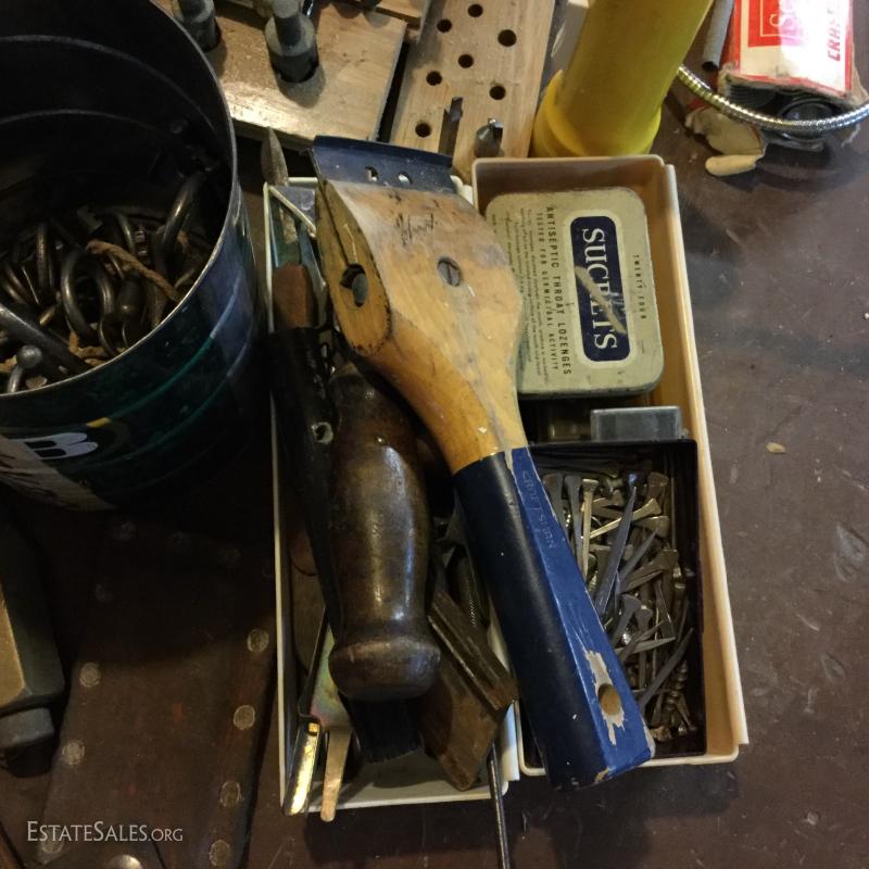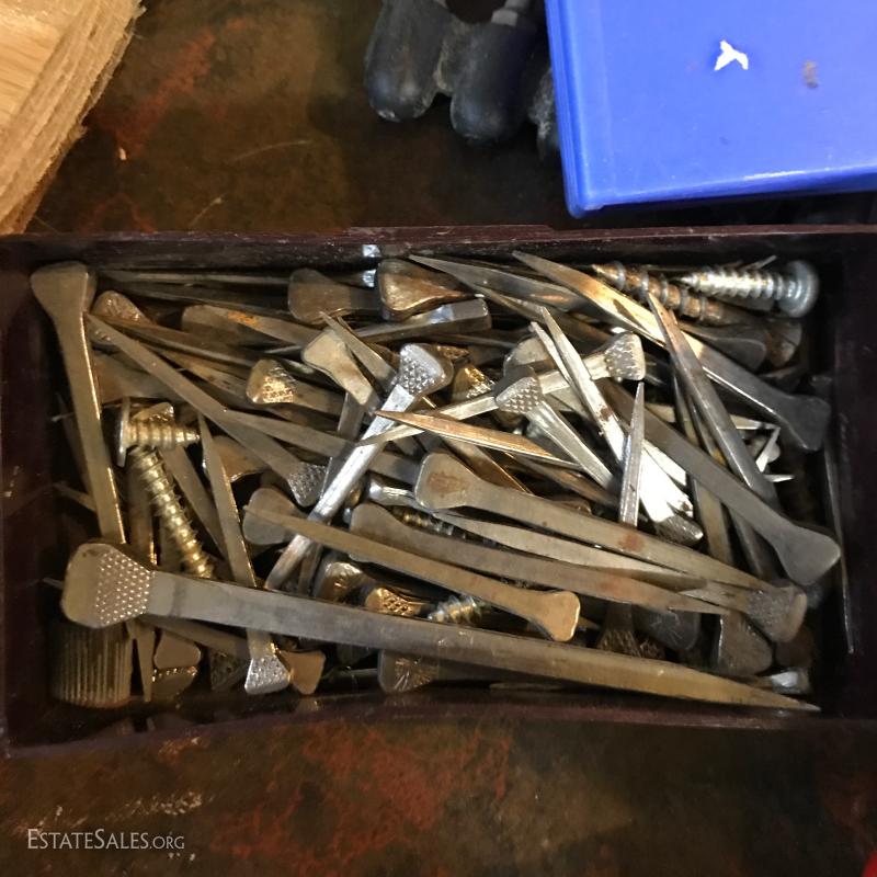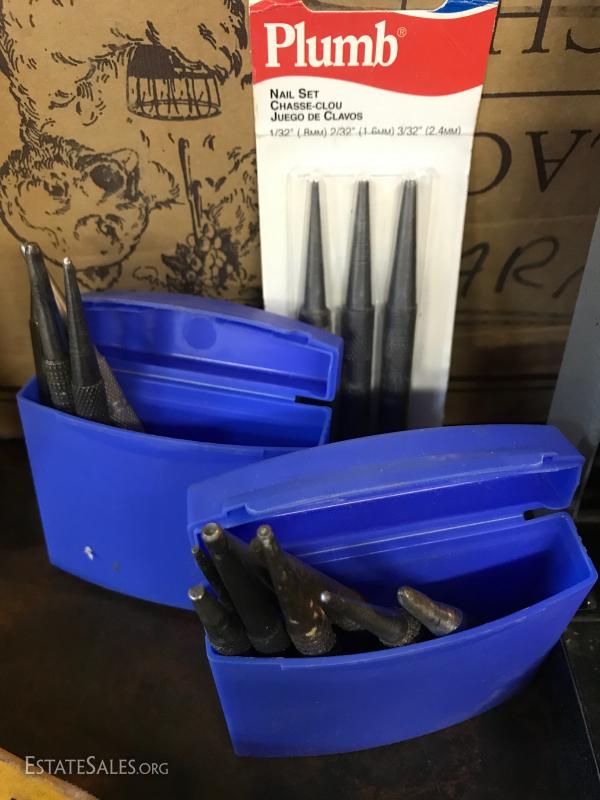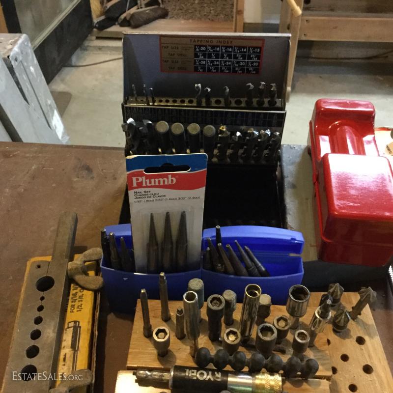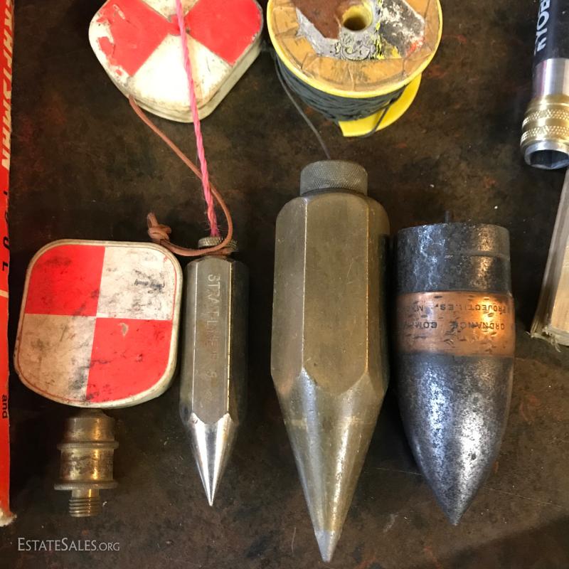 Assorted drill bits, several plumb bobs and horseshoe nails. More misc items. See photos.