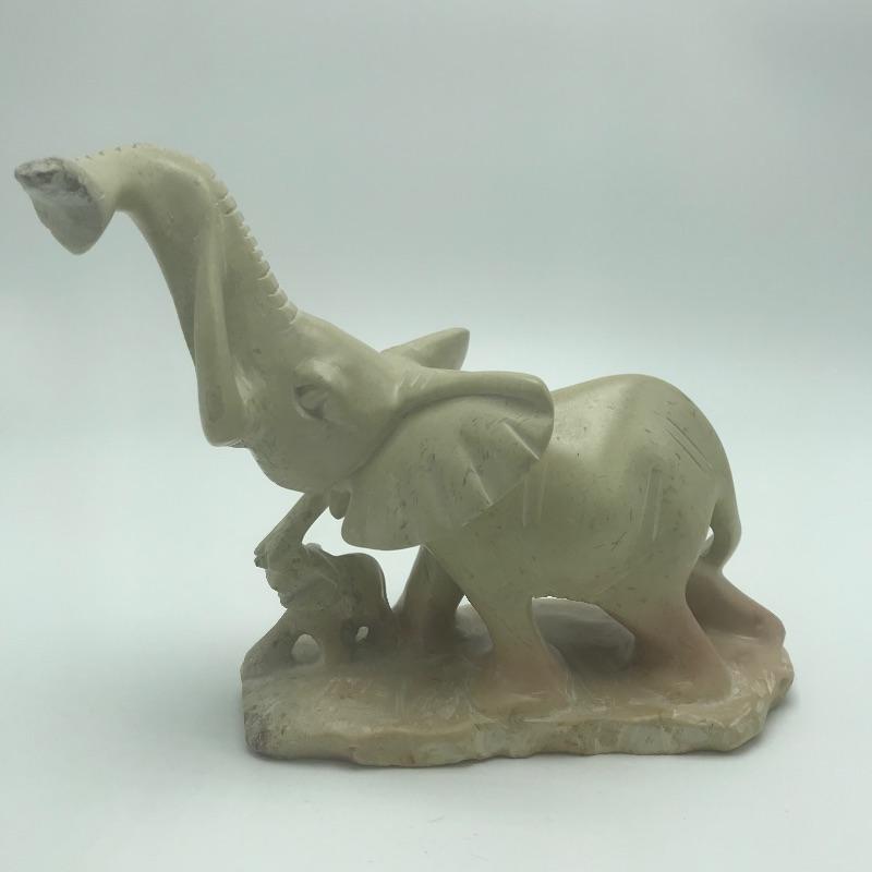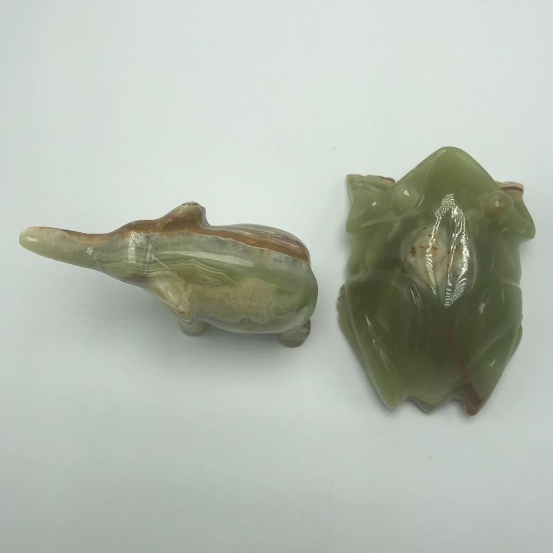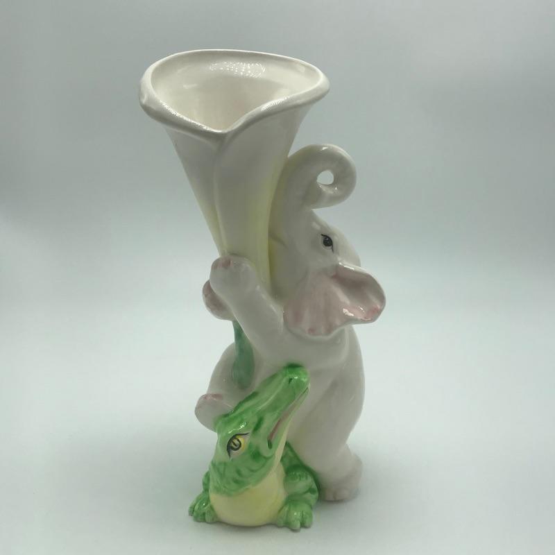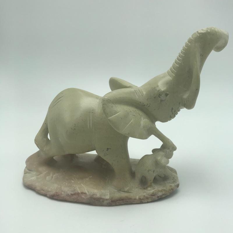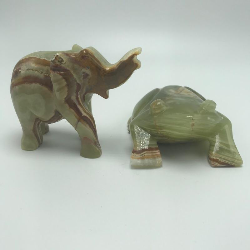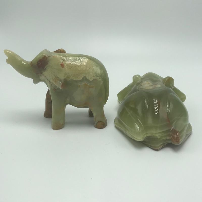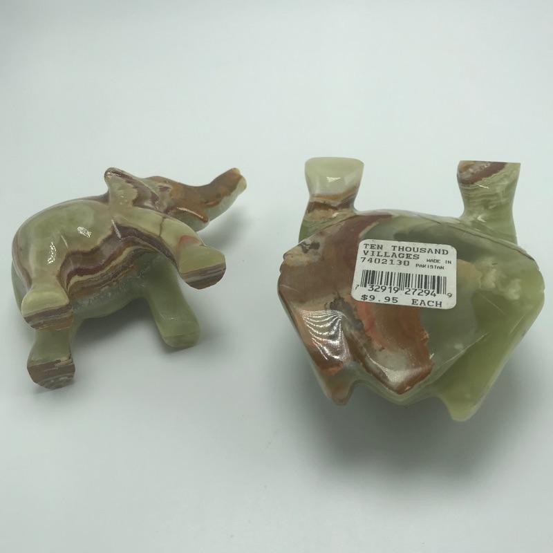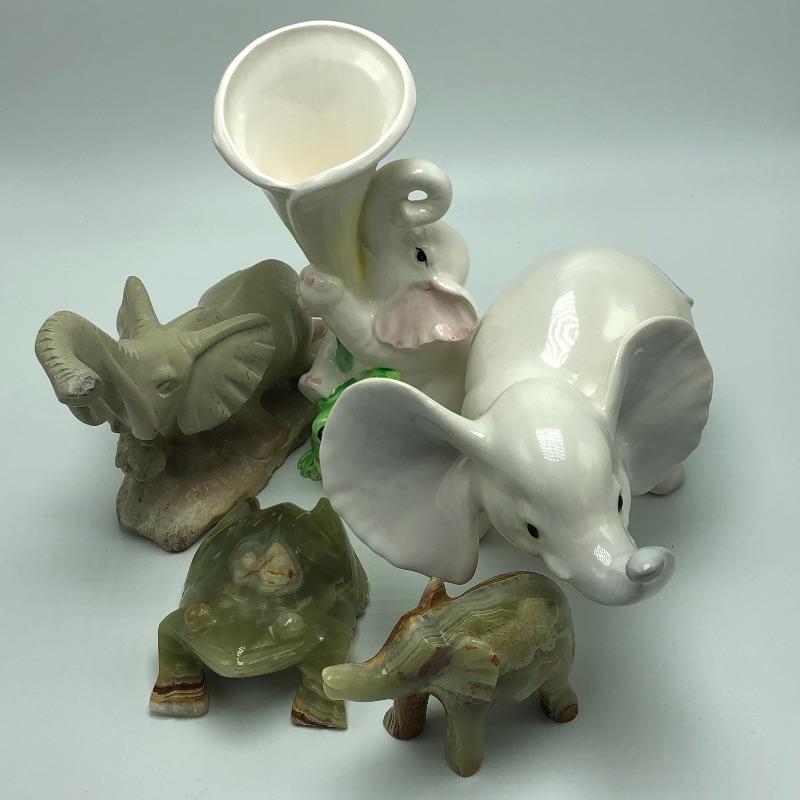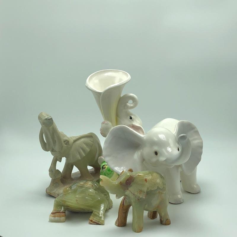 Elephants with a side of frog! Lovely wild animal figurine collection featuring four elephants, an alligator and one toad. One stone elephant/toad pair has a gorgeous green marbled grain. Another fabulous pair- an elephant and alligator climbing a lily doubles as a vase! Pair is possibly made of porcelain. Lot also includes a heavy Kenyan mother-child elephant appears to be carved stone. Lastly, a simple white ceramic elephant measuring approximately 7.75” x 7”. Shipping available.