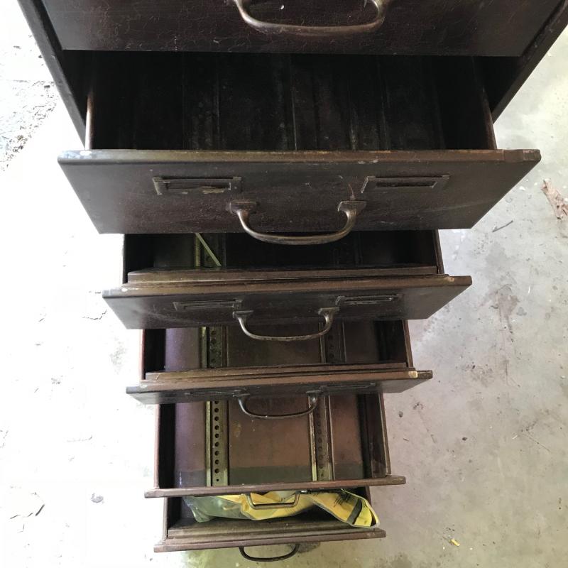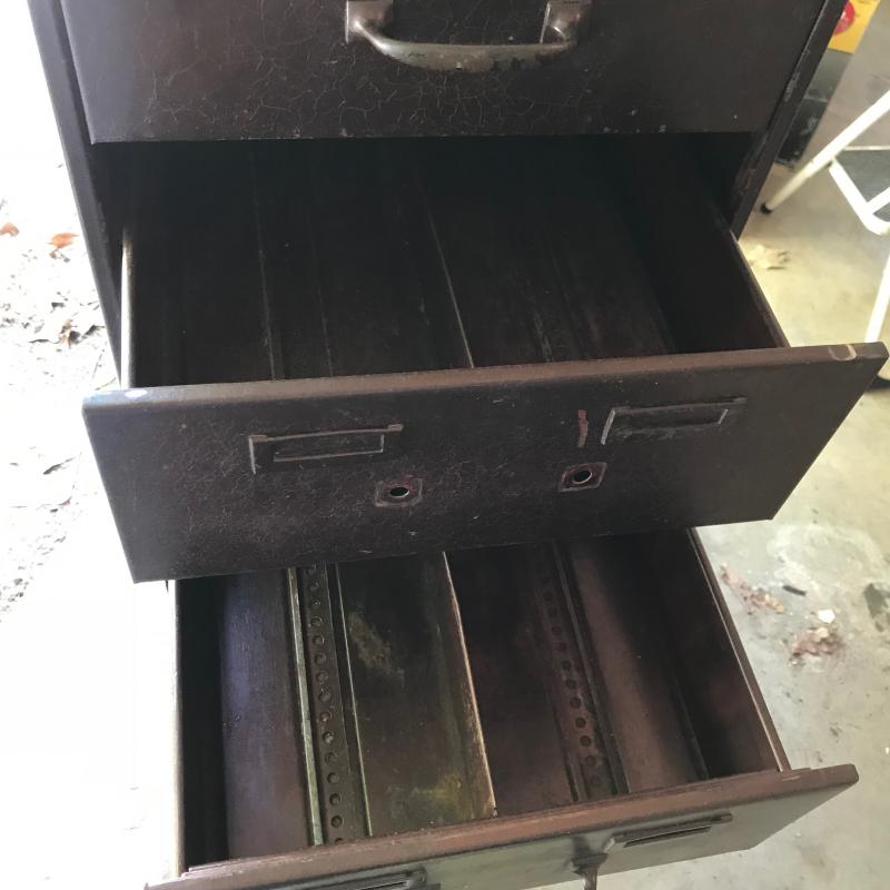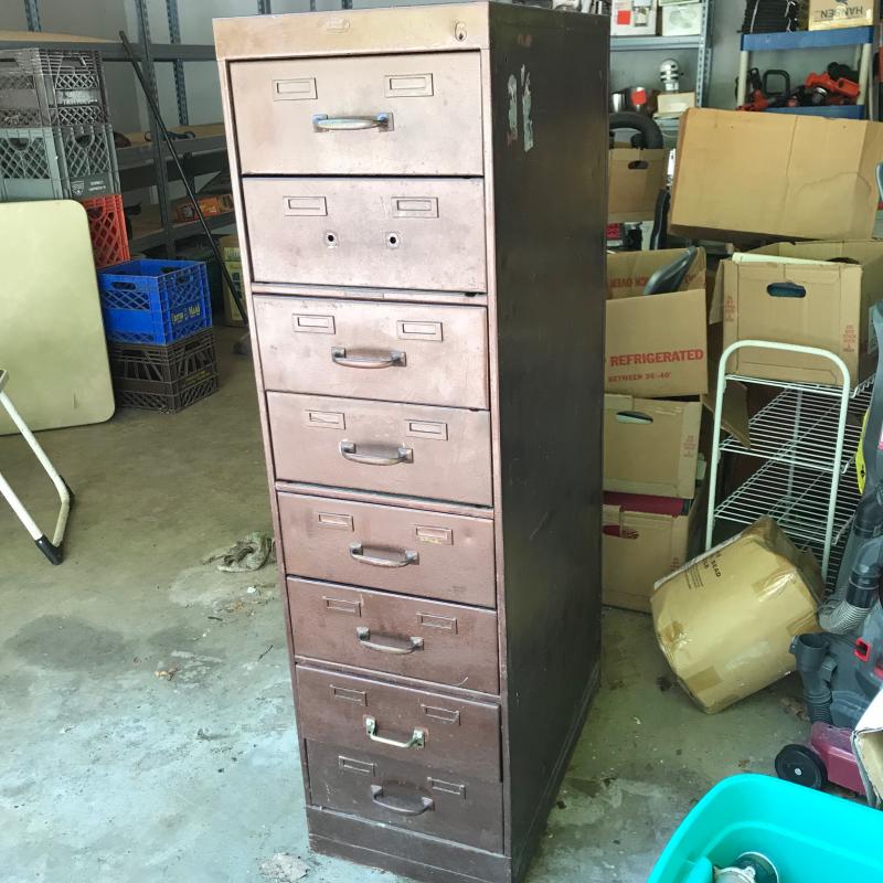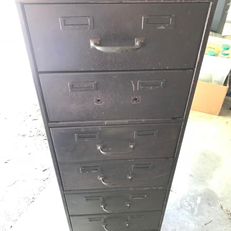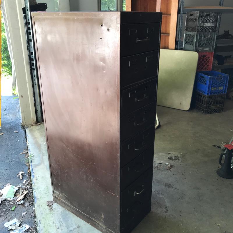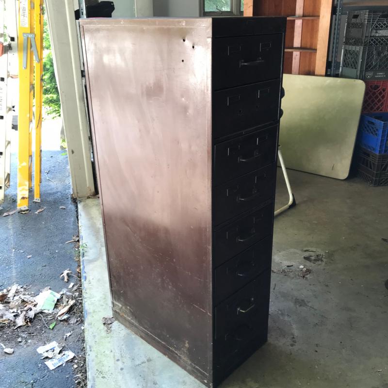 Antique metal file cabinet. Approx. 25.5” x 14.5” x 53”. No shipping. Local pickup only. Very heavy. Please bring help to move and load.