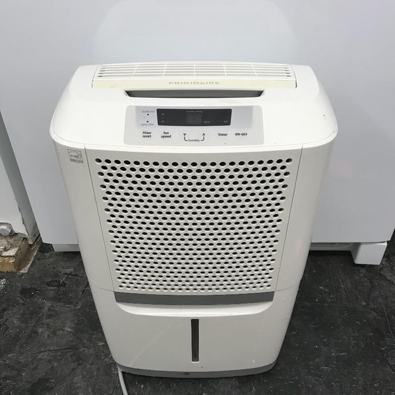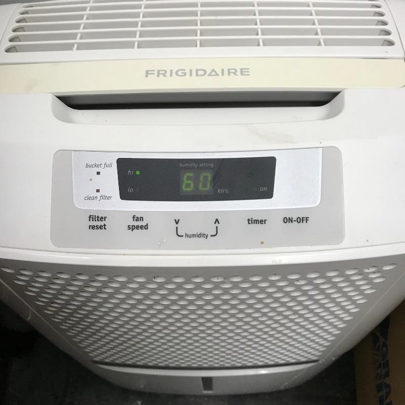 Compact dual speed Frigidaire dehumidifier with Energy Star stamp. Complete with an area to attach a hose for immediate draining. Reservoir and filter need a good cleaning, appliance works well when turned on. No shipping.