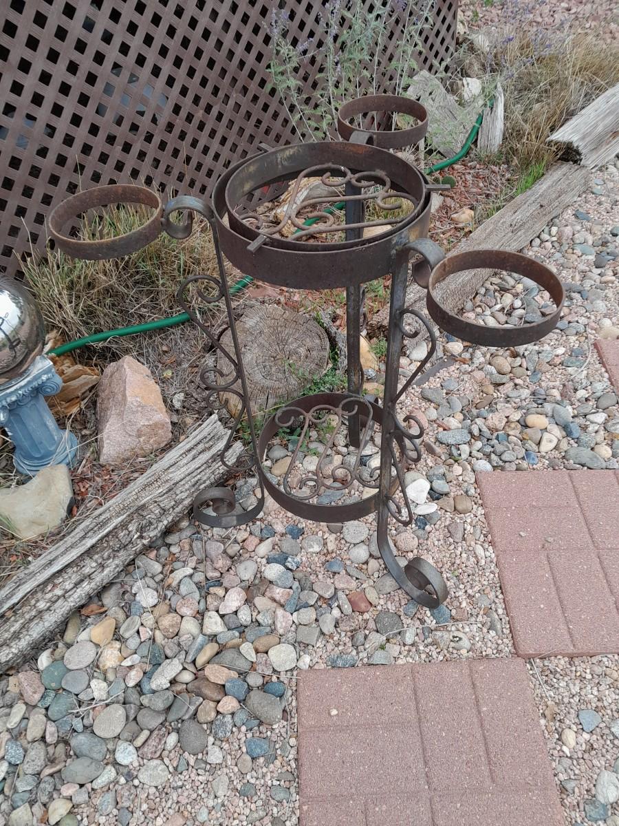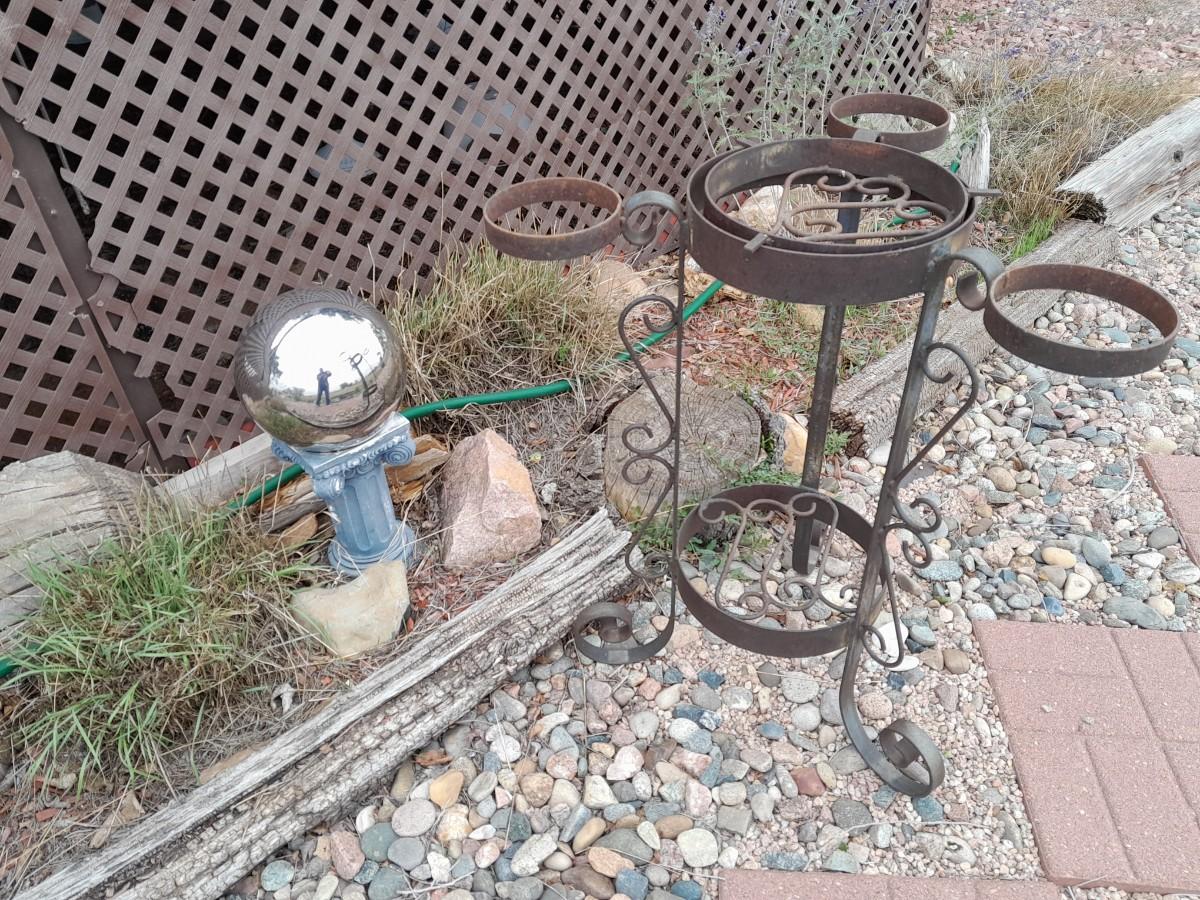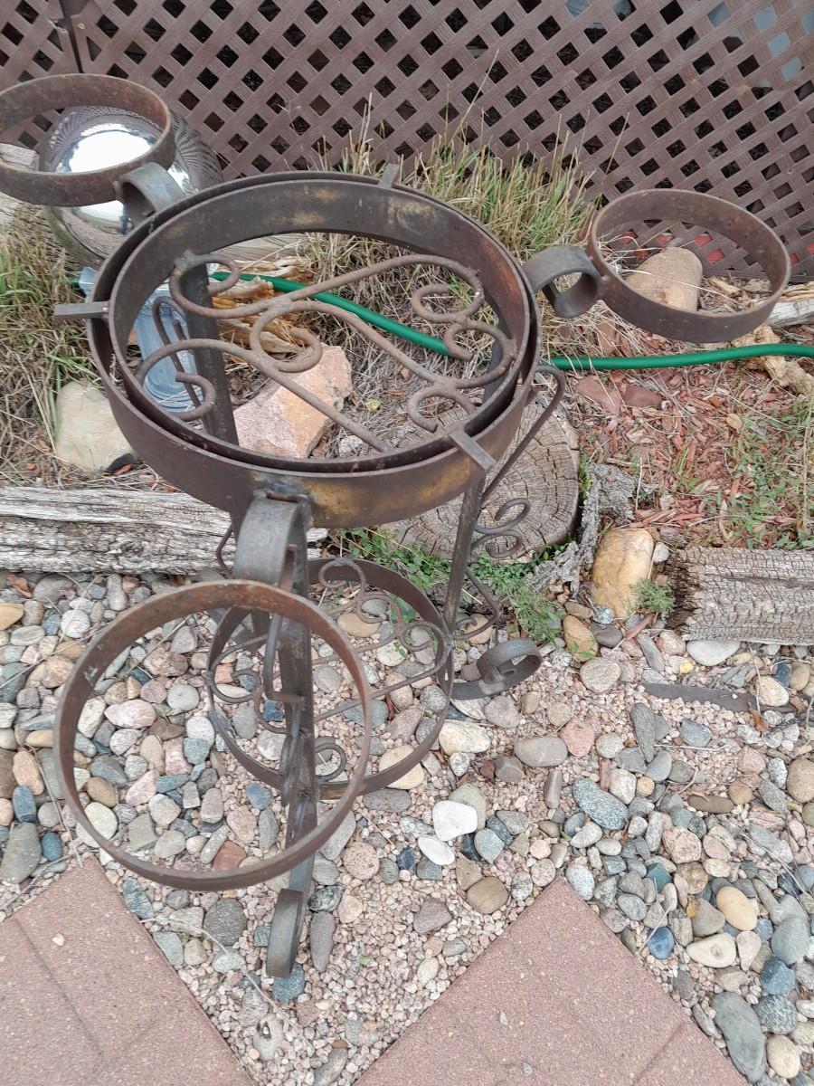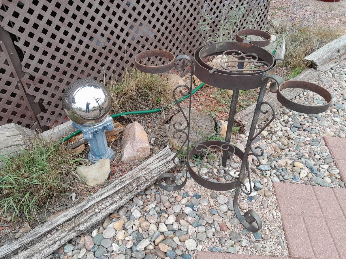 20" GAZING BALL ON STAND, AND IRON MUTI POT PLANT STAND APPROX. 30" X 25"