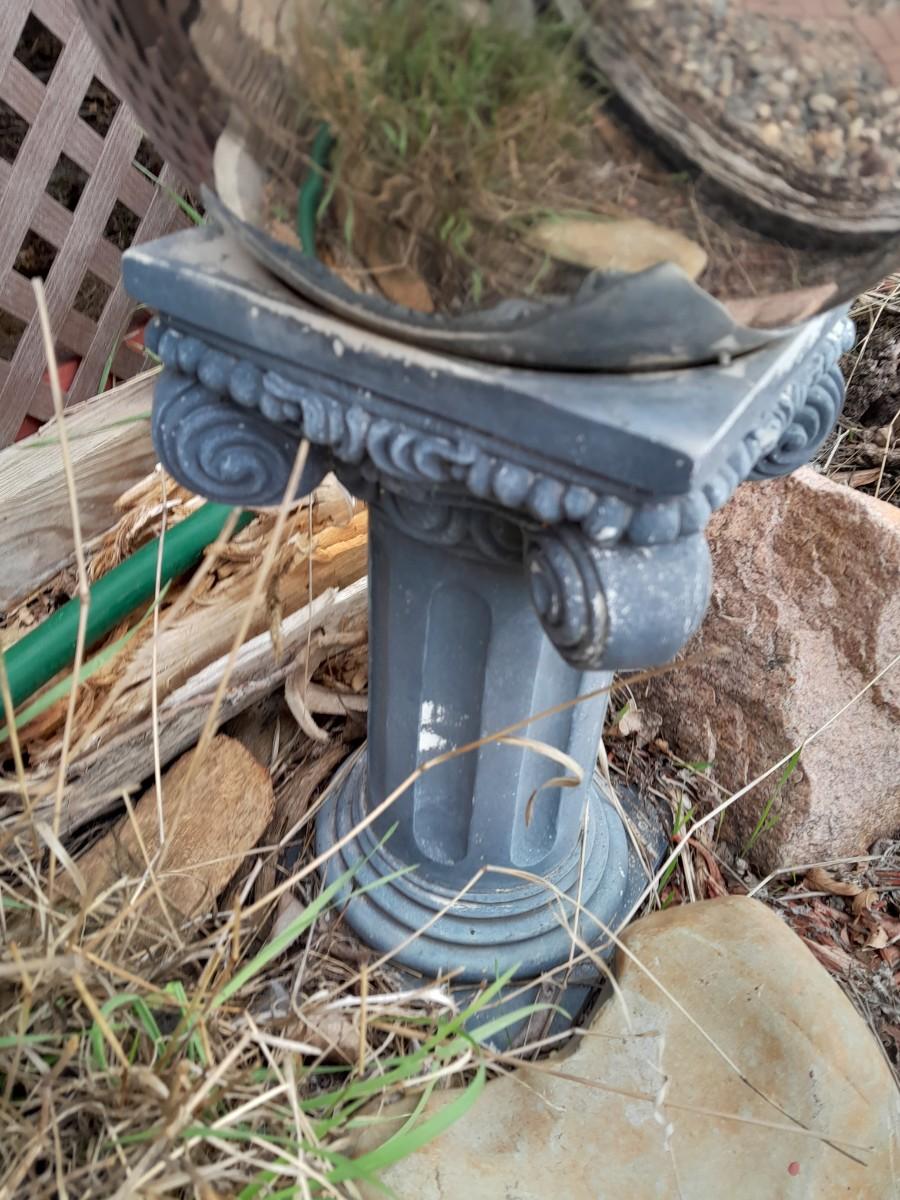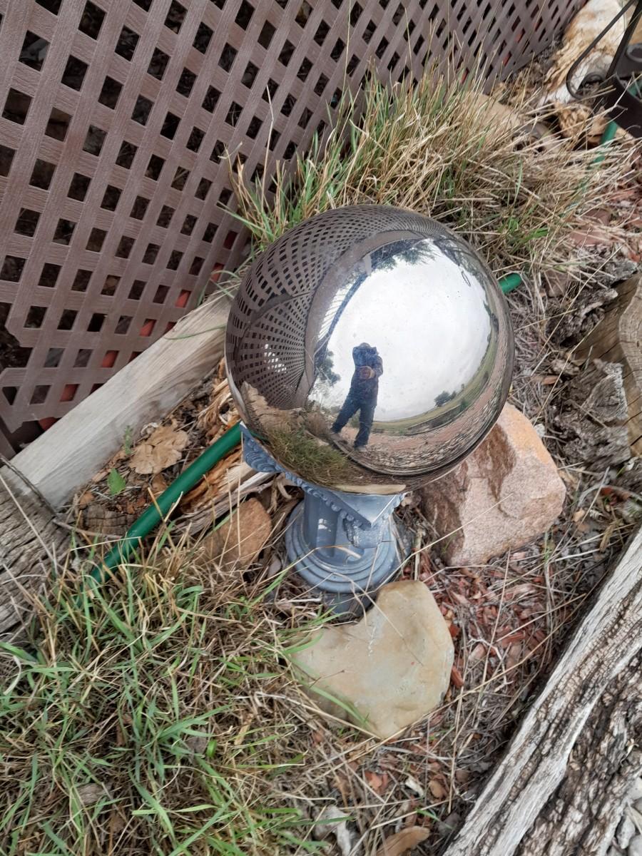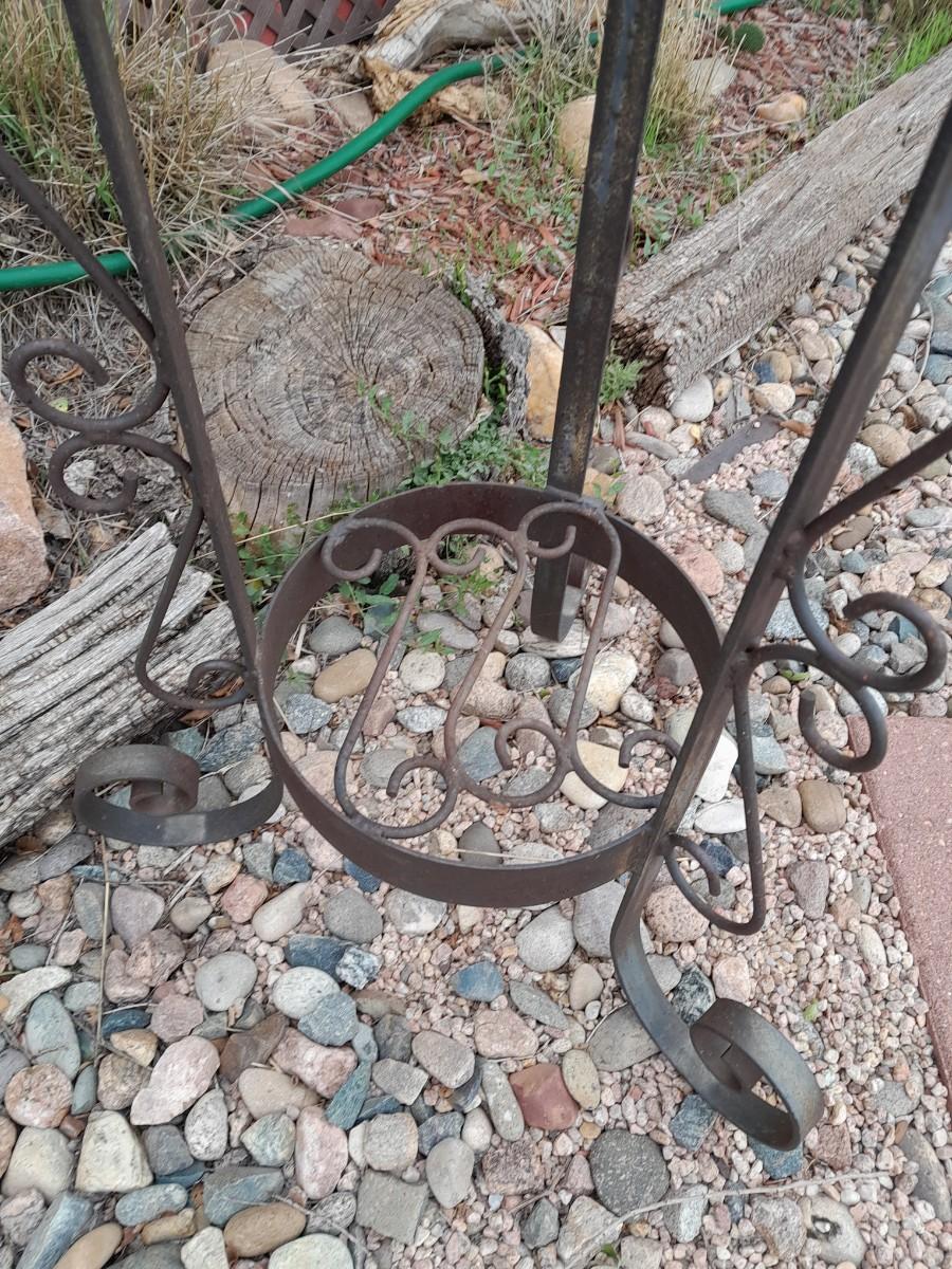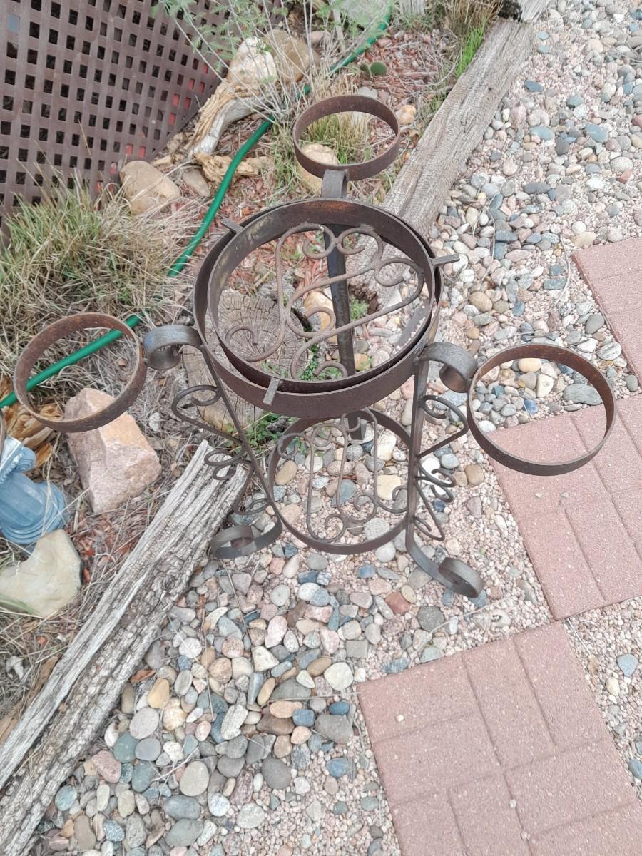 20" GAZING BALL ON STAND, AND IRON MUTI POT PLANT STAND APPROX. 30" X 25"