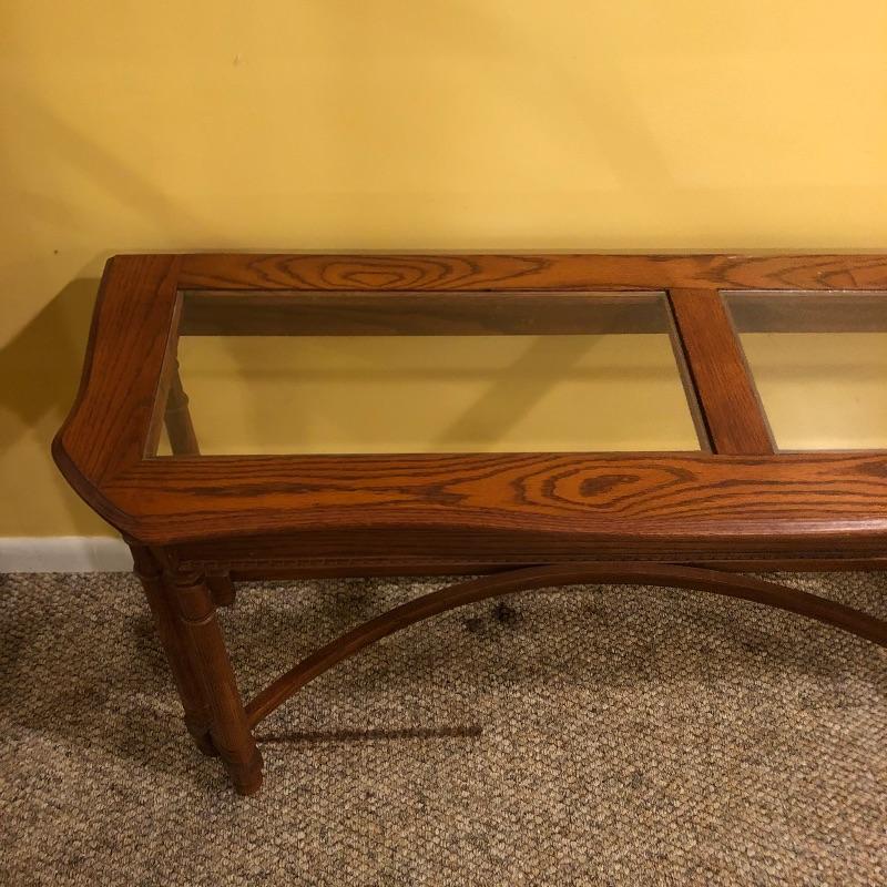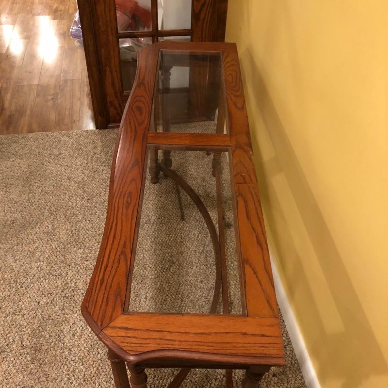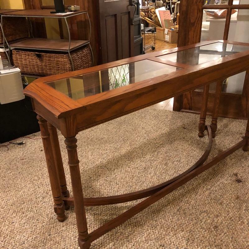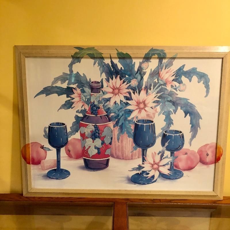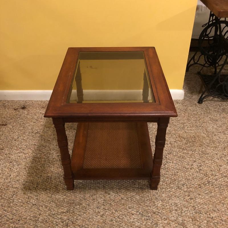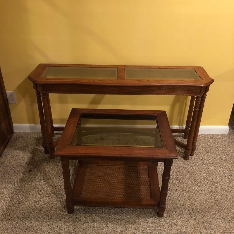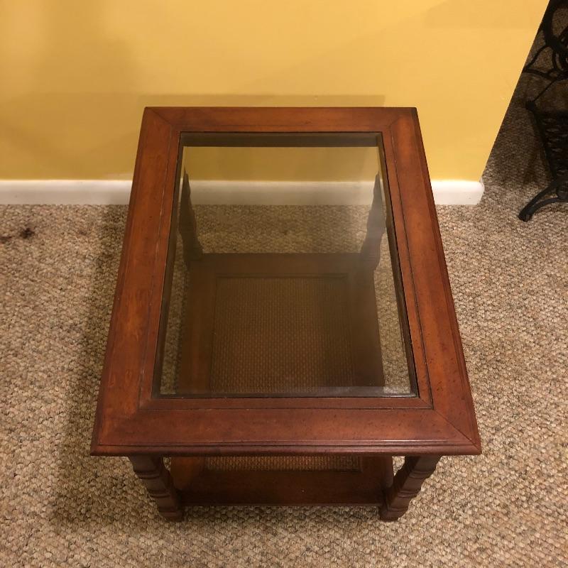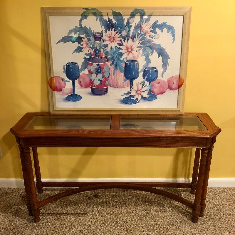 Two glass topped tables in this lot and a painting. The larger sofa table is a lighter colored wood than the other, with beautifully carved legs and a curved base that gives it even more appeal. The two pieces of glass are detachable. The smaller end table, also with detachable glass, is closer to a mahogany colored wood with an attractive woven wood lower shelf. The very unique piece of art is titled Tuscan Wine and the artist whose name appears to be Margaretha, has continued the painting into the frame itself.