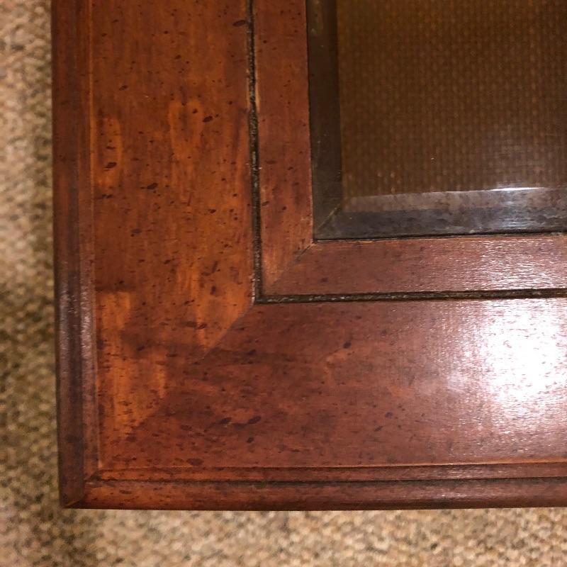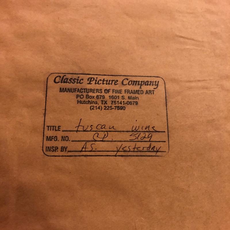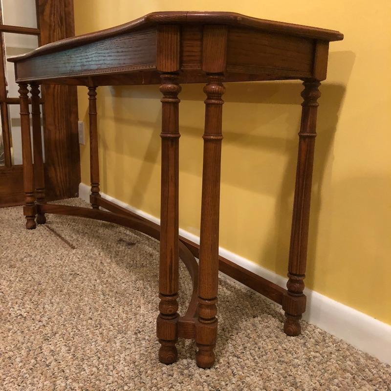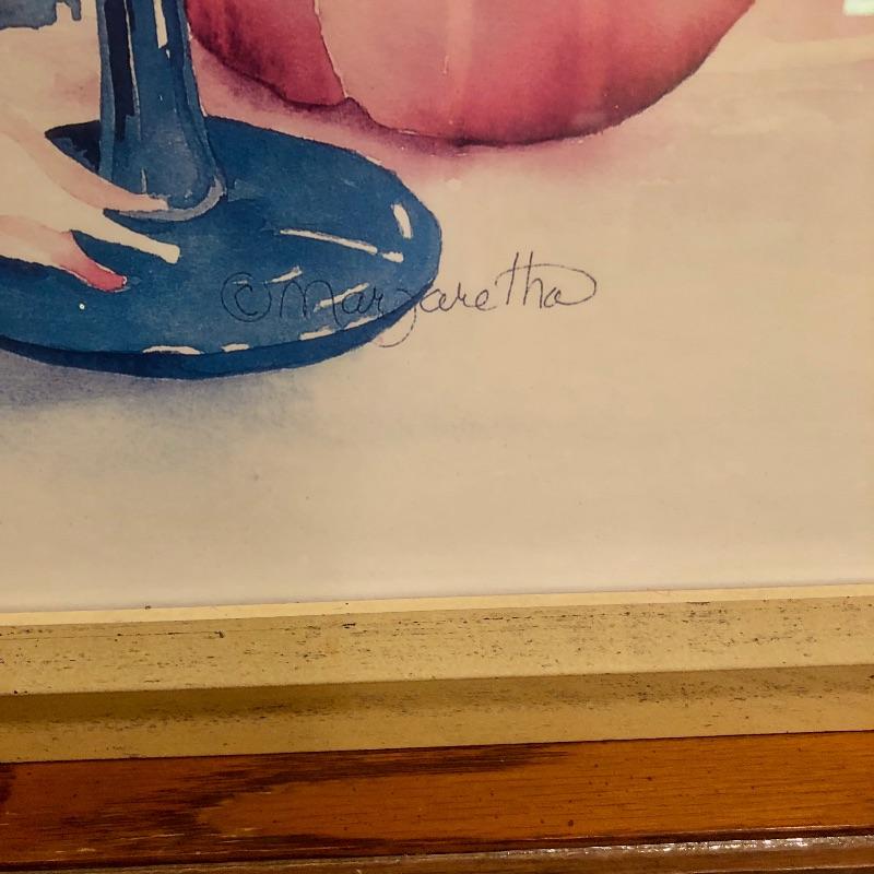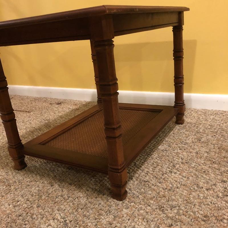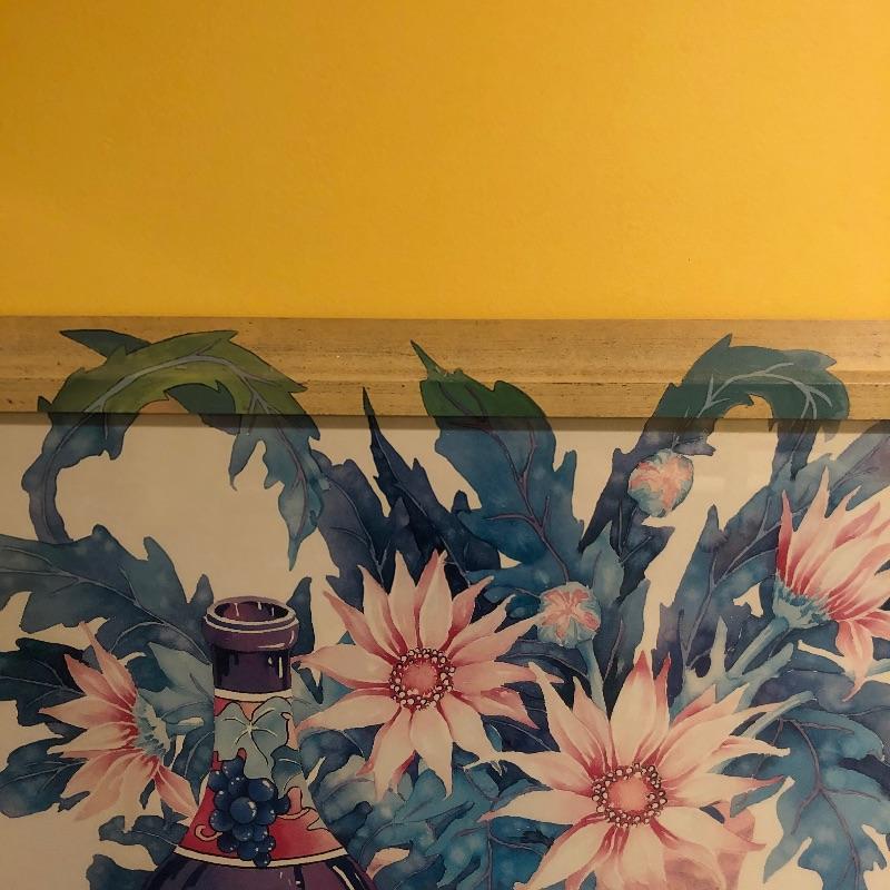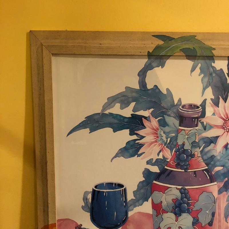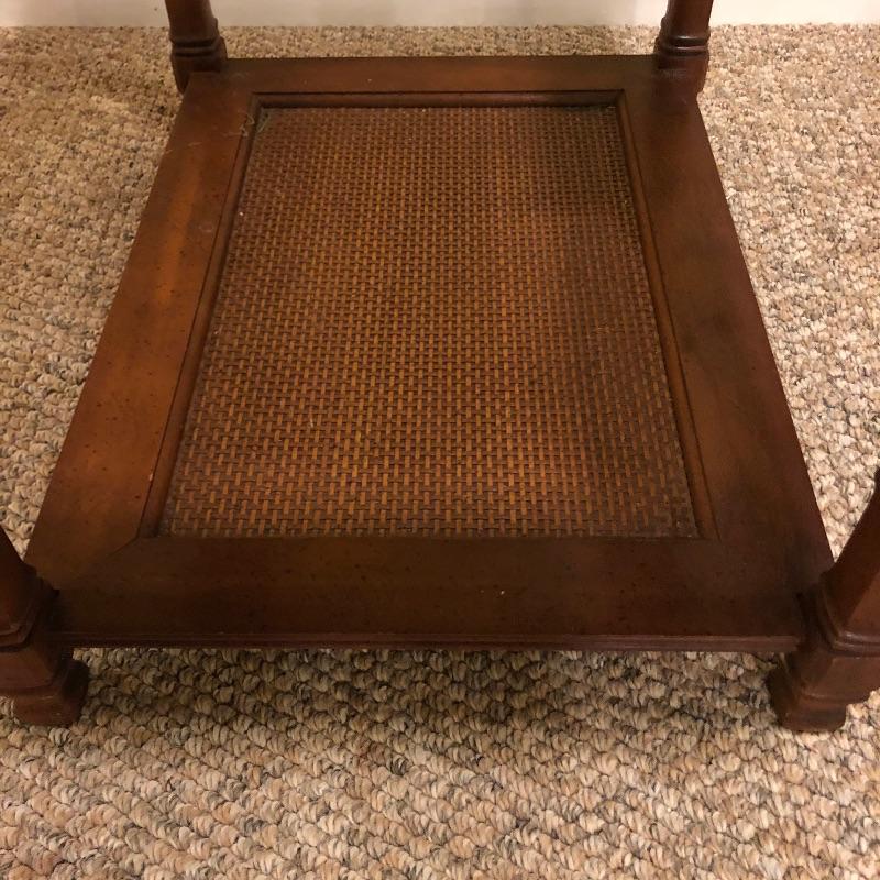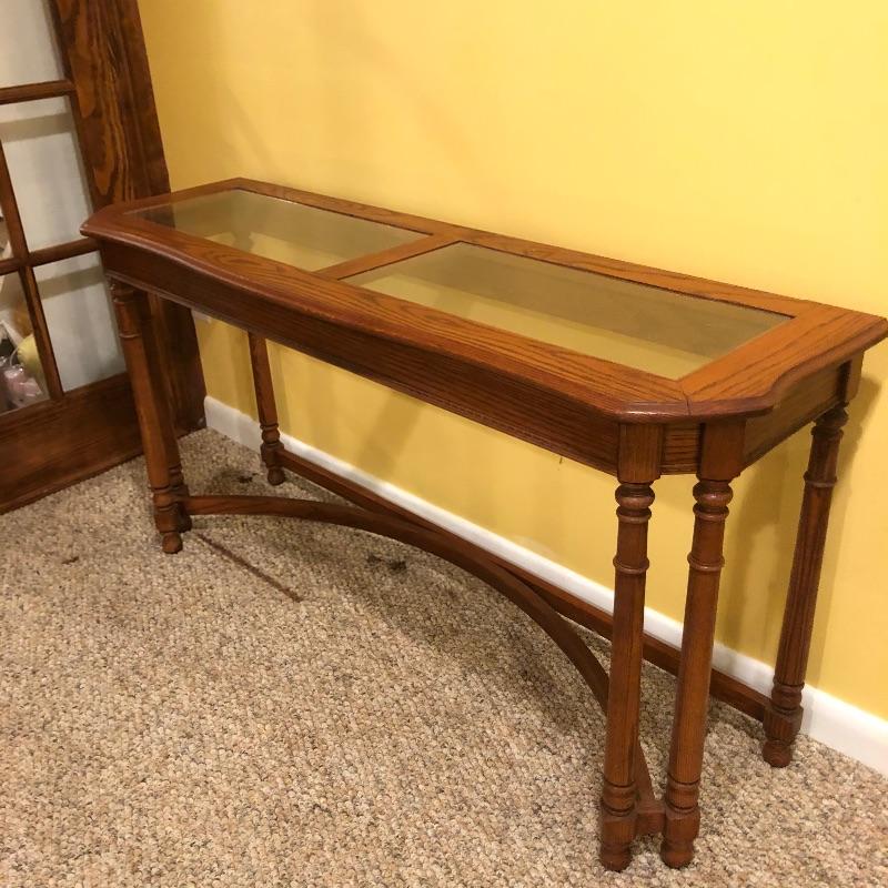 Two glass topped tables in this lot and a painting. The larger sofa table is a lighter colored wood than the other, with beautifully carved legs and a curved base that gives it even more appeal. The two pieces of glass are detachable. The smaller end table, also with detachable glass, is closer to a mahogany colored wood with an attractive woven wood lower shelf. The very unique piece of art is titled Tuscan Wine and the artist whose name appears to be Margaretha, has continued the painting into the frame itself.