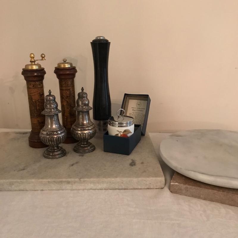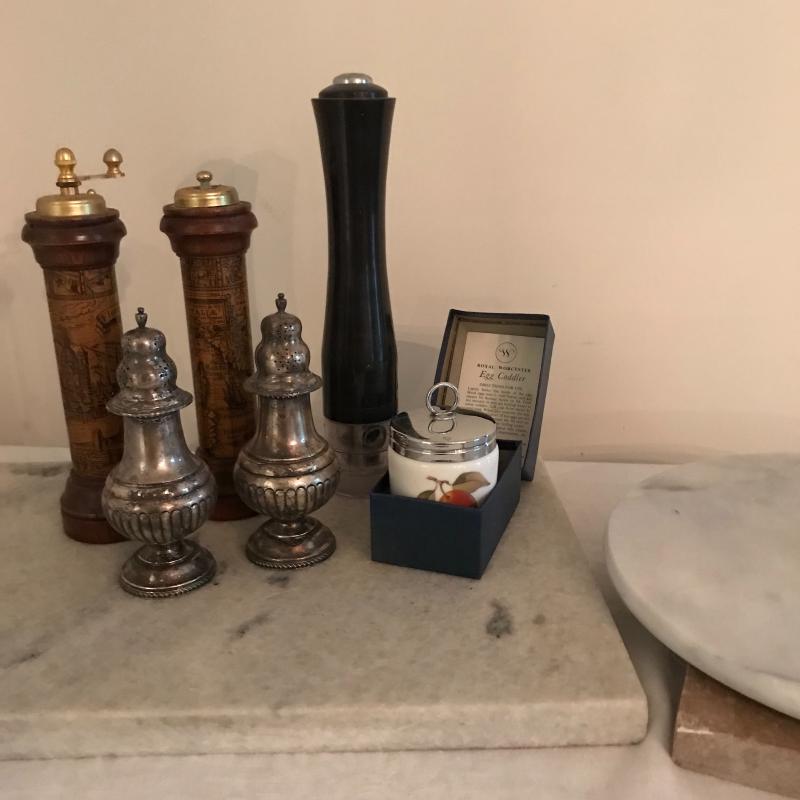 Lots includes three marble slabs (largest is 18” x 12”), a set of salt and pepper shakers, a wooden salt shaker with matching pepper mill and a large pepper mill. Lot also includes a Royal Worcester egg coddler. No shipping available. Local pickup only in Asheville, NC.
