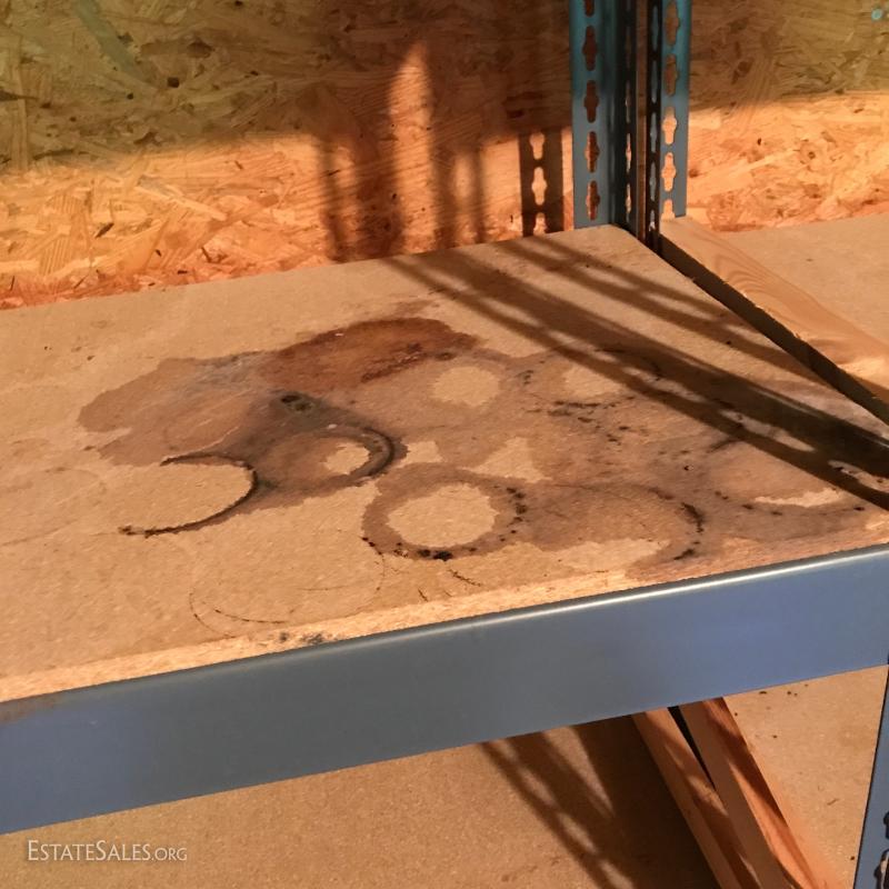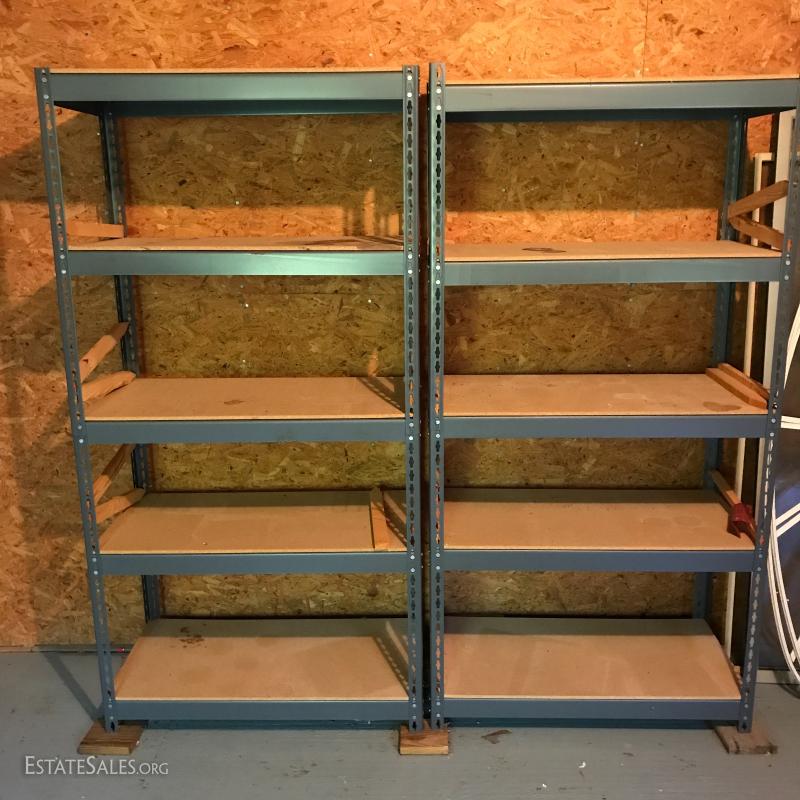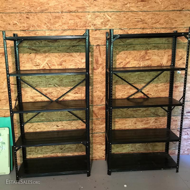 4 shelf units. 2 black metal measuring 37" x 16" x 70.5" and two grey shelves with particle board shelf bottoms, measuring 36" x 16" x 71.5". Some staining on particle boards, and some rust spots but overall in good shape. This lot is available for local pick up in Flat Rock, NC only.
