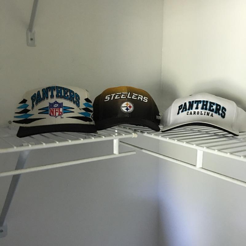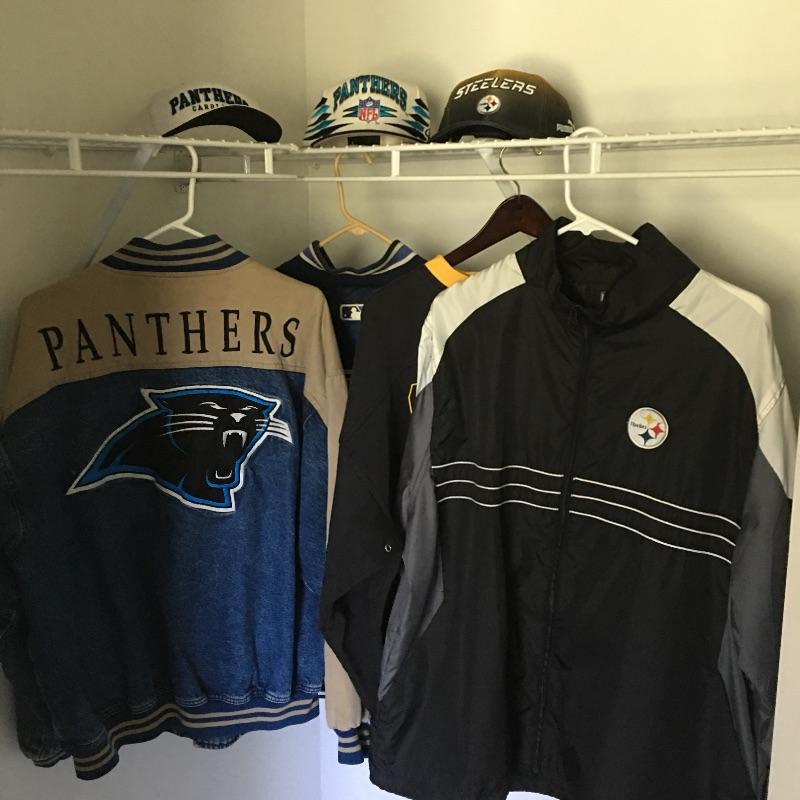 MLB & NFL jackets includes Carolina Panthers jacket, Pittsburgh Steelers jacket and sweatshirt, Anaheim Angels(vintage logo!) jacket, two Panthers hats and a Steelers hat. All clothing sized XL.