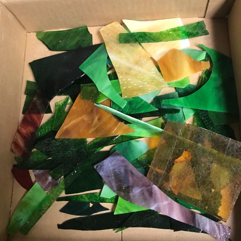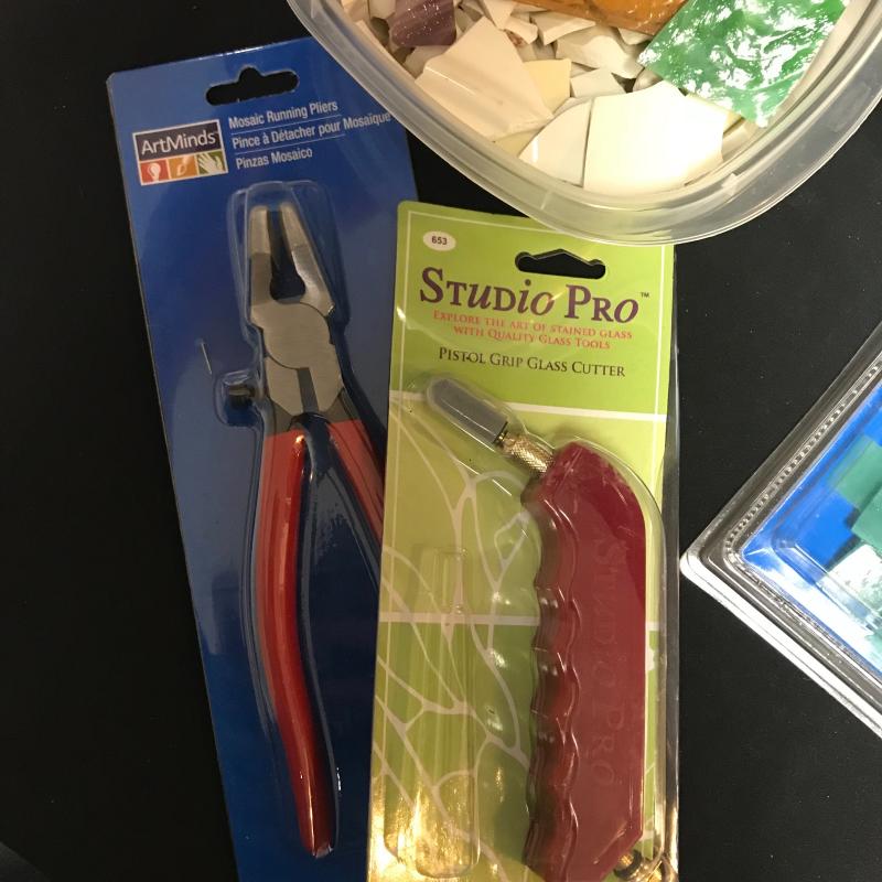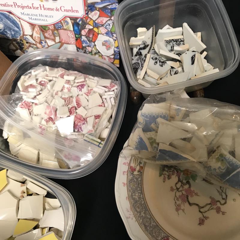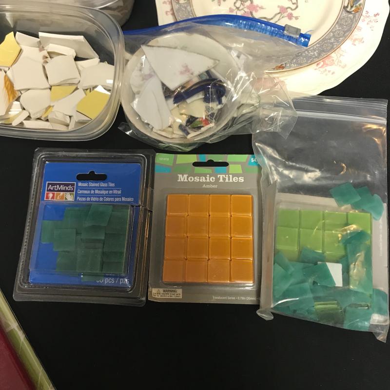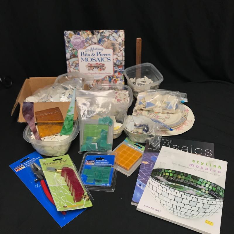 Add to your crafting supply collection with three instructional books, purchased mosaic tiles, hand broken organized mixed China intended for mosaic art, stained glass pieces and tools still in packaging. Local pick up only.