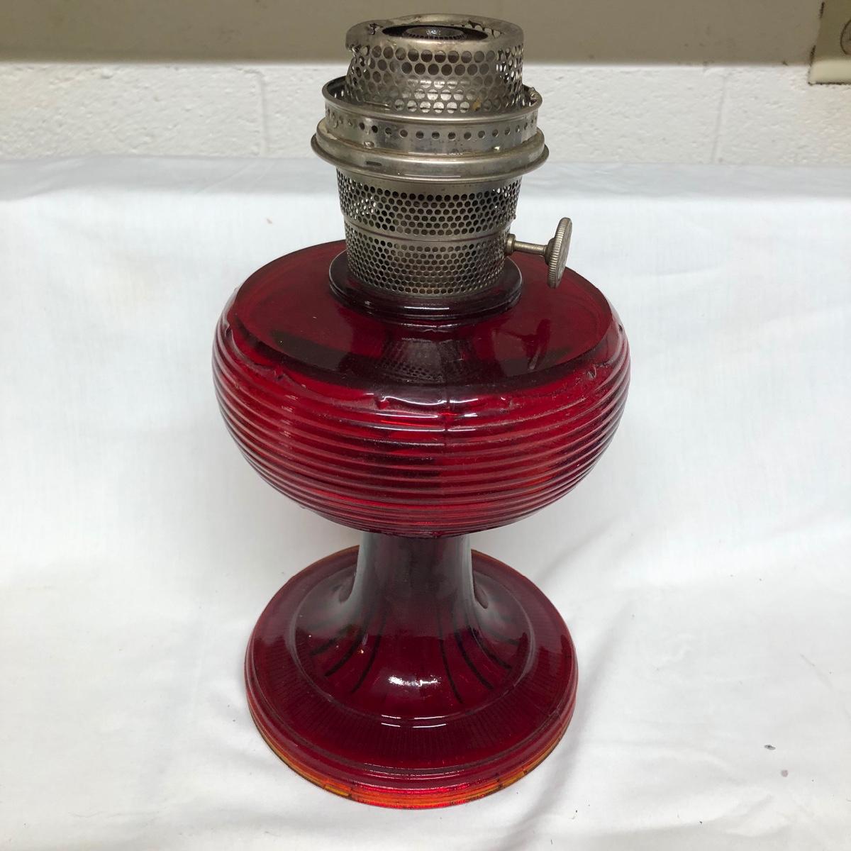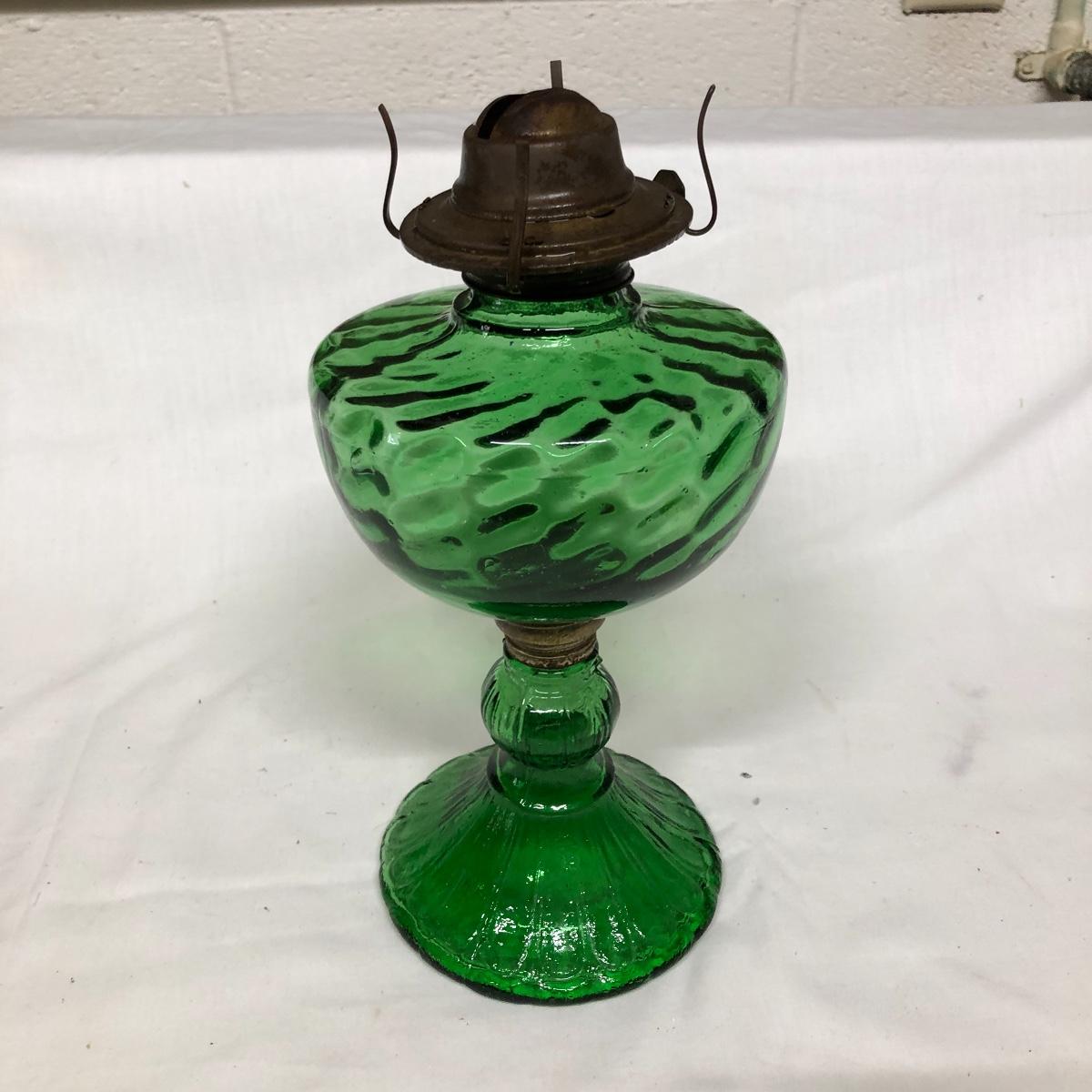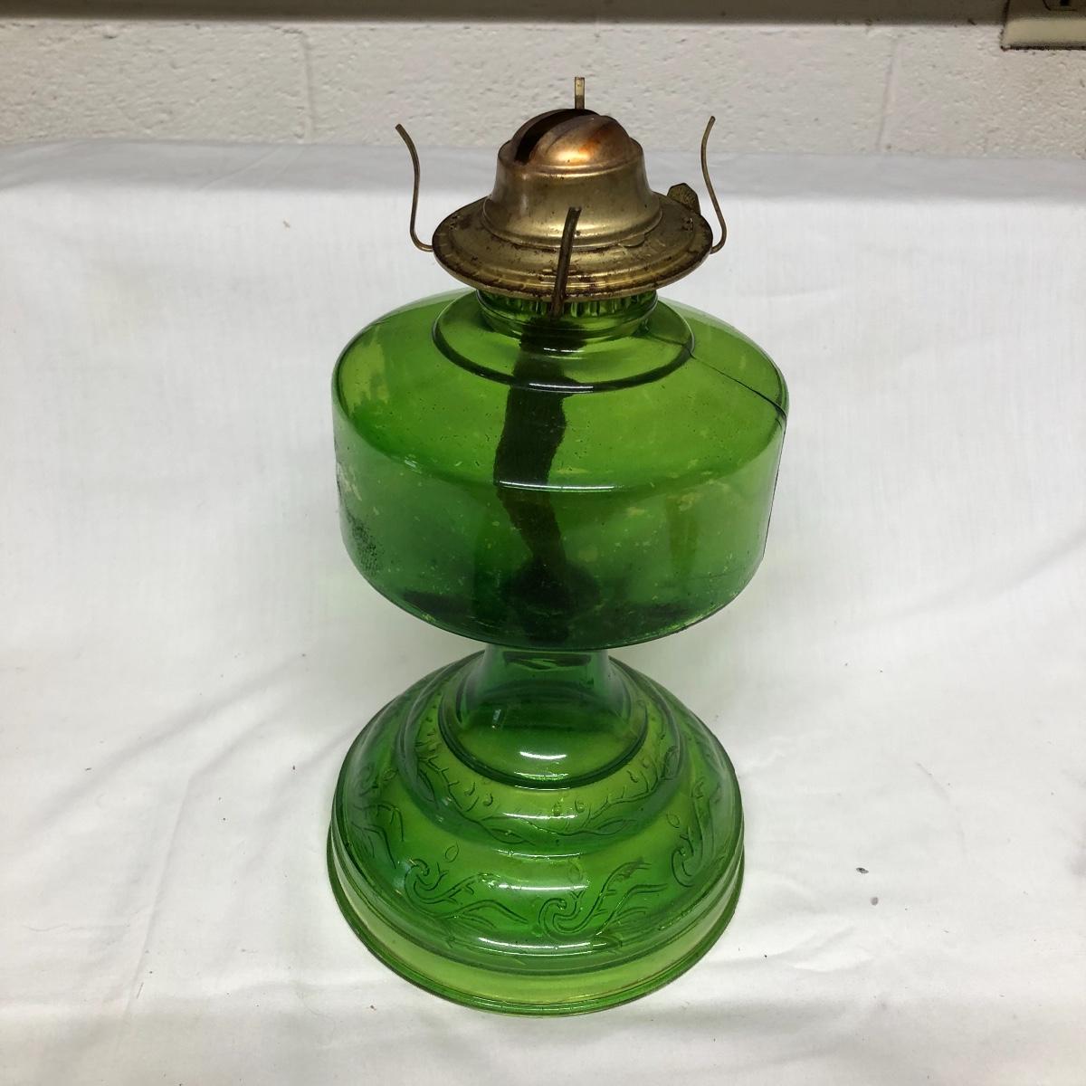Be ready for the next power outage with this trio of oil lamps. Red lamp is a Aladdin brand with glass and a extra wick holder and the two green ones are unmarked and have only one glass. Aladdin lamp measures 24” tall with glass.