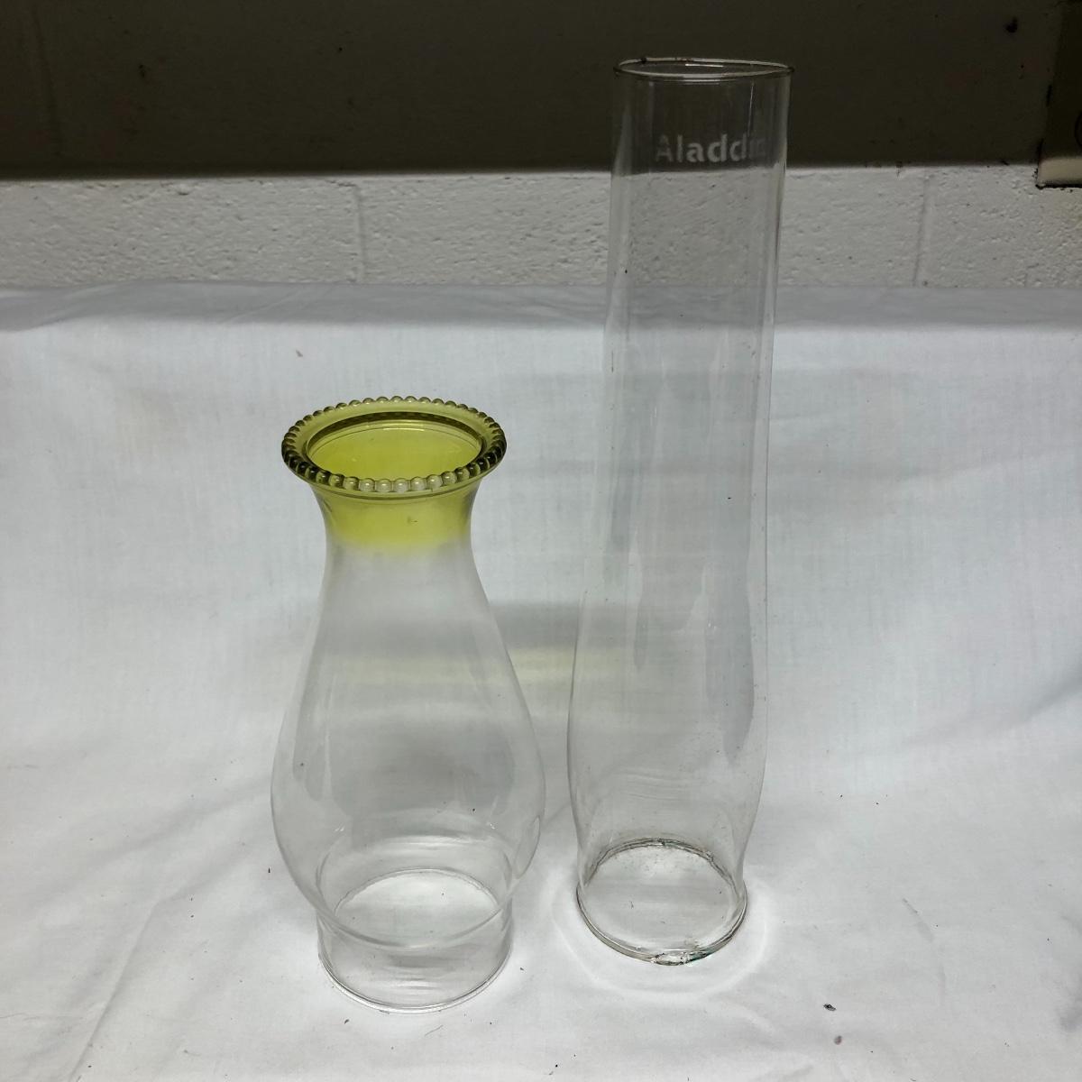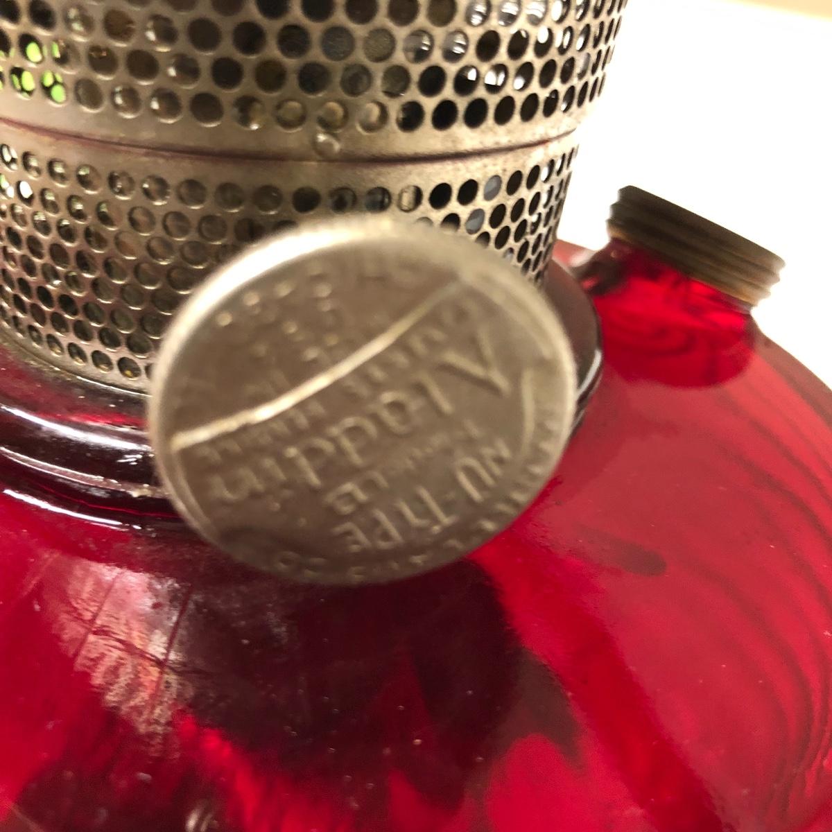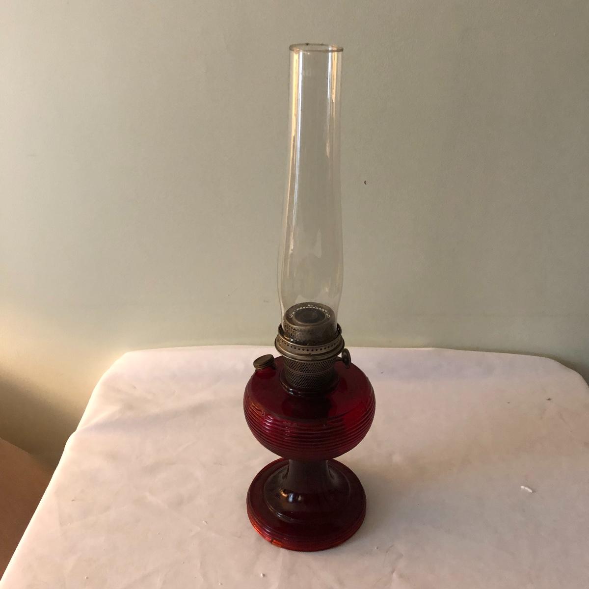 Be ready for the next power outage with this trio of oil lamps. Red lamp is a Aladdin brand with glass and a extra wick holder and the two green ones are unmarked and have only one glass. Aladdin lamp measures 24” tall with glass.