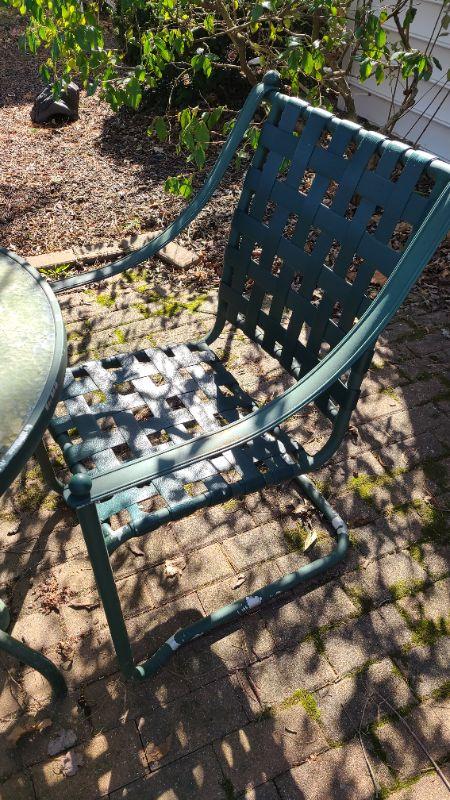 Glass top table with umbrella and chairs. Chairs show wear but are fully functional with cushions. Pictures are the best representation of the items listed and items are untested unless indicated in description. Thank you for looking and have fun bidding!