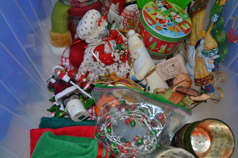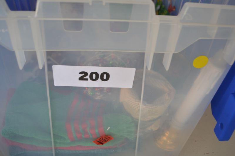 LOT 200 PLASTIC TUB WITH CHRISTMAS DECORATIONS