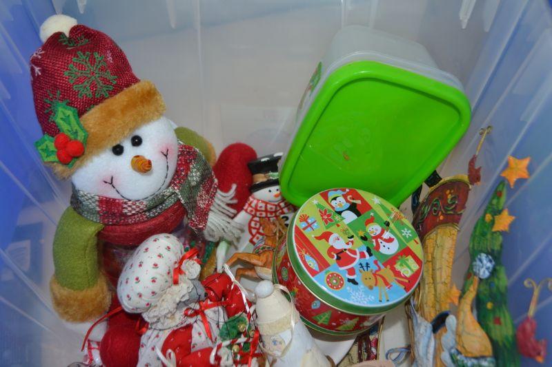 PLASTIC TUB WITH CHRISTMAS DECORATIONS