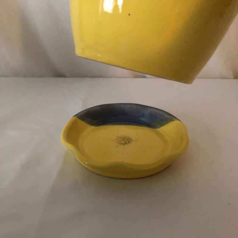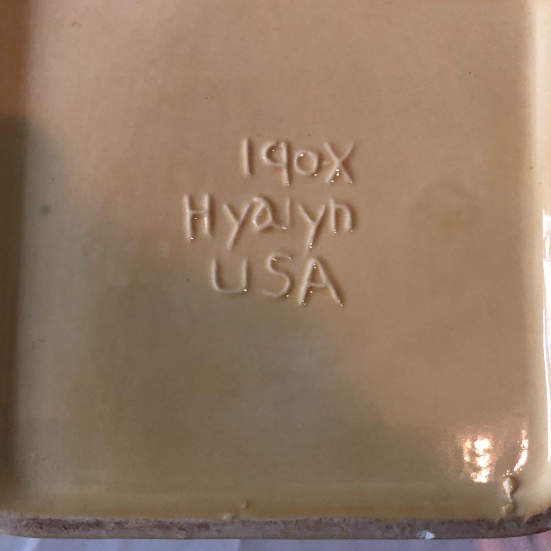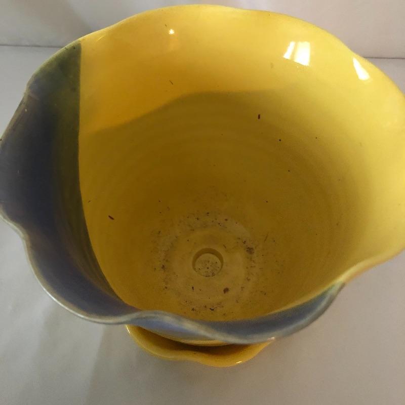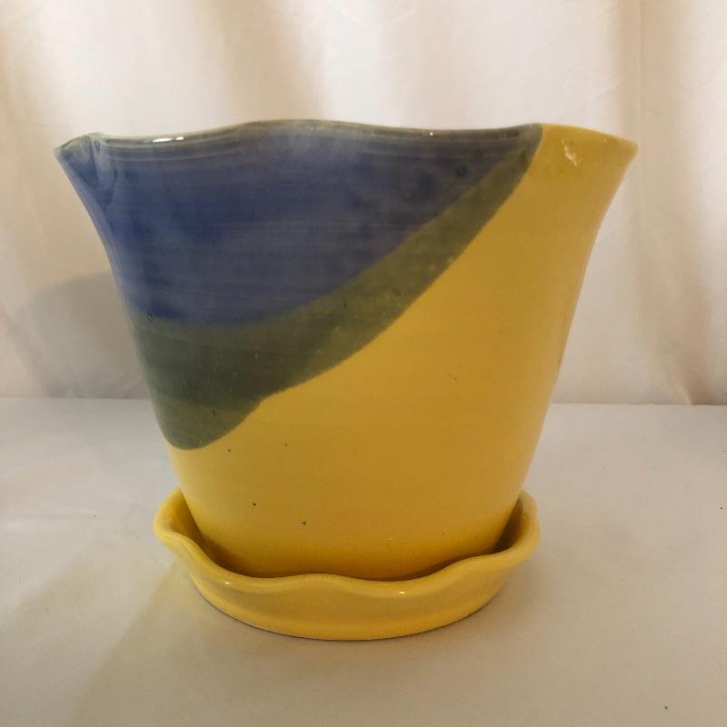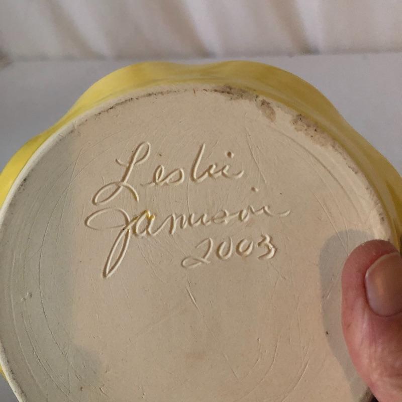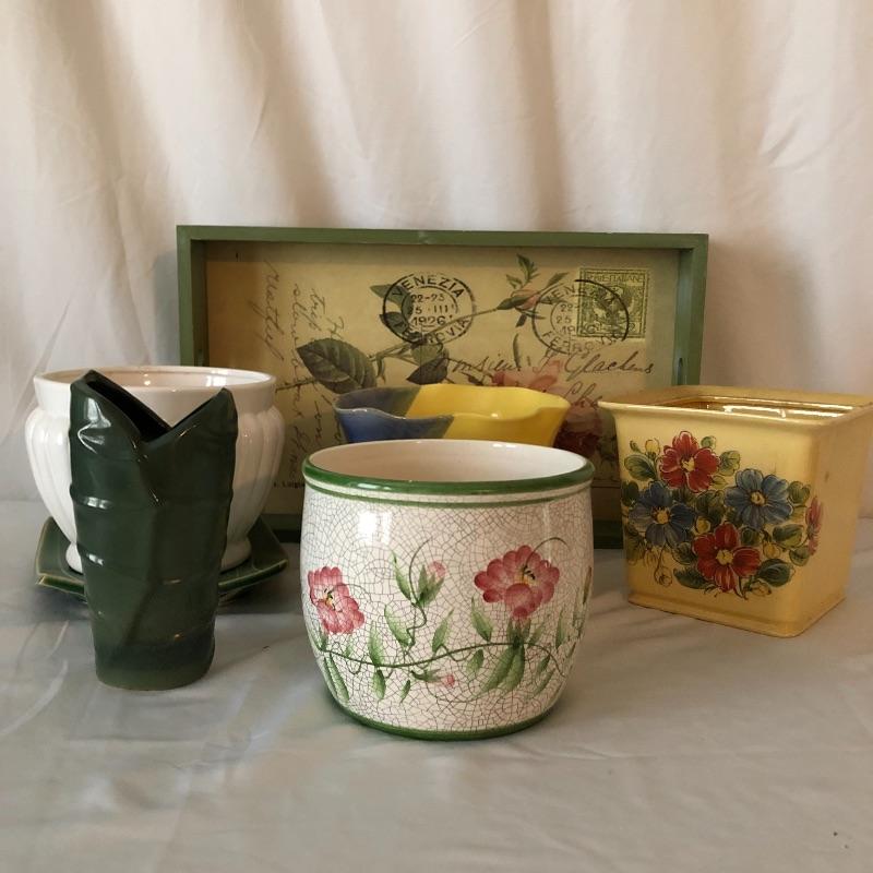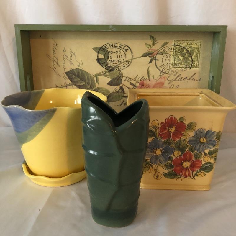 Four planters, a vase and a floral tray make up this pretty lot. The two yellow planters are both signed; the floral one signed 190x Hyalyn, the other Leslie Jameson, this one measures 7.25” diameter x 6” tall.