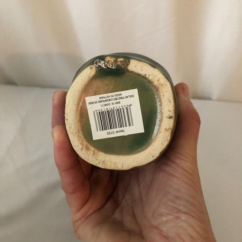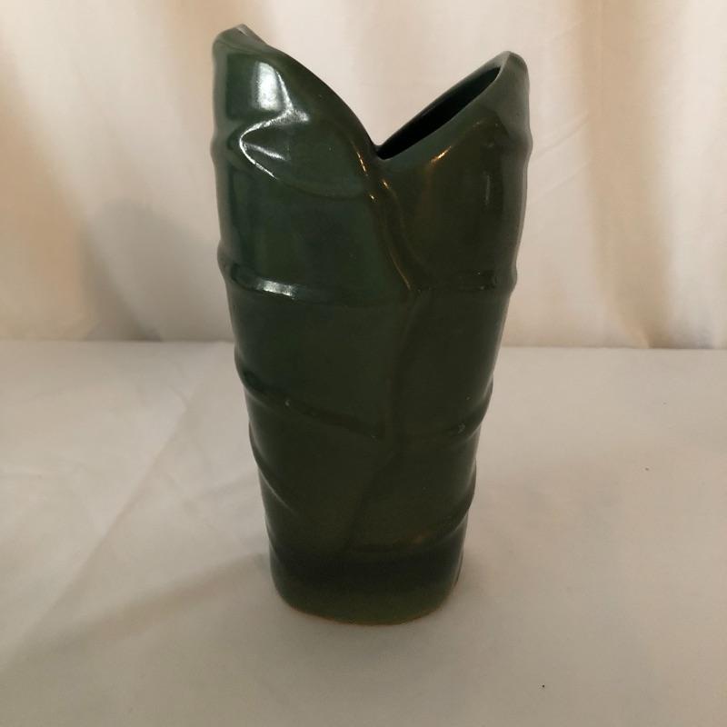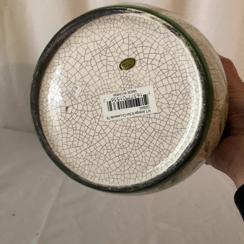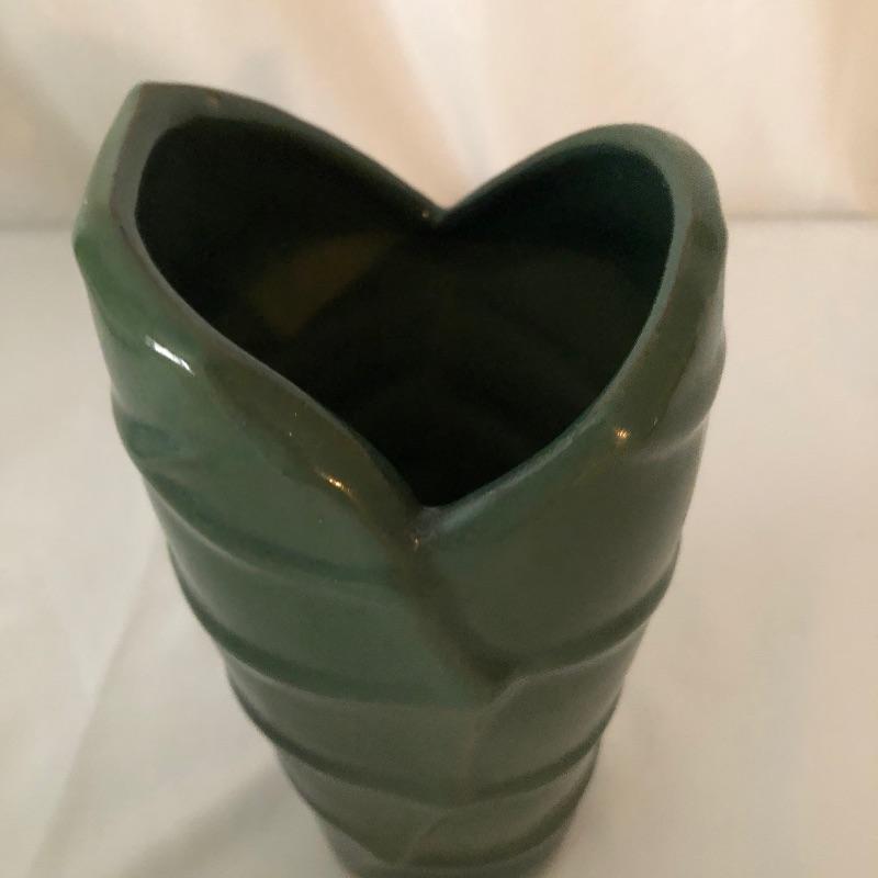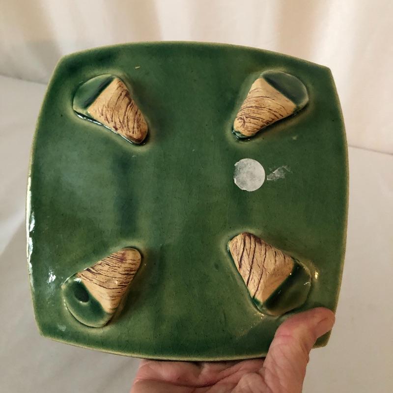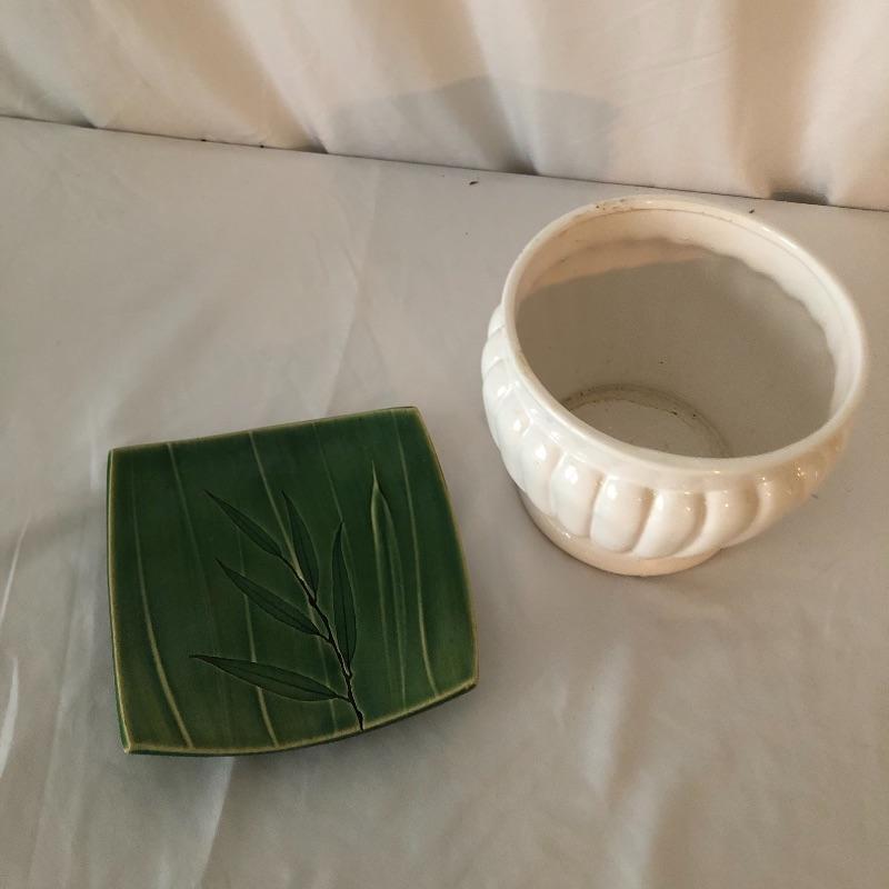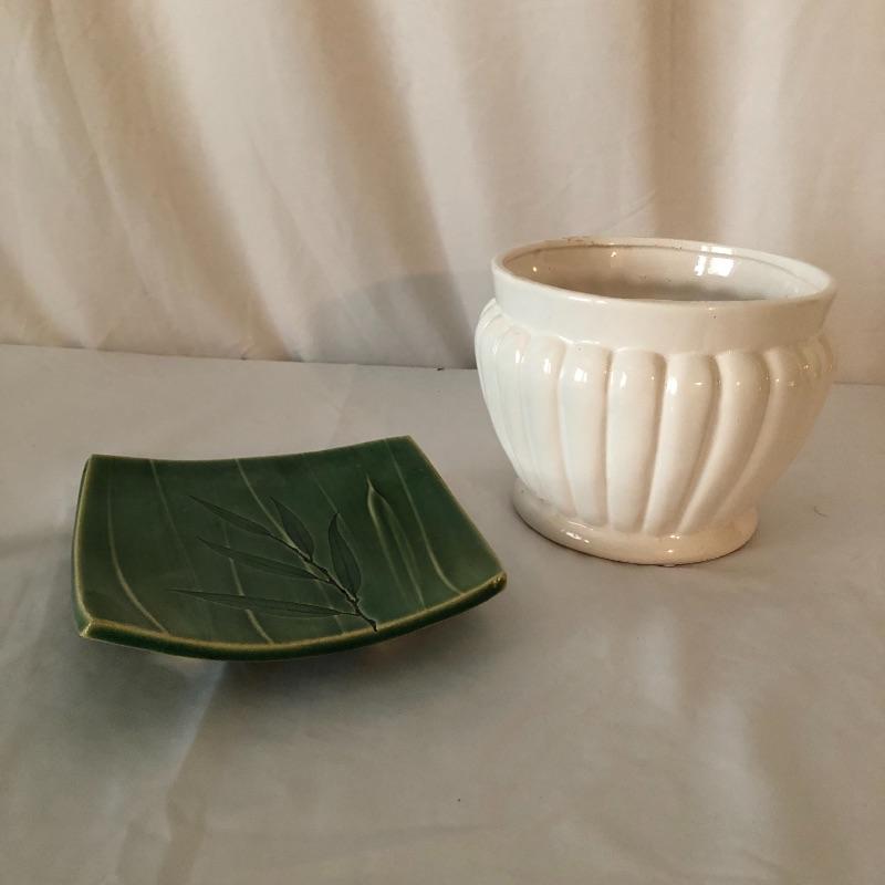 Four planters, a vase and a floral tray make up this pretty lot. The two yellow planters are both signed; the floral one signed 190x Hyalyn, the other Leslie Jameson, this one measures 7.25” diameter x 6” tall.