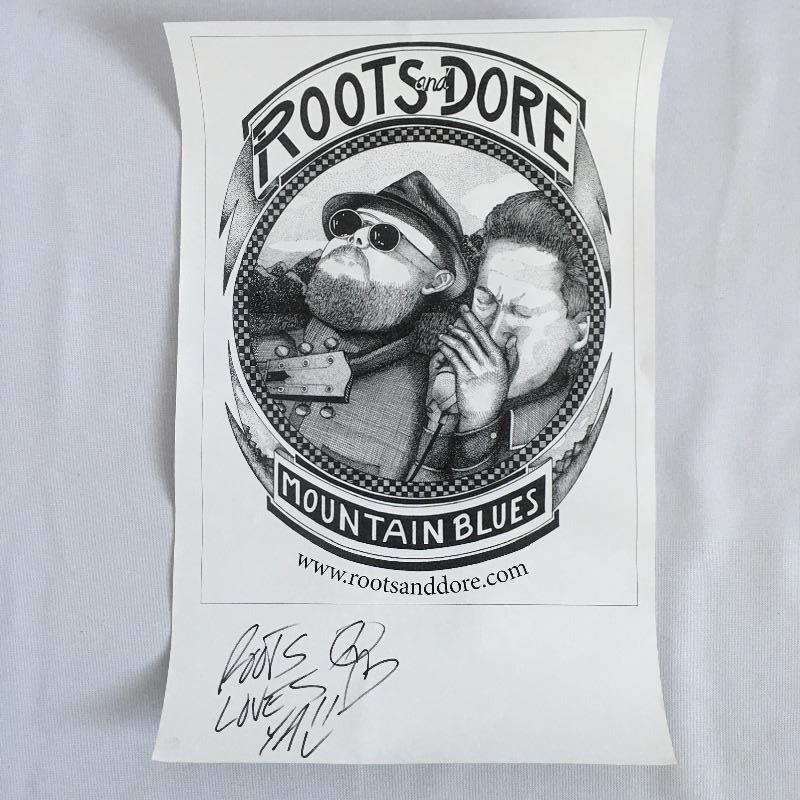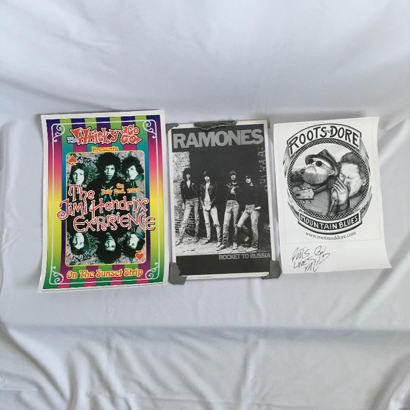 Rock posters include Ramones Rocket to Russia, The Jimmy Hendrix Experience and a signed Roots and Dore poster. Ramones poster is in a plastic sleeve. Jimmy Hendrix poster measures 13.5” x 19.75”.