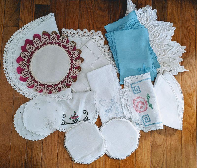 Mixed 21 pc lot of antique linens featuring lace doilies, tatting, crochet, cross-stitch, embroidery.