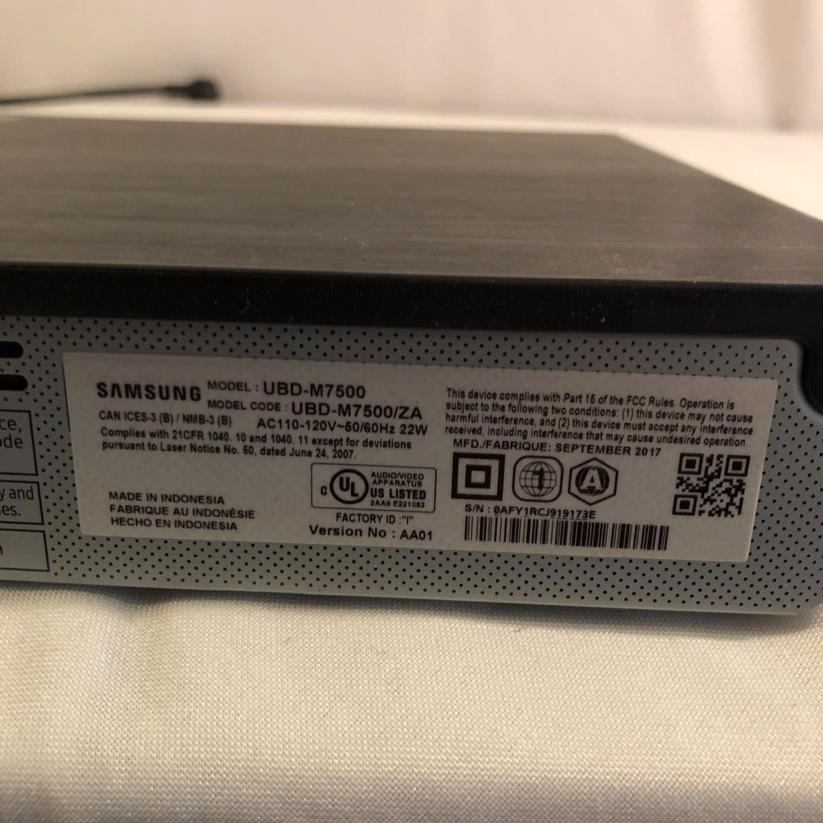Watch your movies with this Samsung Model #UBD M7500 Blu-Ray player. Player powered on when tested and includes remote. Player measures 9” x 16” x 1.5”.