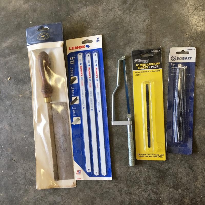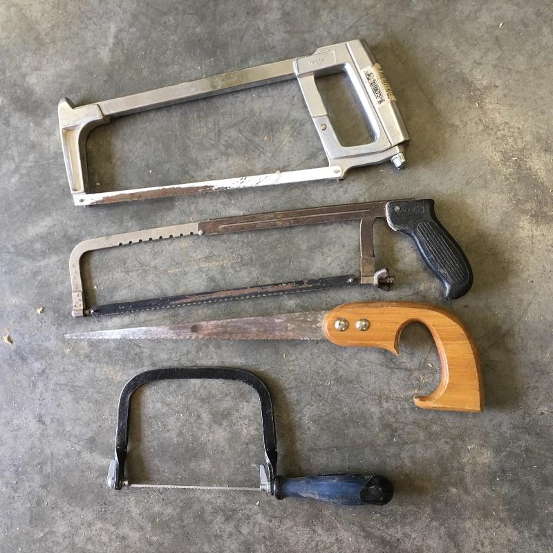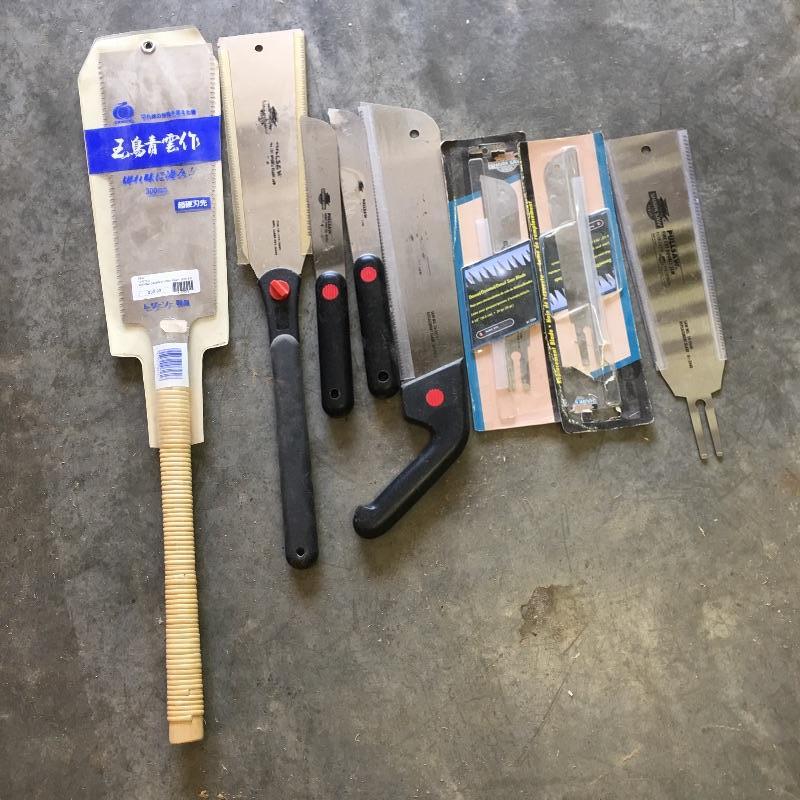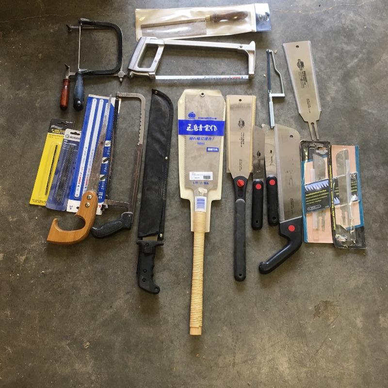 Collection of hand saws includes hacksaws, coping saw, machete, ryoba saw, double blade saw and more.