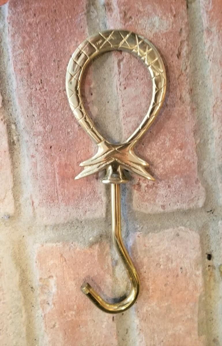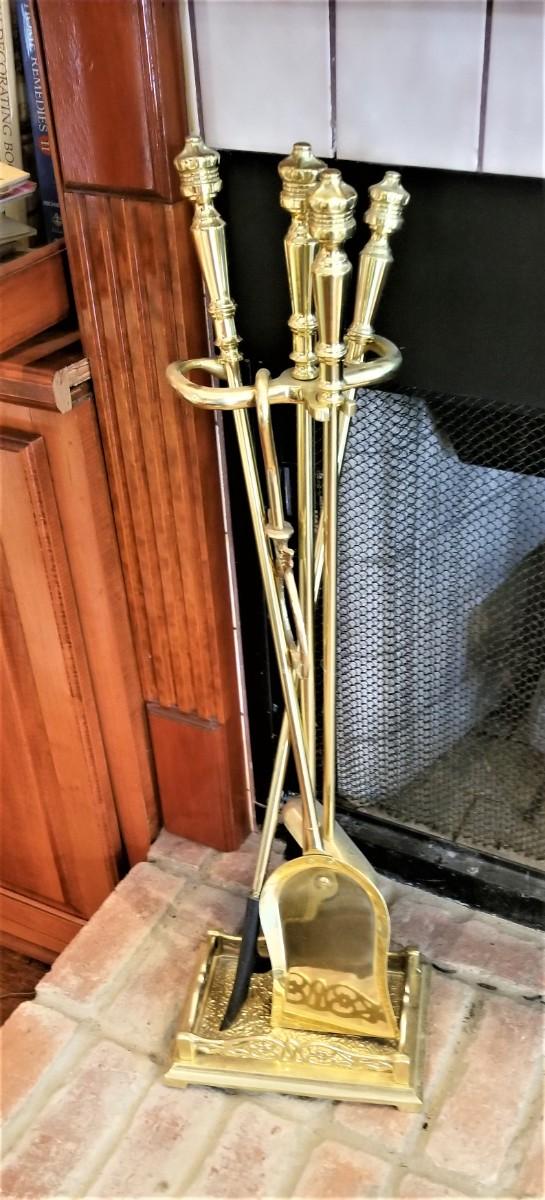 Nice (heavy) solid brass fireplace tool set - 4 pieces plus the flue pull. About 32" tall. Good used condition.