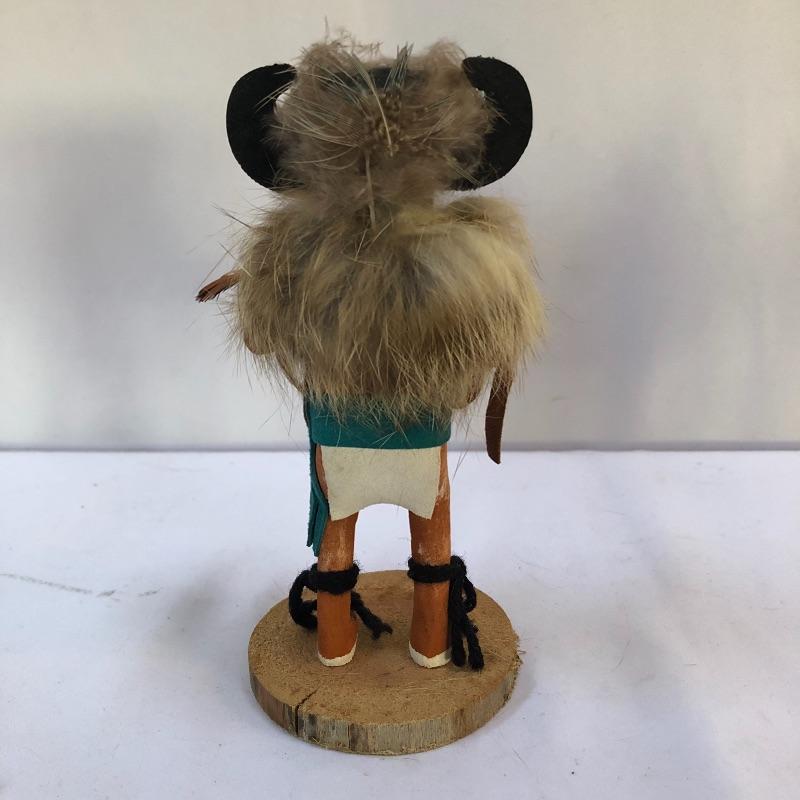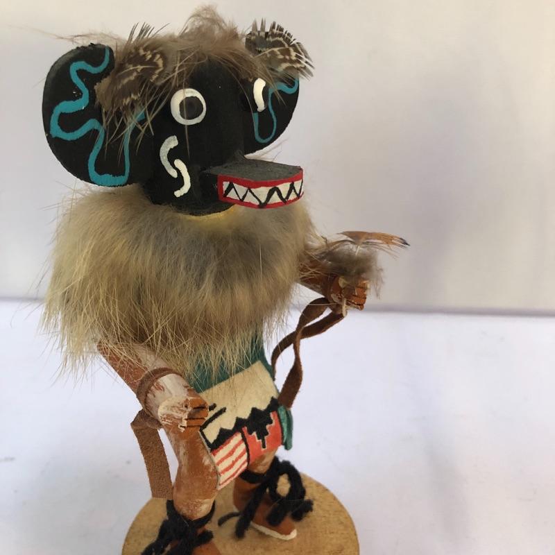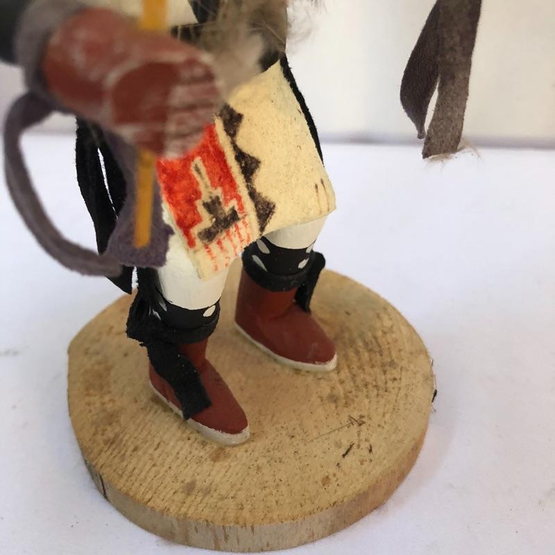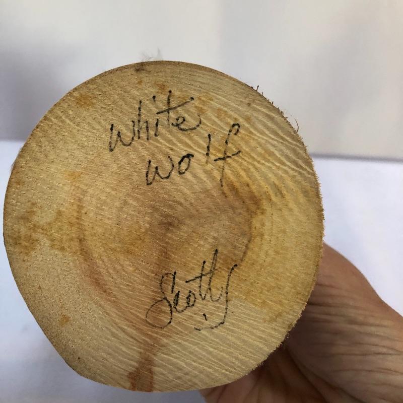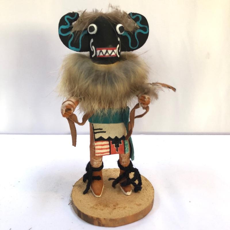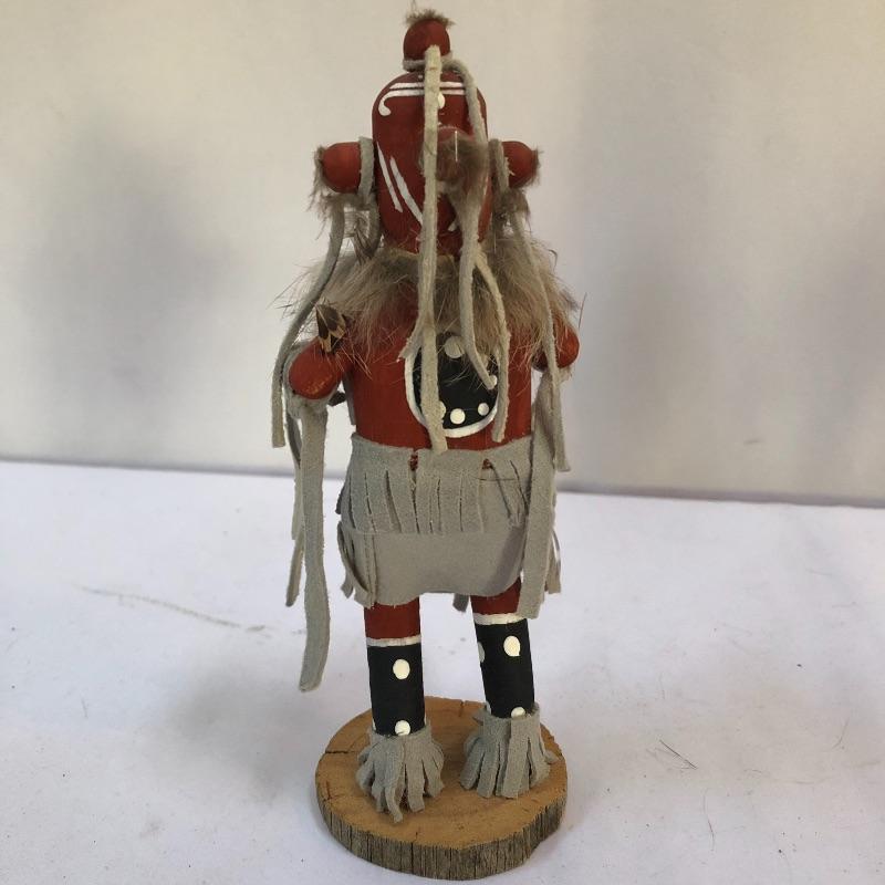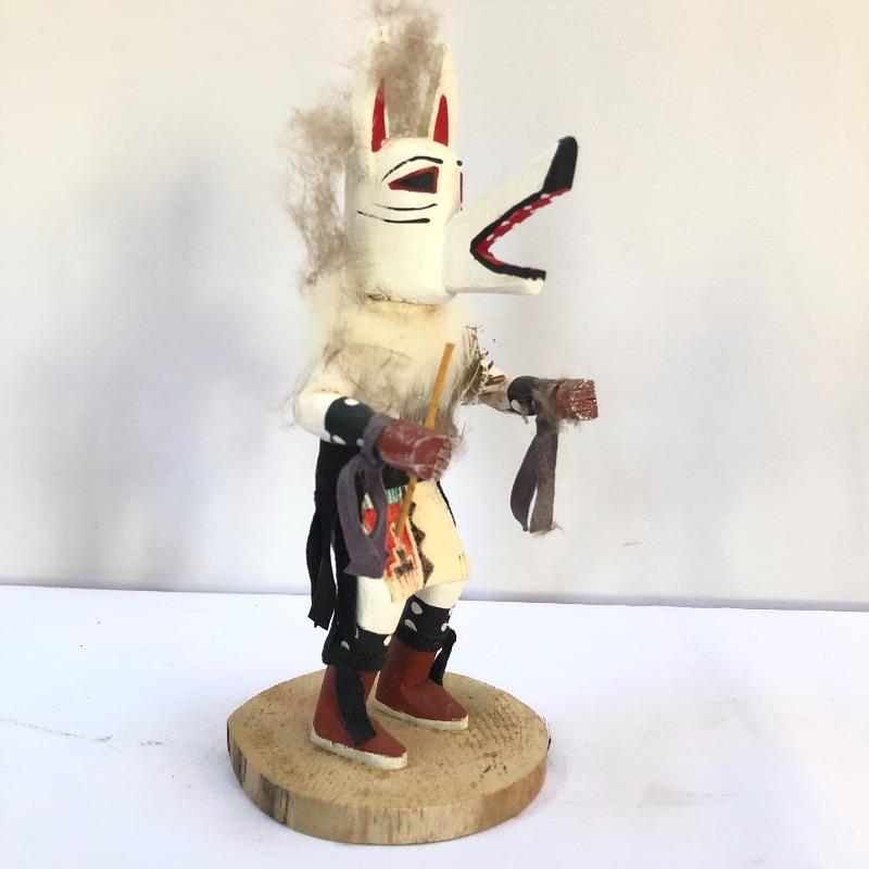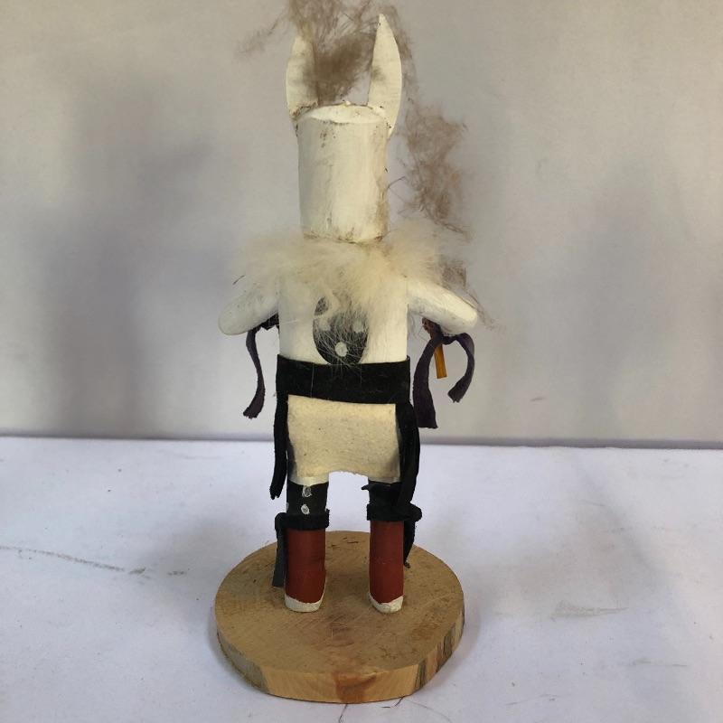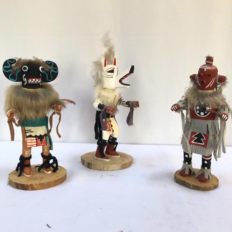 Symbols of future abundance, these three Kachina dolls are beautifully crafted. Each one is mounted on a slice of wood and all three are signed. The white wolf measures 7.5” tall.