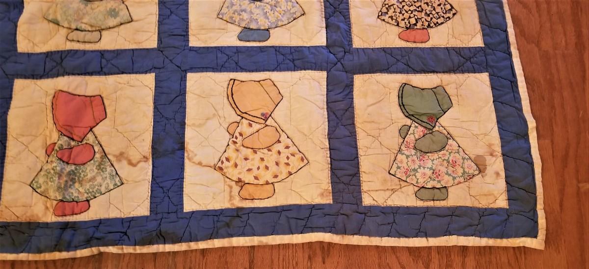 Vintage Sunbonnet Sue cotton handmade quilt - has been stored for awhile so you see the age spots. A good soak and wash will probably clean it right up - plain back. OR - use as a cutter for wall hangings, pillows etc. This is a good old one - so sweet. 76" long, 62" across. 30 squares. Please look at all the photos.