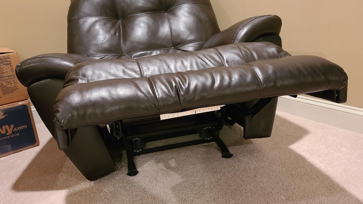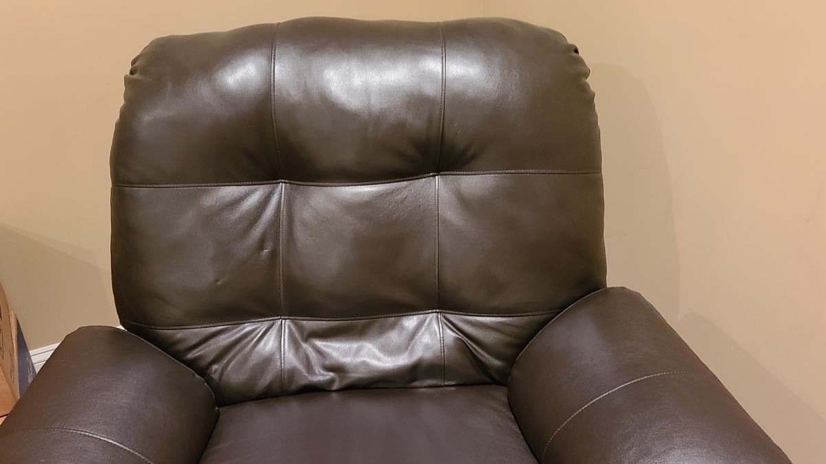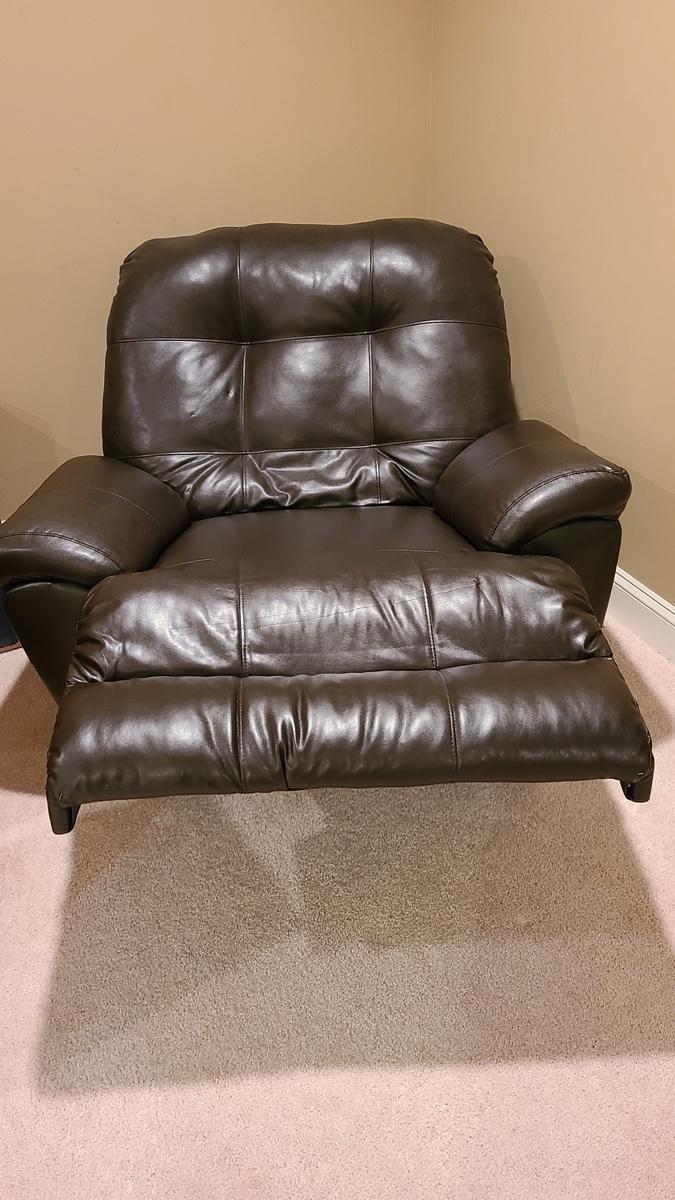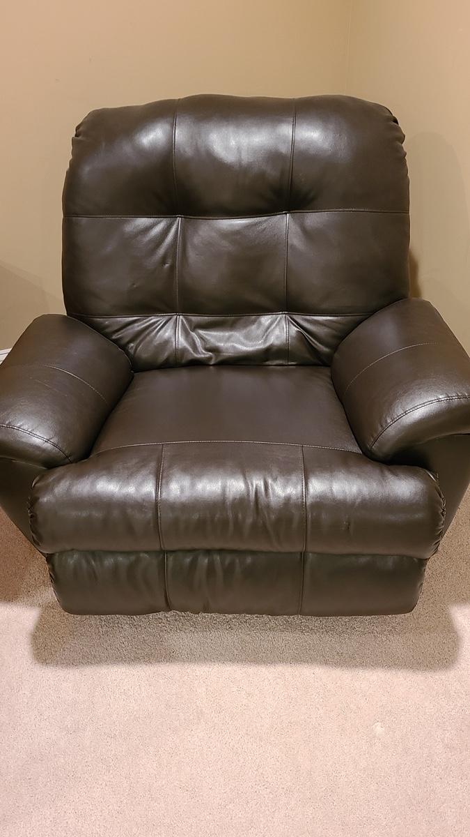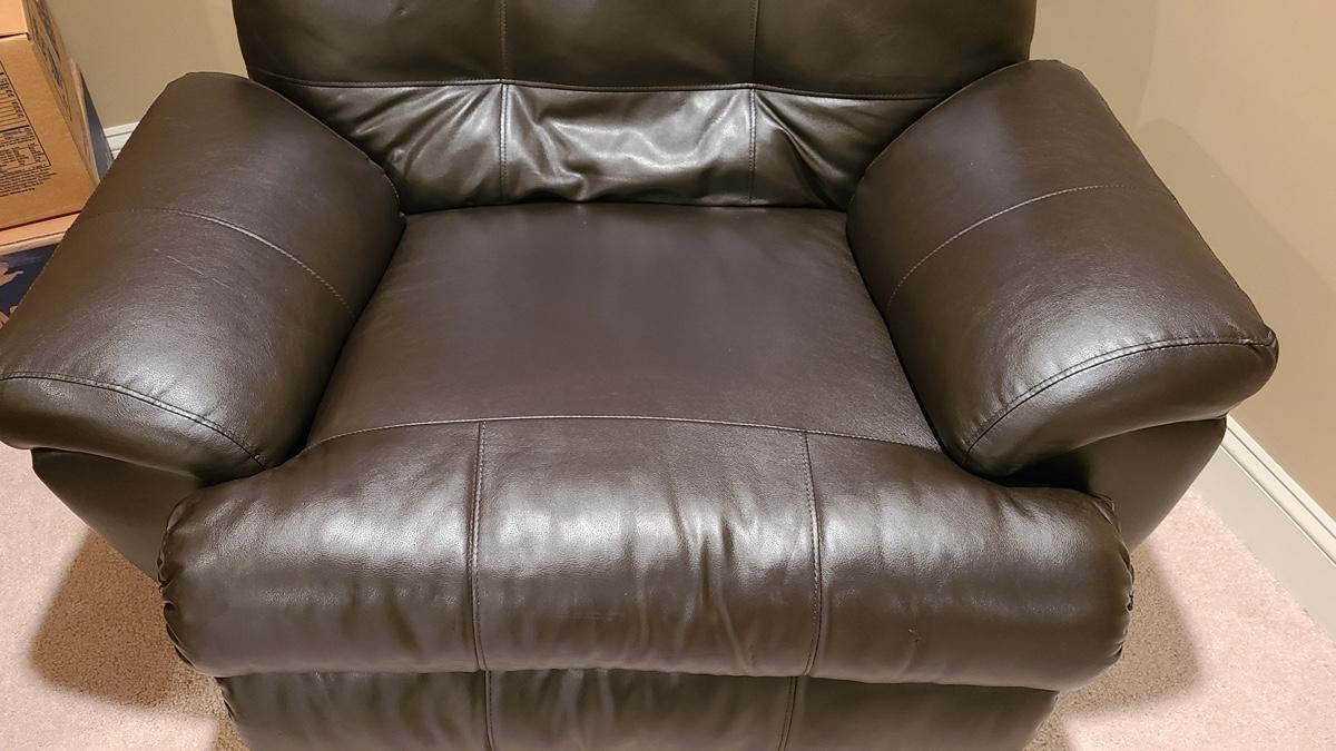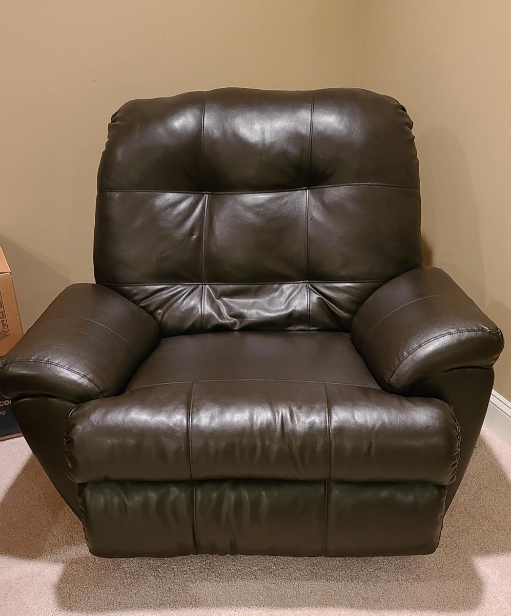 Nice comfortable recliner, it does have damage to the right arm and needs a repair. It leans to the right as the right arm is broken. Up-right it is not noticeable but reclining it is. In a basement will have to move up stairs yourself. Please see all pictures for content of the lot, condition of the lot, and measurements if taken. Pictures are the best representation of the items listed and items are untested unless indicated in description. Thank you for looking and have fun bidding!