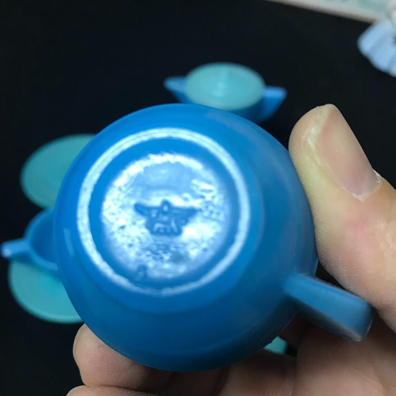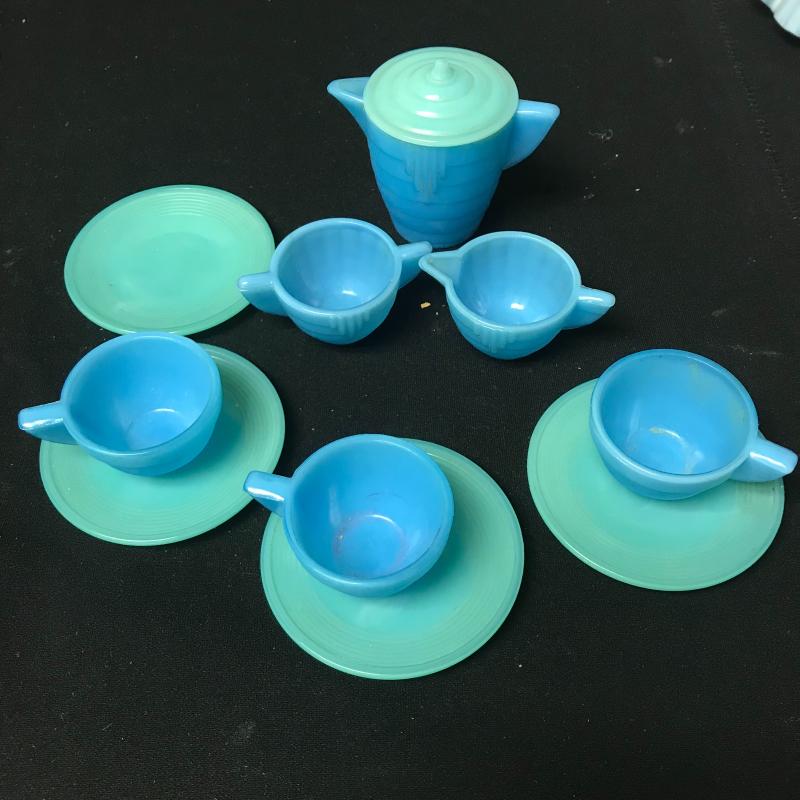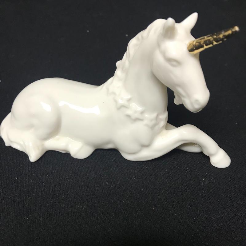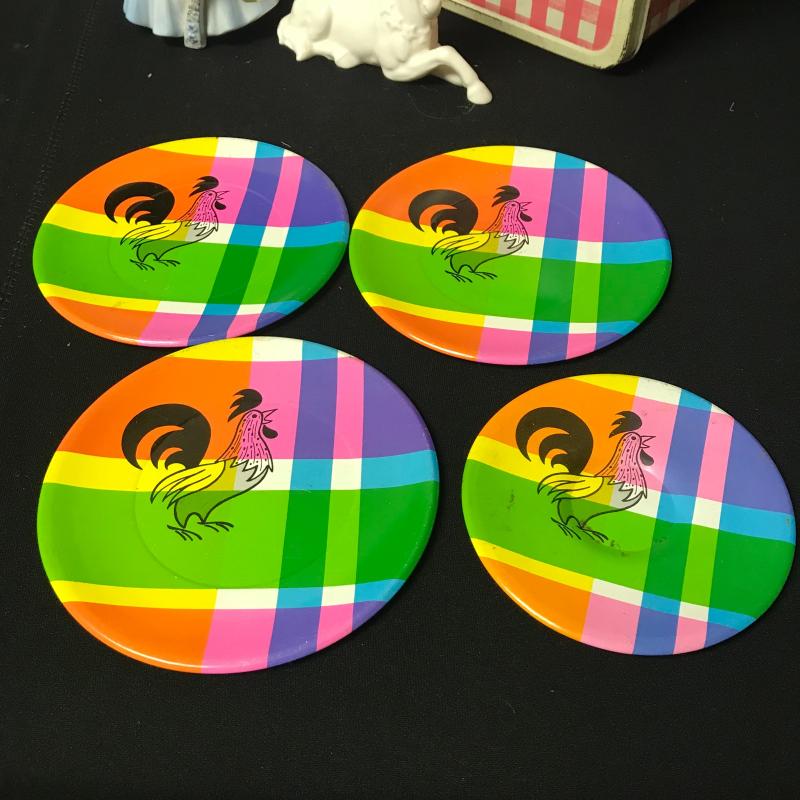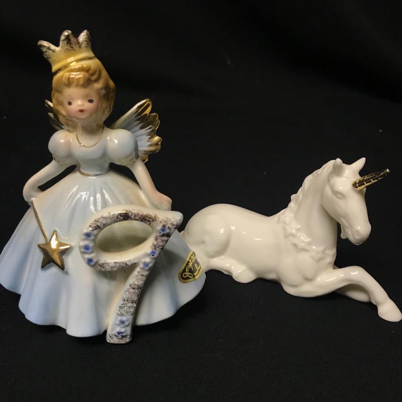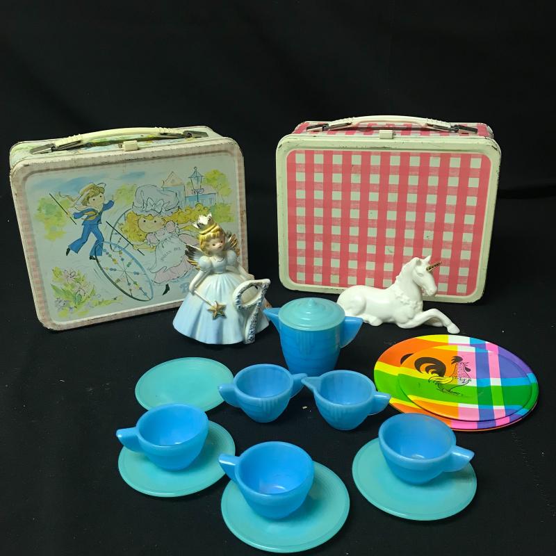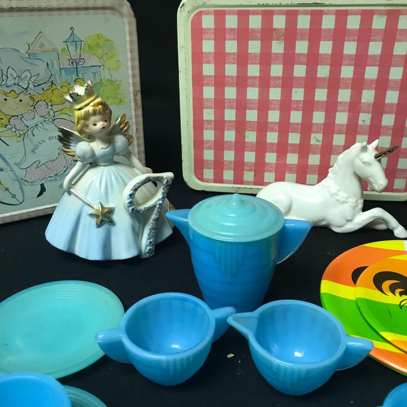 Milk glass toy tea set with one missing cup. Also includes Tin rooster plates, two thermos lunch boxes (one is Poly Pal!) and two ceramic pieces. A Unicorn and a Princess with the number 9 (made by Josep Originals.) Shipping Available.