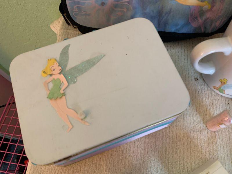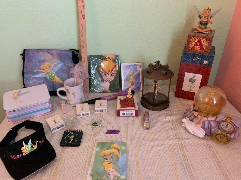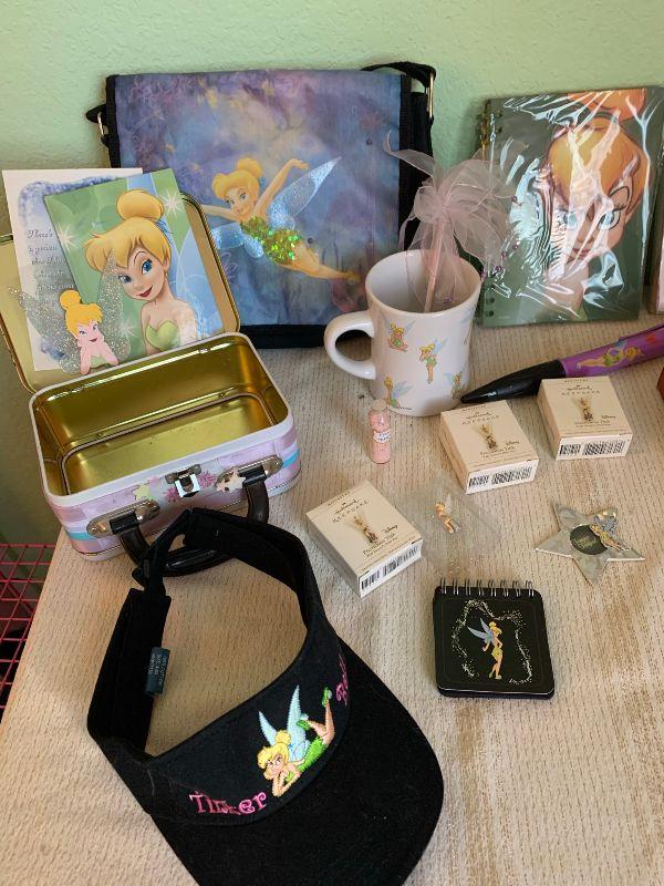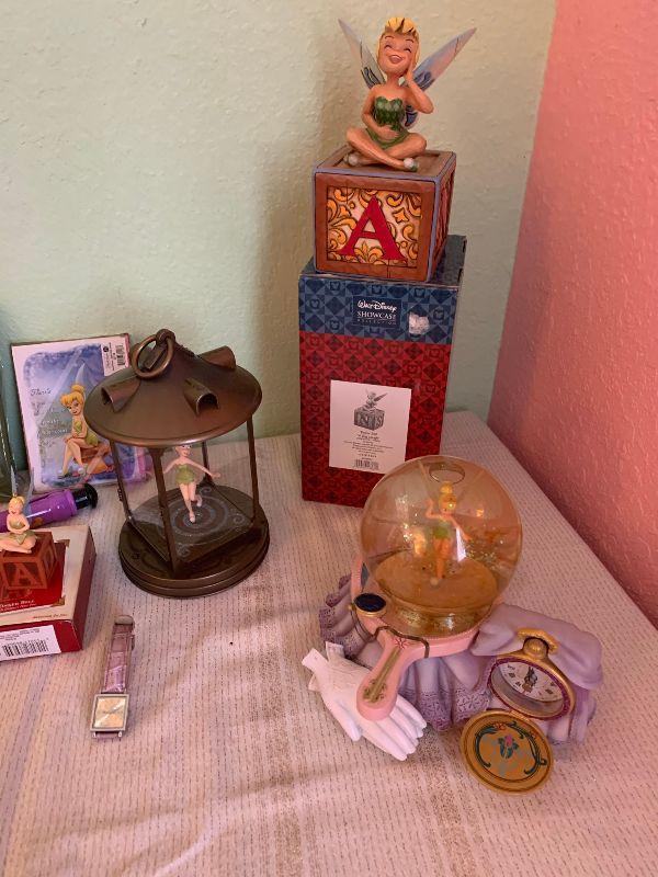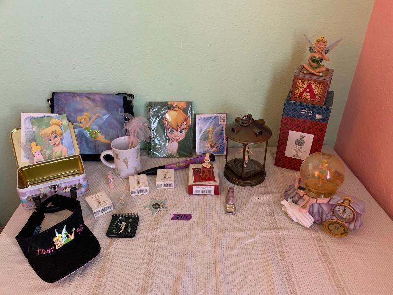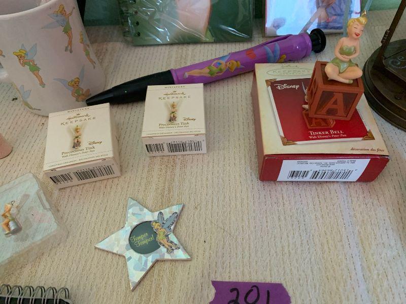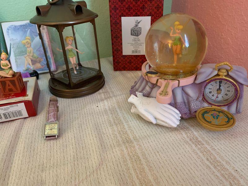 Tinkerbell Lot: hat, metal box, cup purse, 3 ornaments, pen, paper, products, journal, fairy dust, Watch, Light up musical lantern, Tinkerbell on block, Large globe and clock.