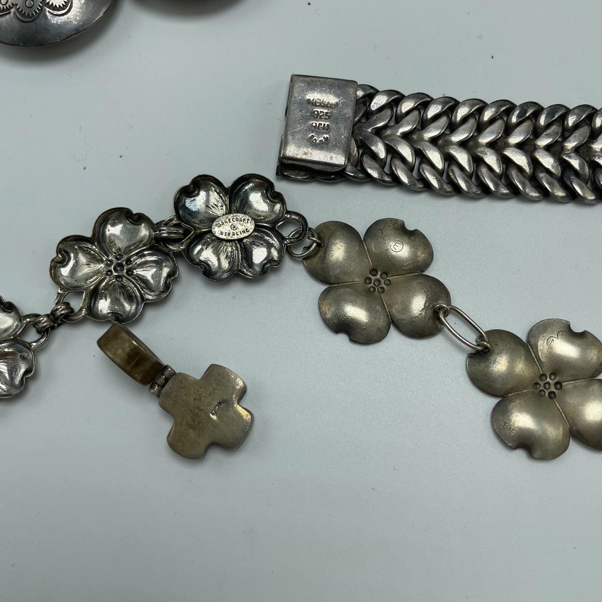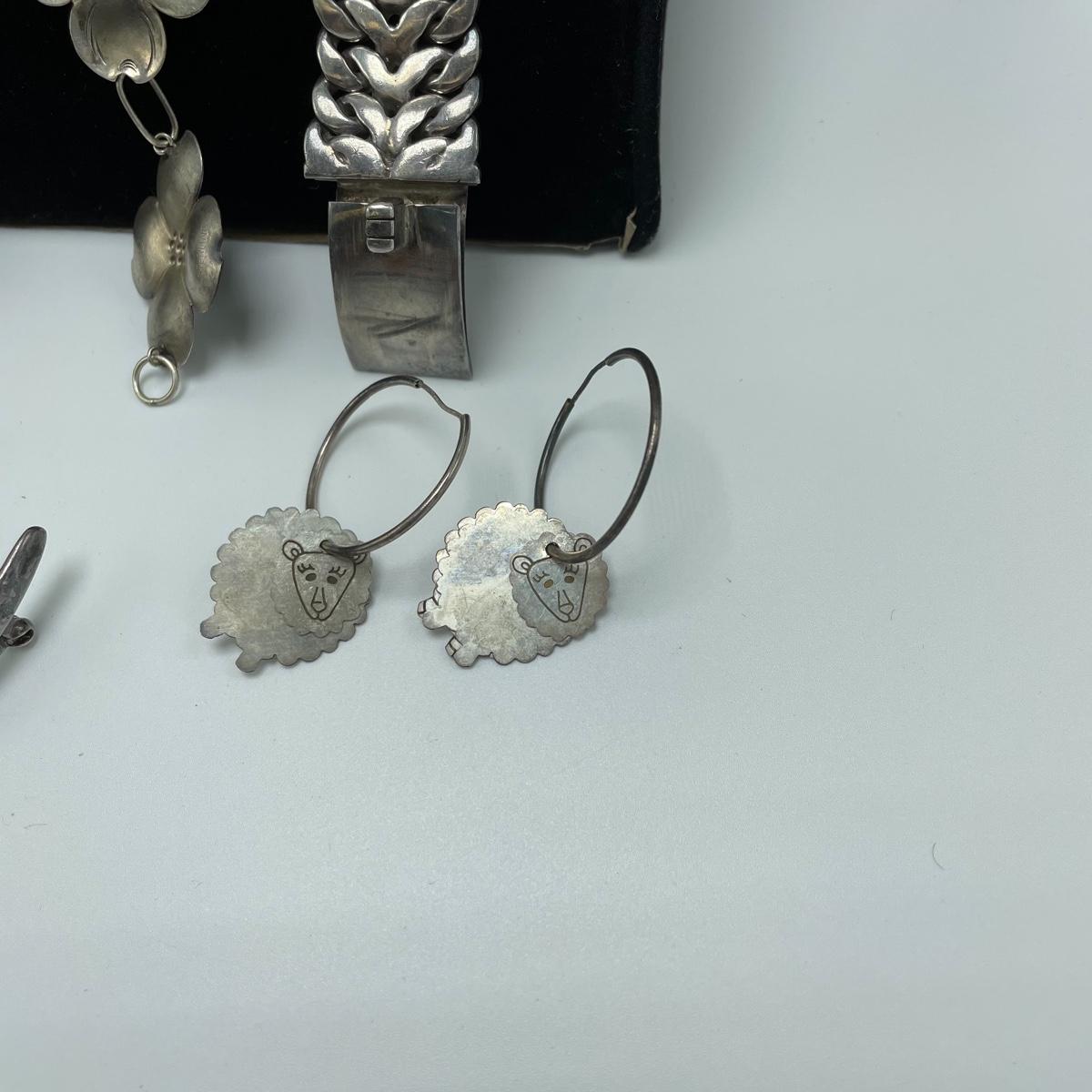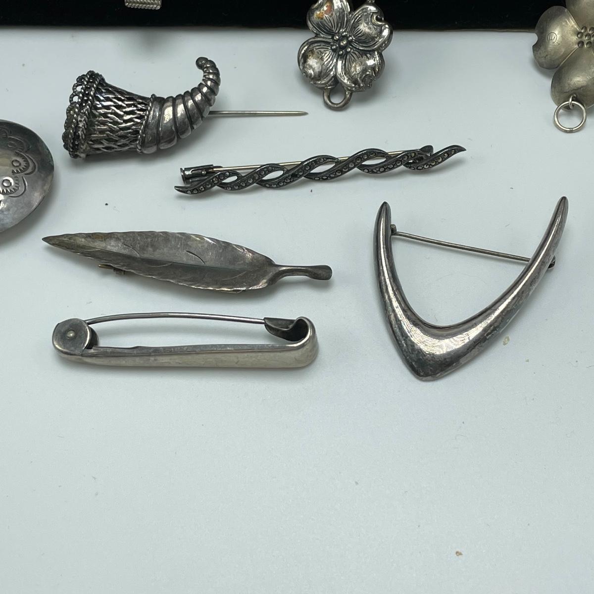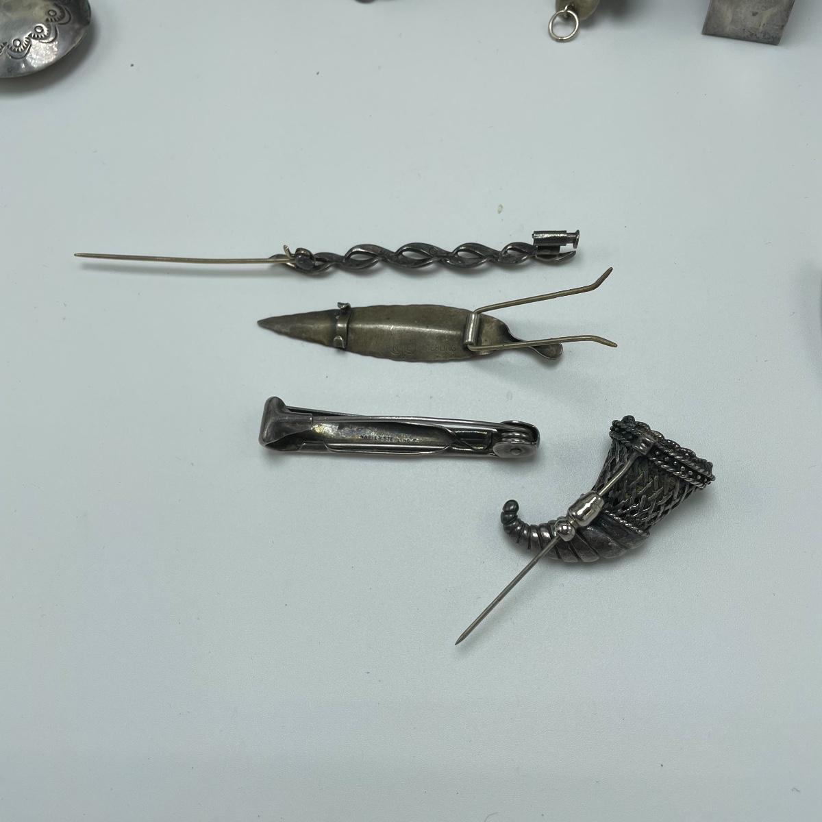 Bold and simple styles can be found in this collection of jewelry marked Sterling and 925. Lot features brooches, including on similar to the Star Trek icon. (Christmas is just half a year away!) Lot also contains a few chains, thick and thin, bold and whimsical bracelets, large and small earrings for pierced ears and one leaf designed clip earrings set. One small pendant is not marked, the chain it’s on is marked 925. See images. Bidding start price is at or near melt value. Shipping available.