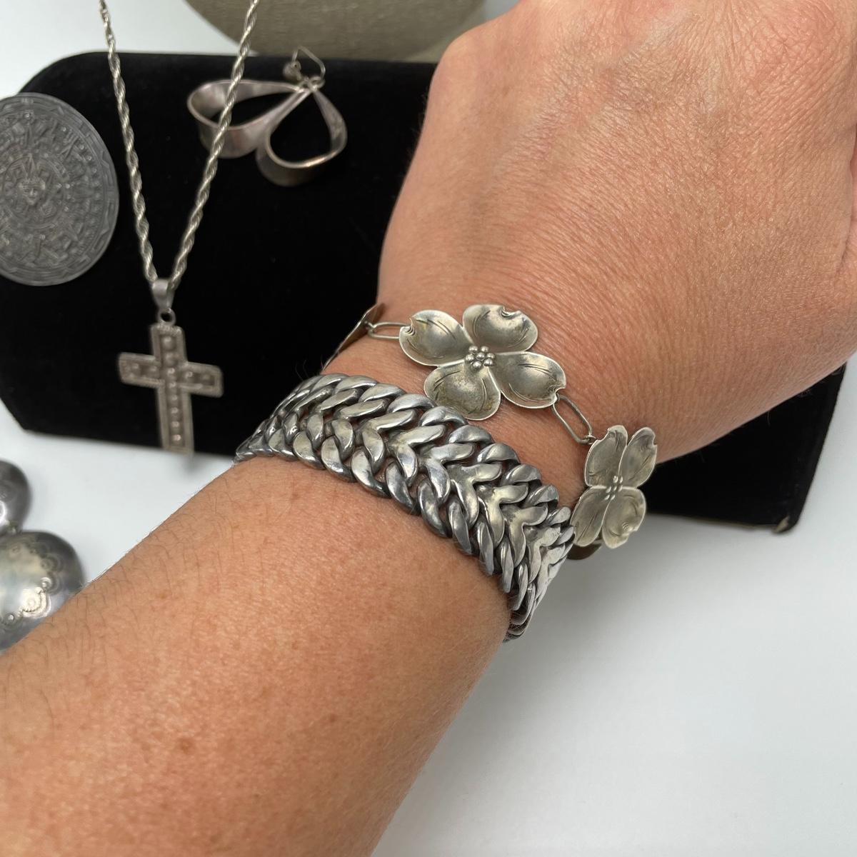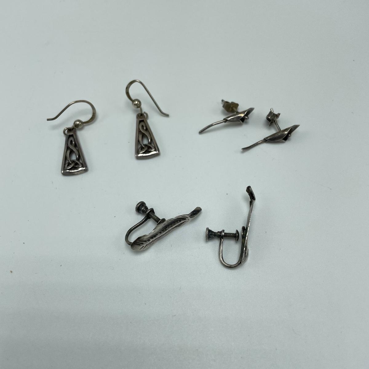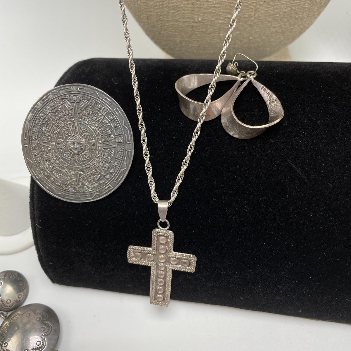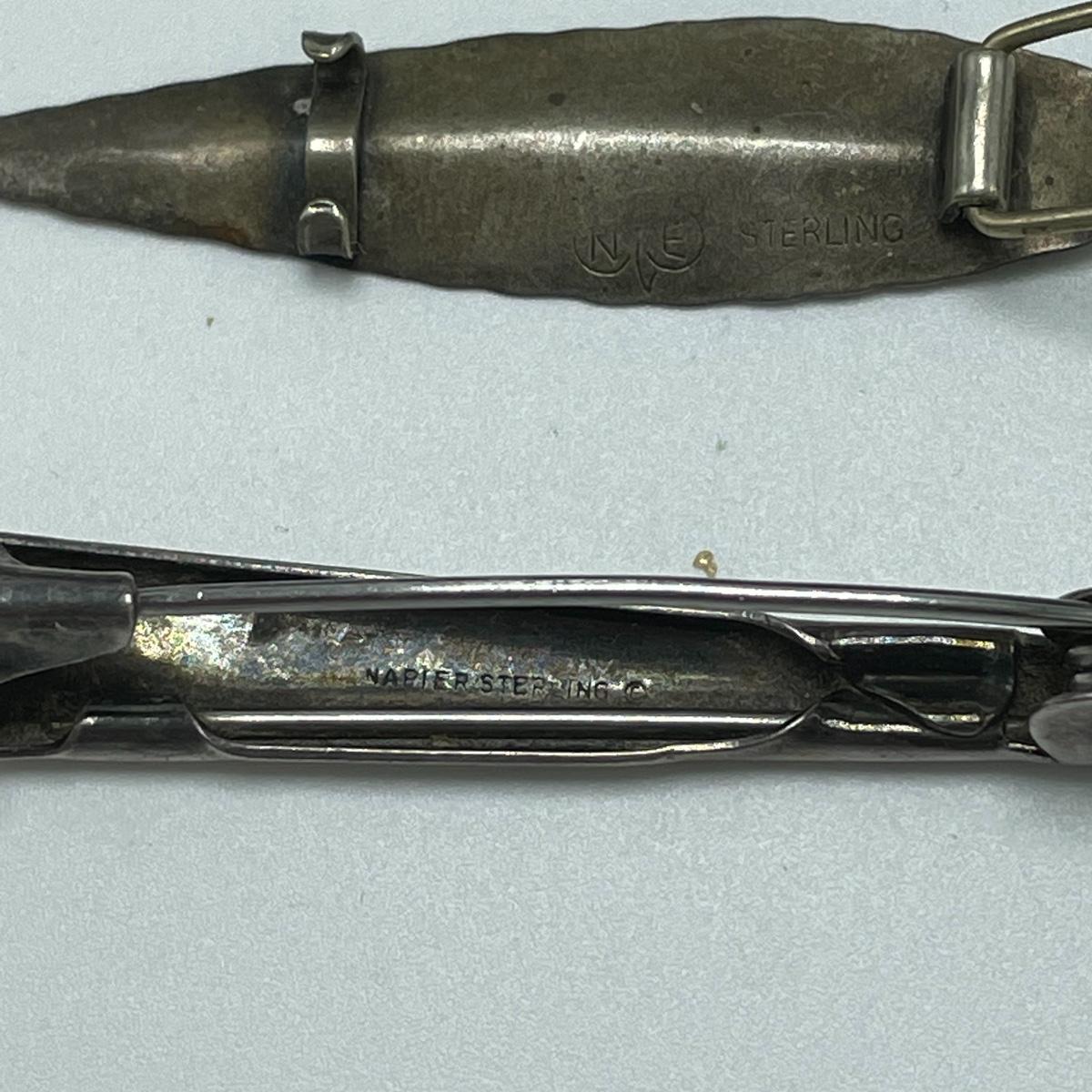 Bold and simple styles can be found in this collection of jewelry marked Sterling and 925. Lot features brooches, including on similar to the Star Trek icon. (Christmas is just half a year away!) Lot also contains a few chains, thick and thin, bold and whimsical bracelets, large and small earrings for pierced ears and one leaf designed clip earrings set. One small pendant is not marked, the chain it’s on is marked 925. See images. Bidding start price is at or near melt value. Shipping available.