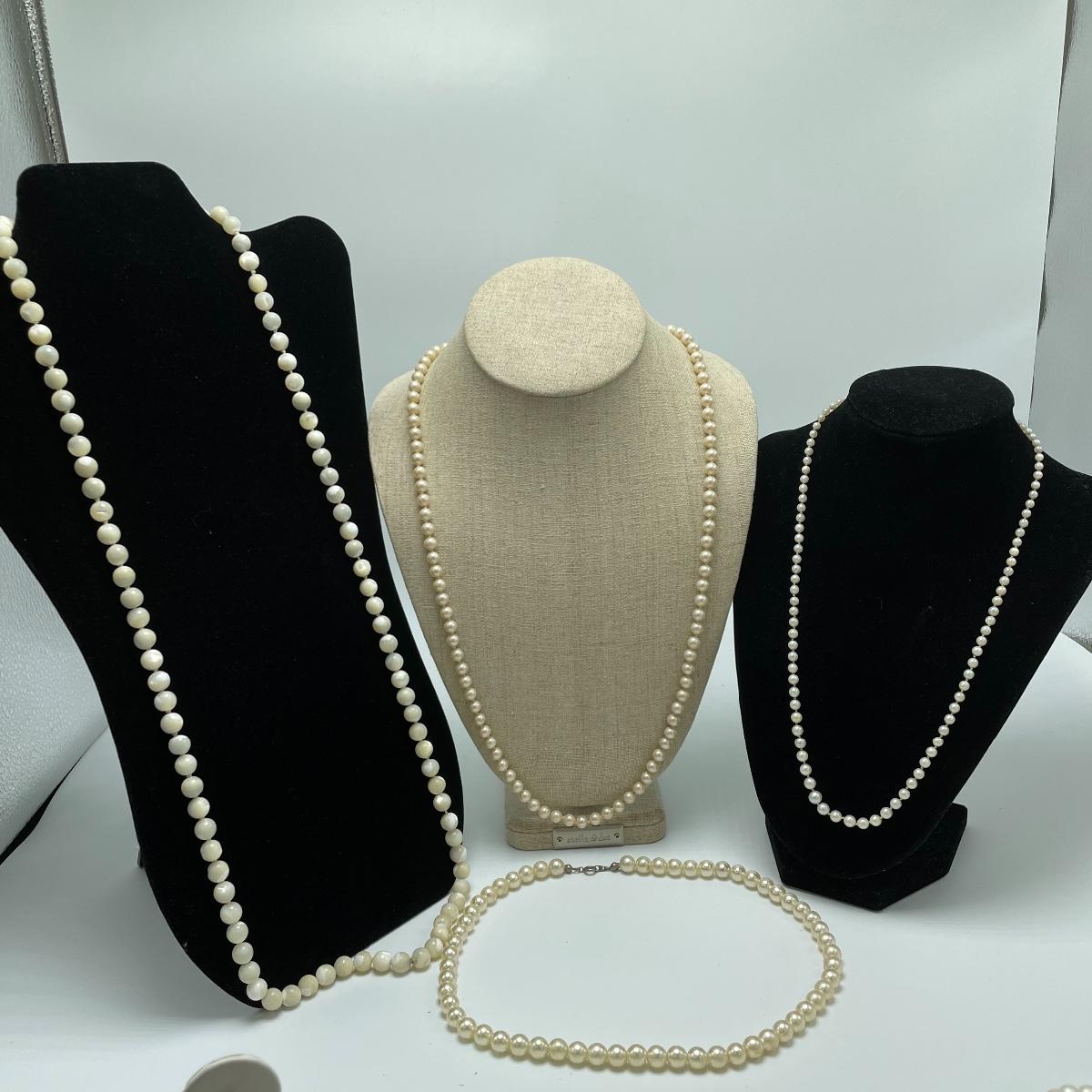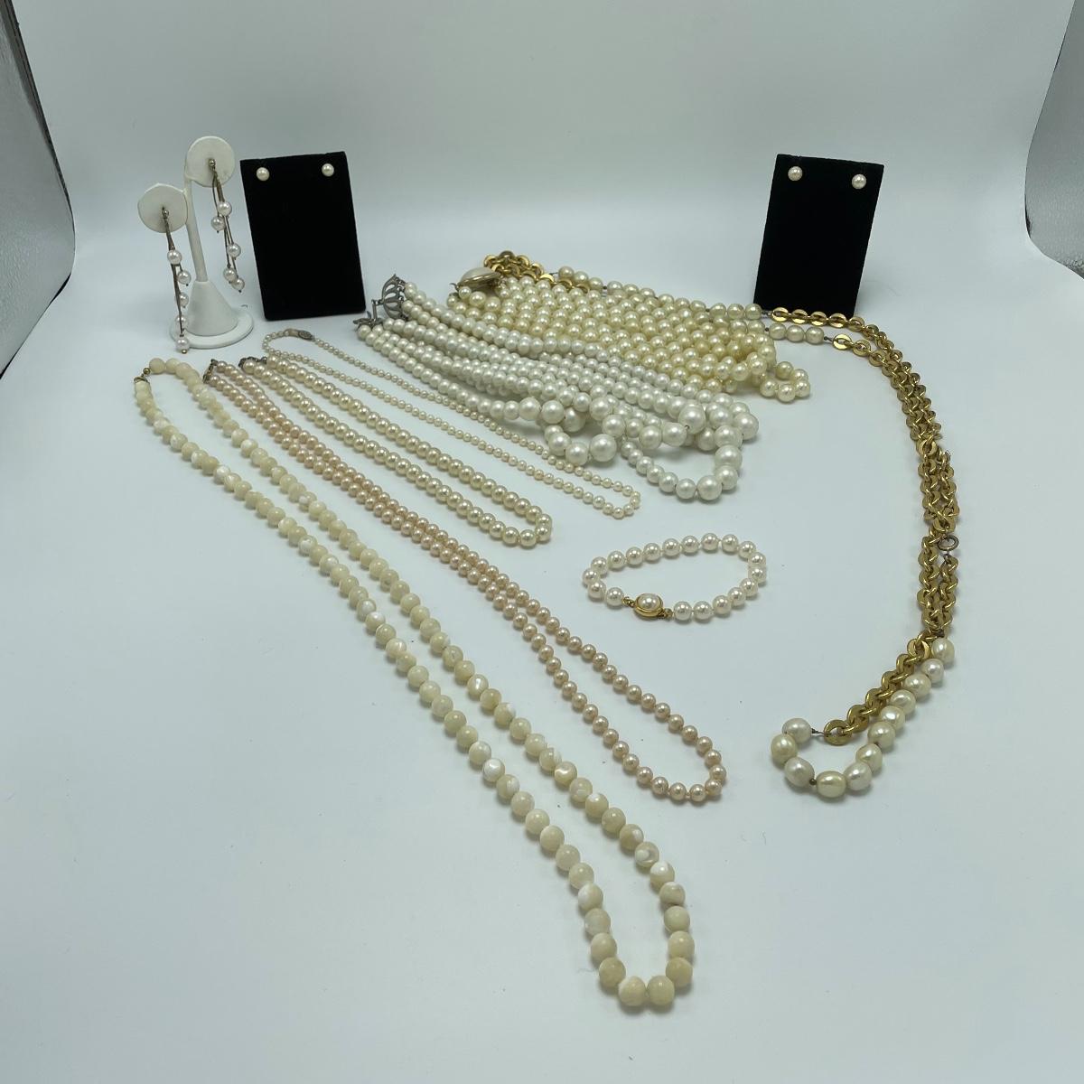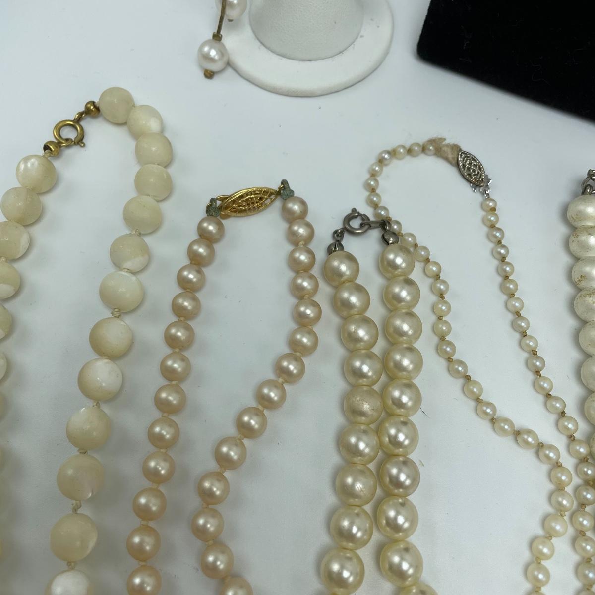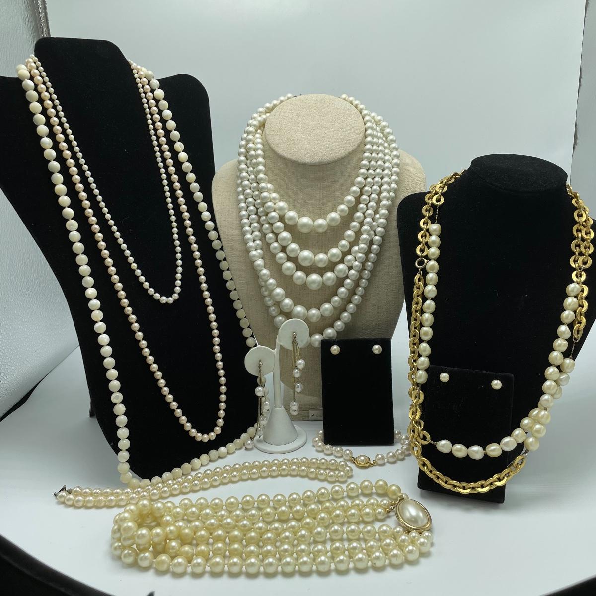 We’ve got your pearly infatuation covered here! Lot features a bracelet, two studs and a dangle pair of earrings and seven necklaces! The necklaces vary from modern to vintage styles and colors vary from traditional cream to pink to white and even a stunning cloudy colored pearl necklace. See images. Shipping available.