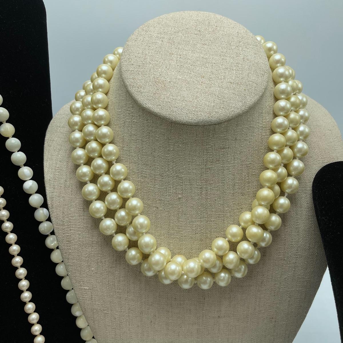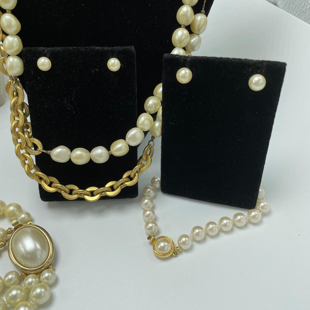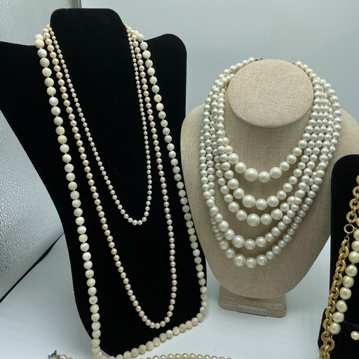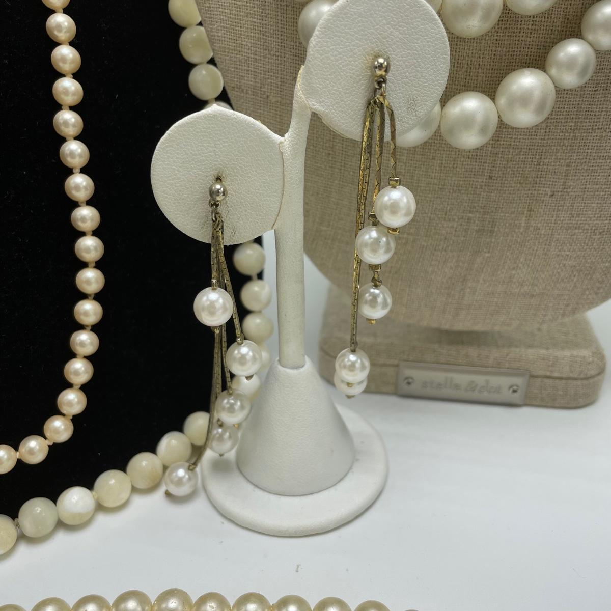 We’ve got your pearly infatuation covered here! Lot features a bracelet, two studs and a dangle pair of earrings and seven necklaces! The necklaces vary from modern to vintage styles and colors vary from traditional cream to pink to white and even a stunning cloudy colored pearl necklace. See images. Shipping available.