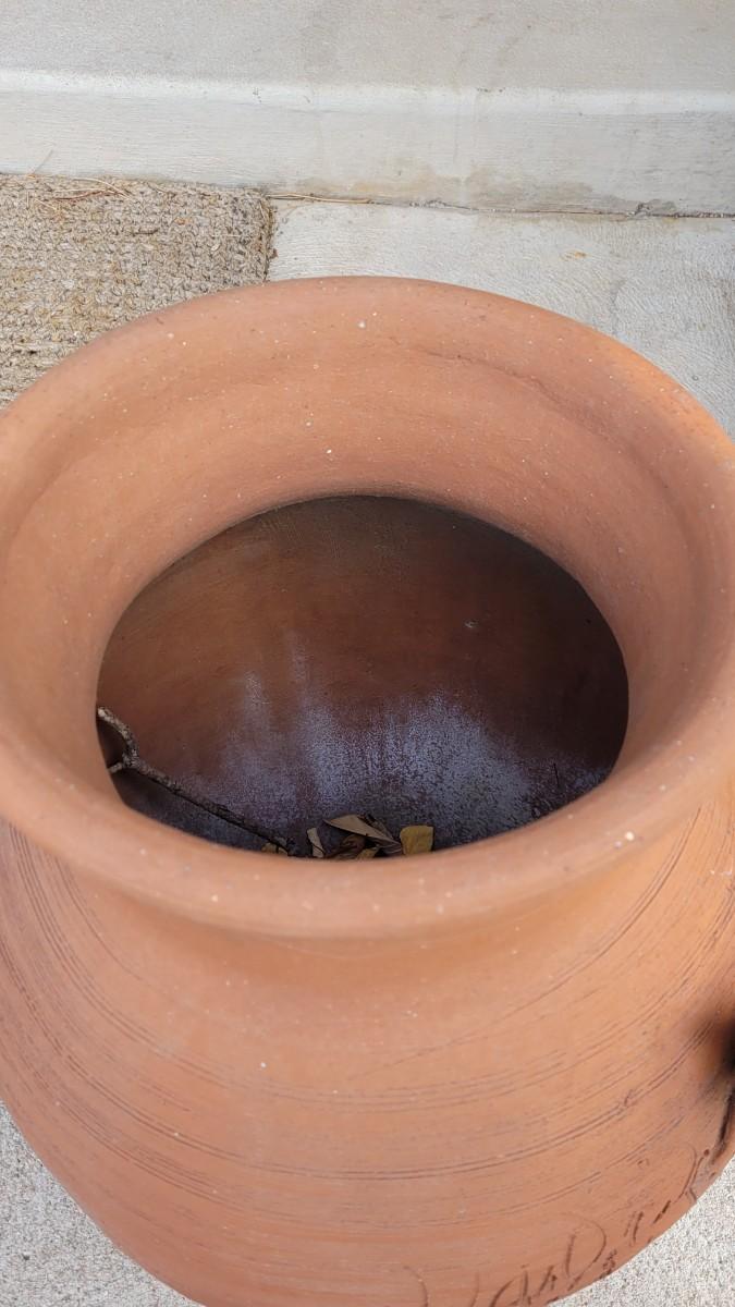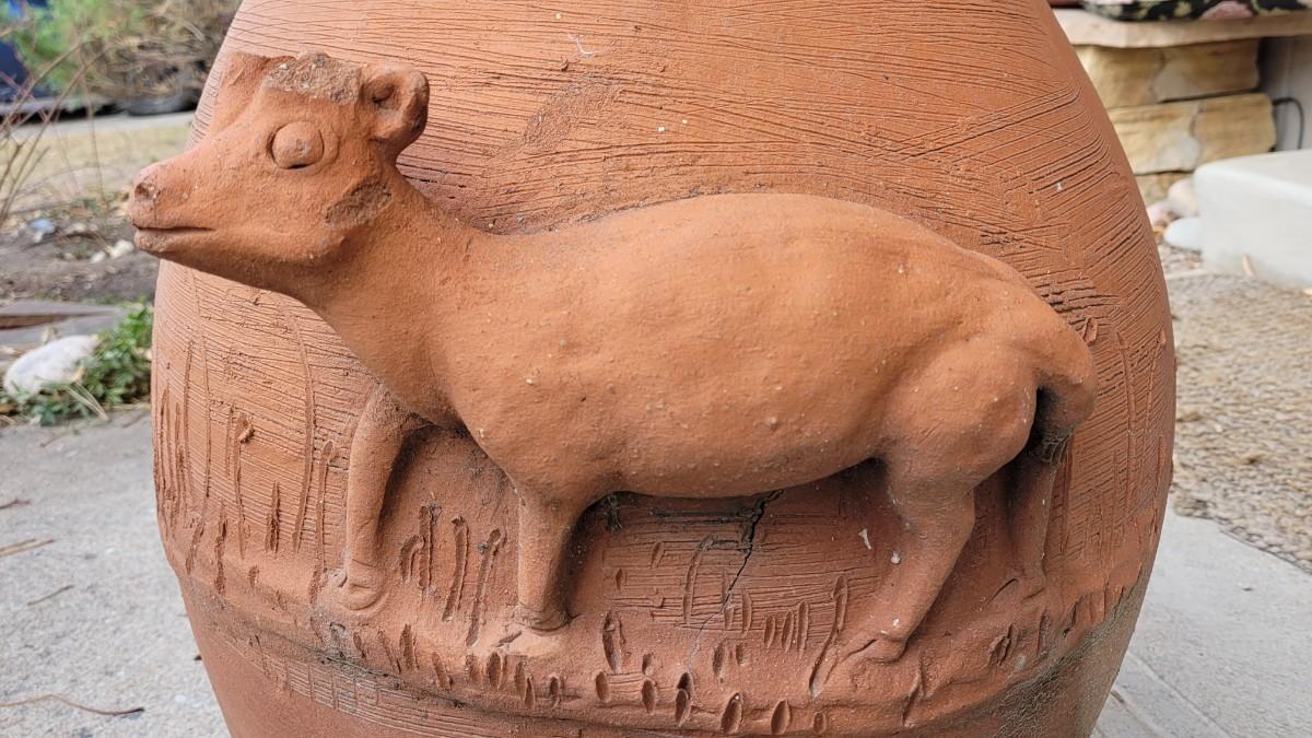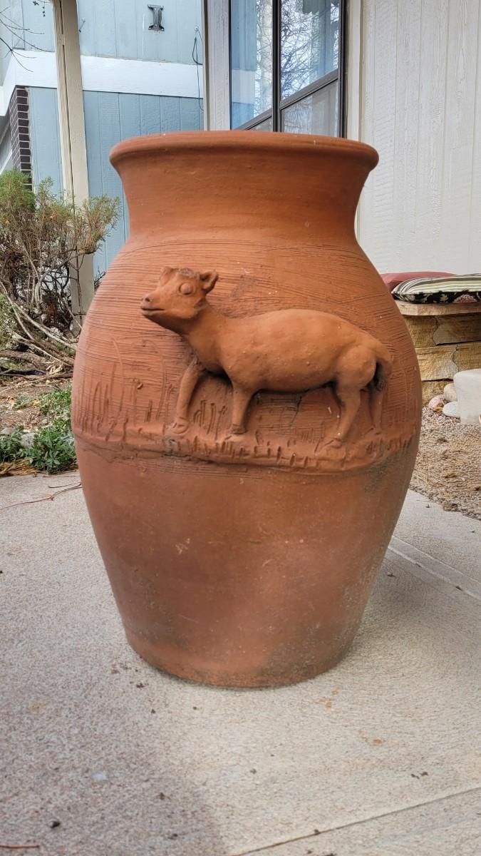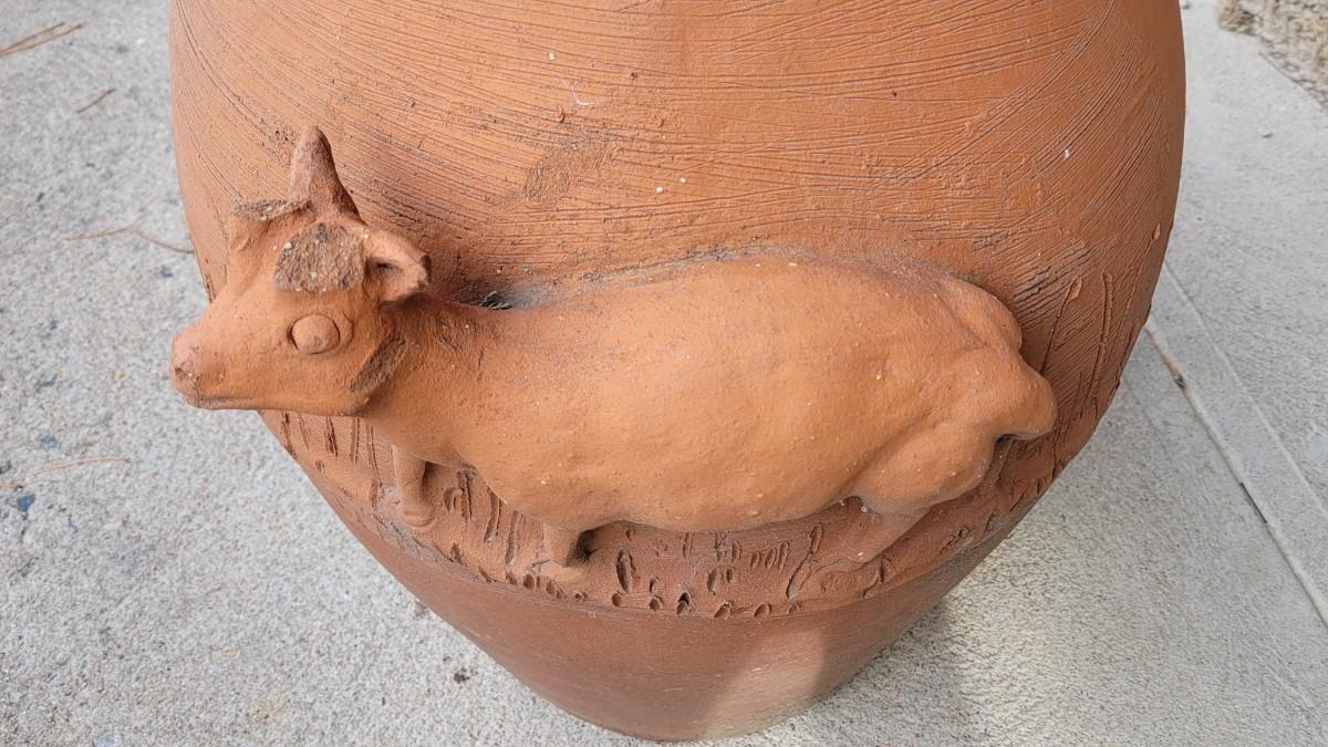 Lot 201: Vintage Large Terracotta Vase with a Cow