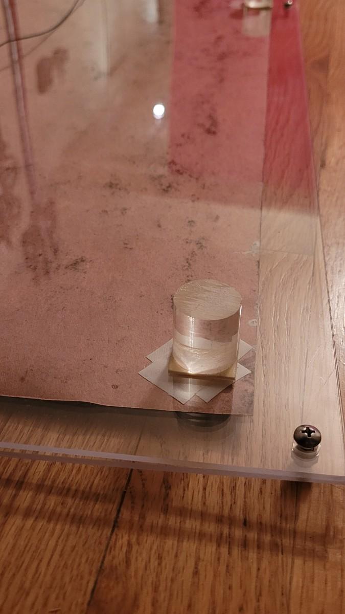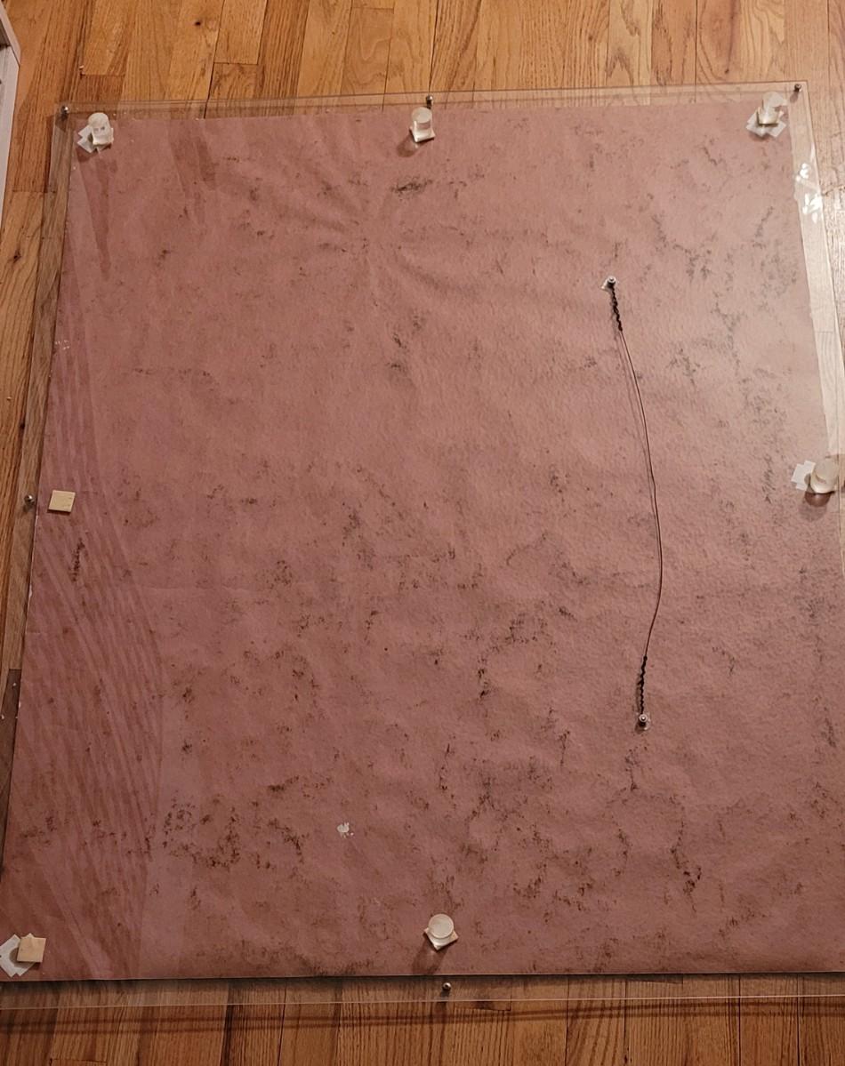 This piece is suspended in a plexiglass frame. The frame has plexiglass pegs to stabilize the piece when hanging on the wall.